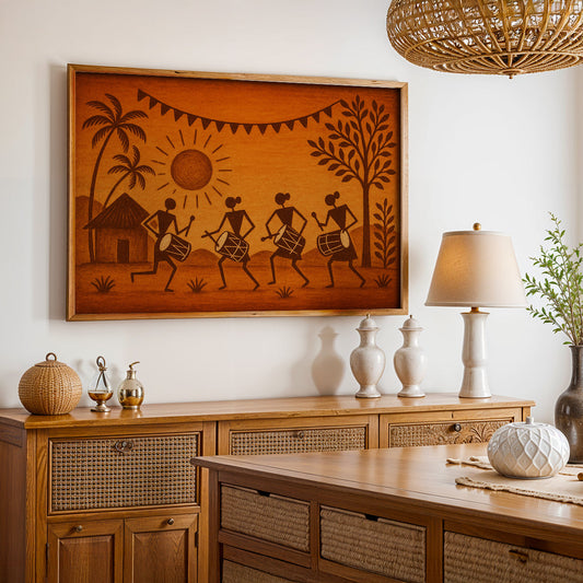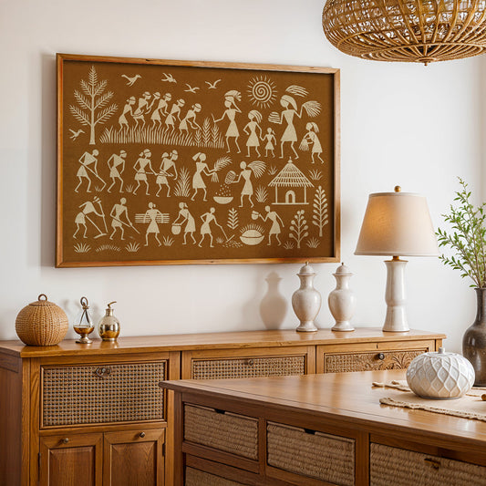 Warli art is a traditional Indian tribal painting style known for its distinctive stick-figure drawings and symbolic representations of village life, rituals, and nature. Our collection features premium, hand-sketched Warli artworks created to bring authentic tribal minimalism to luxury interiors.
