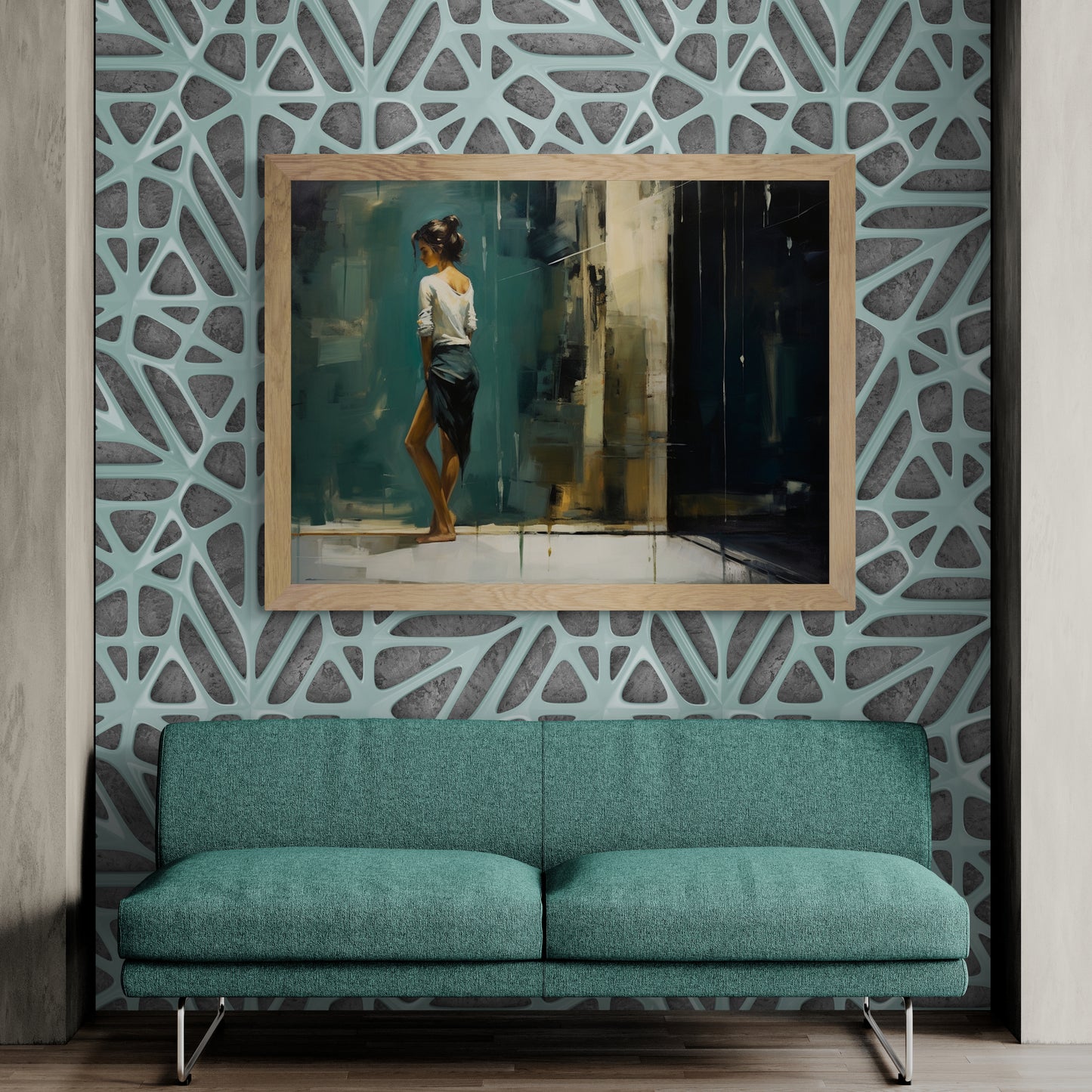 A graceful lady stands with her back turned towards the viewer, her silhouette a study in elegance against the backdrop of a vibrant teal wall. The interplay of light and shadow creates a sense of intrigue, inviting viewers to contemplate the enigmatic figure and the stories she holds within. With each glance, new details emerge, sparking the imagination and stirring the soul.
