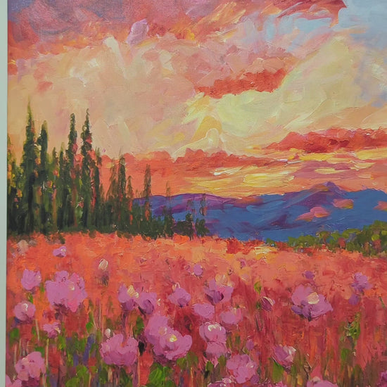 A vibrant field of blossoms under a dramatic, color-swept sky—romantic, energising, and full of movement. Bold brushstrokes in coral, pinks, and violets bring a warmth that instantly uplifts the space. Perfect for bedrooms, dining walls, creative studios, and bright contemporary decor.