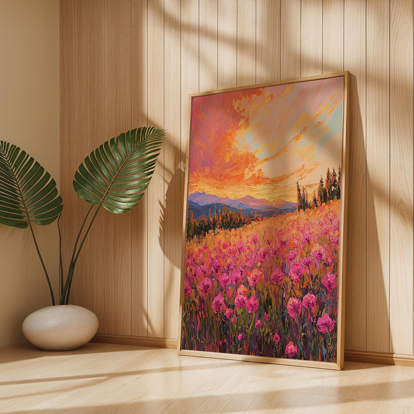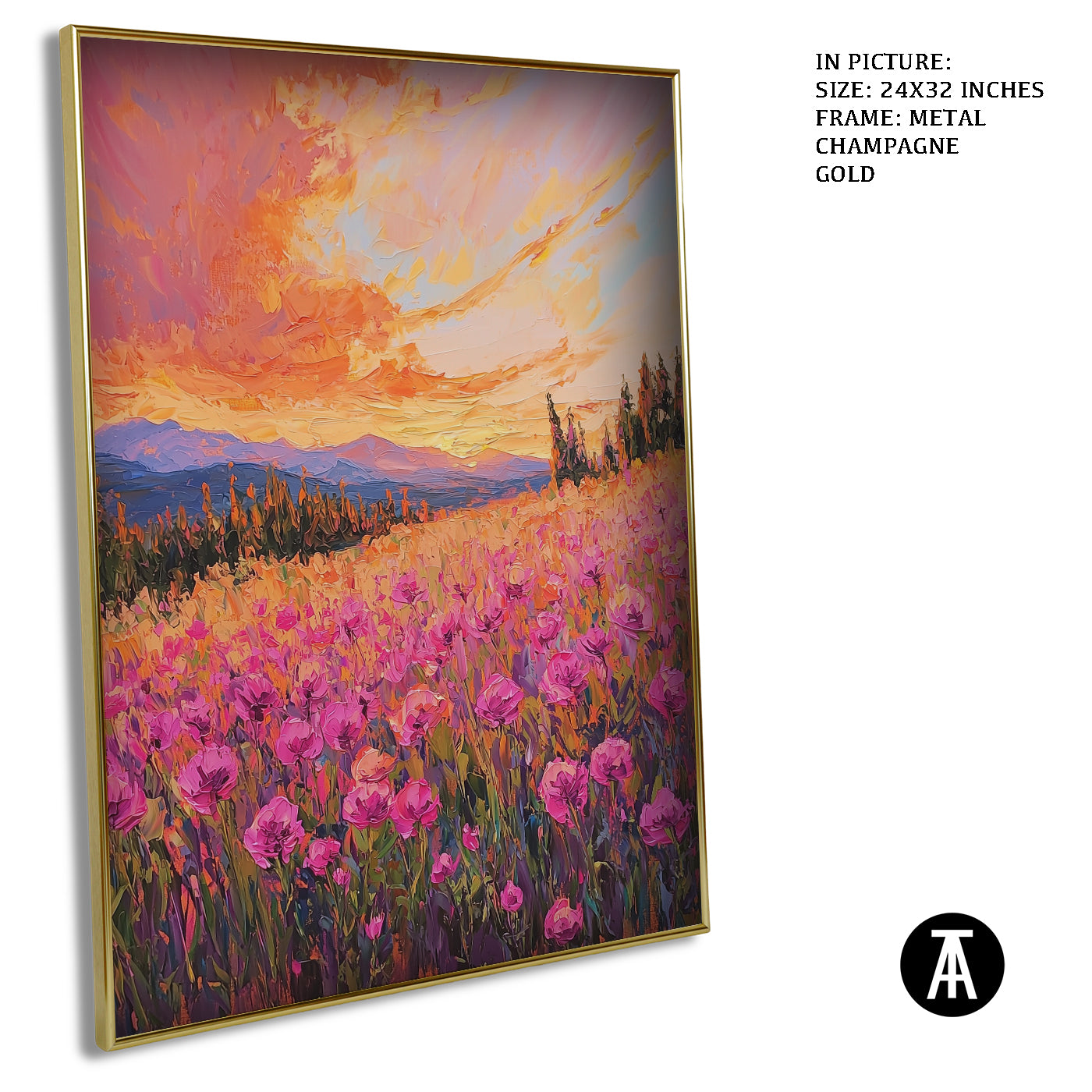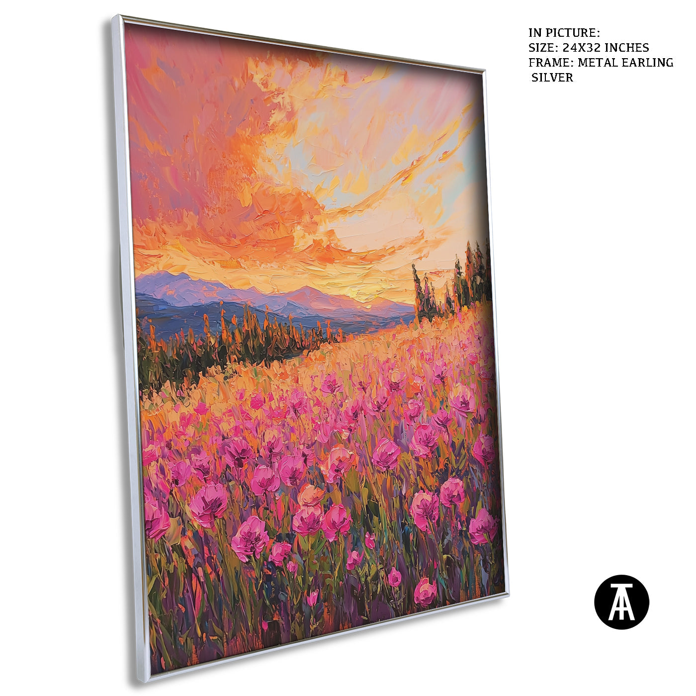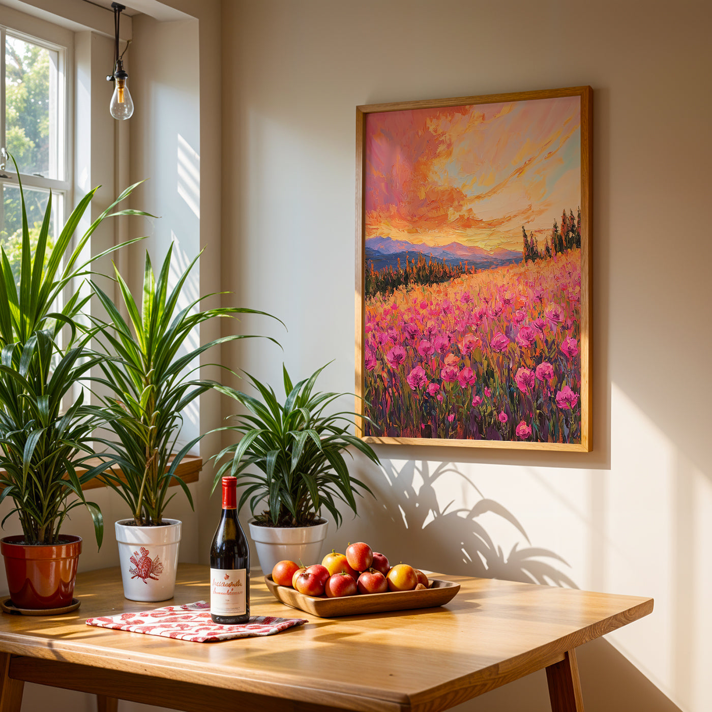 Enjoy the peaceful beauty of a pink sunrise with this artwork. The soft pink colors fill the sky, making it a perfect way to start your day. This piece shows the calm and quiet of the morning. It brings warmth and a positive feeling to your room. A great way to brighten up your space with a gentle touch of nature.