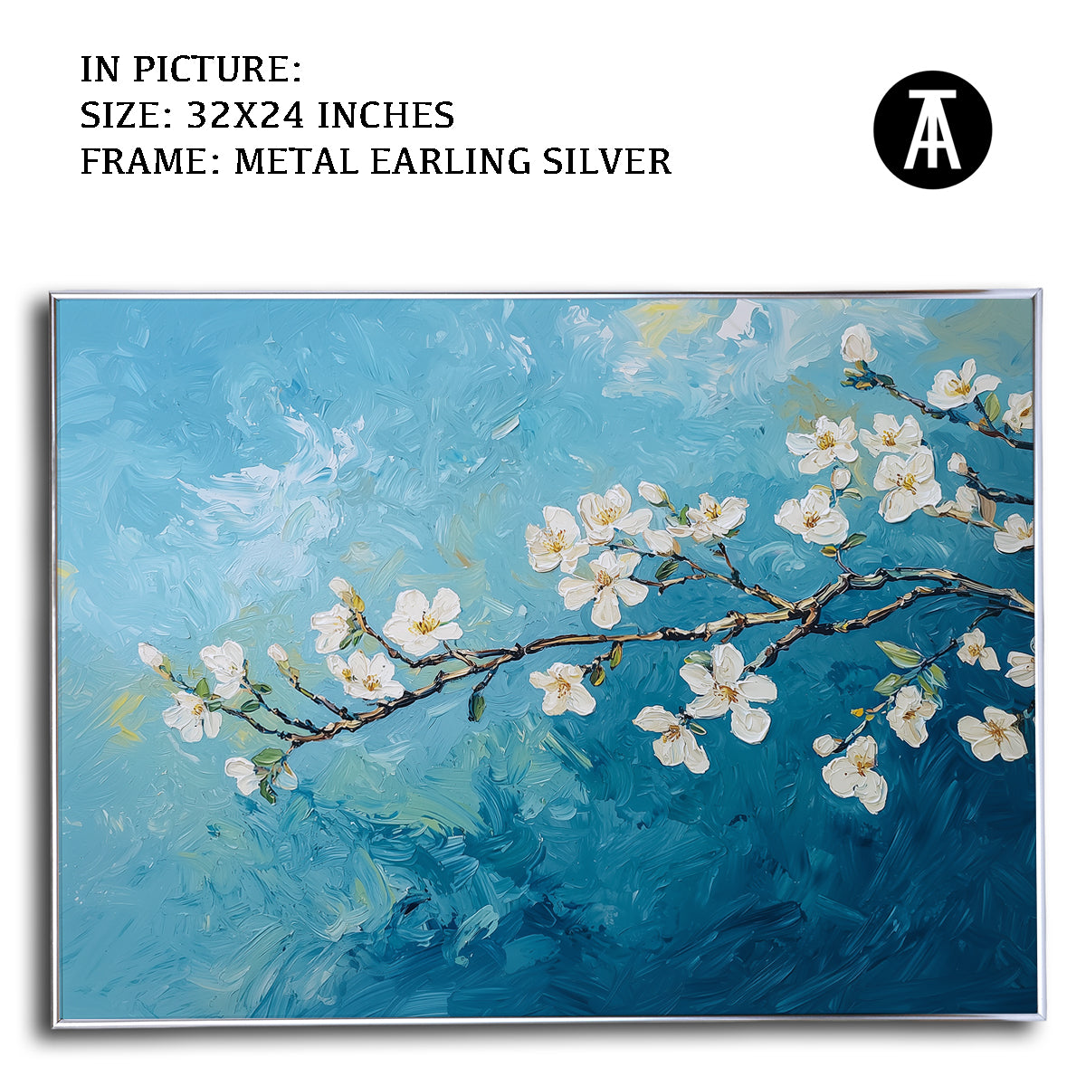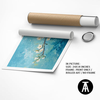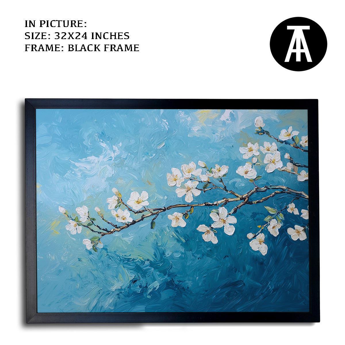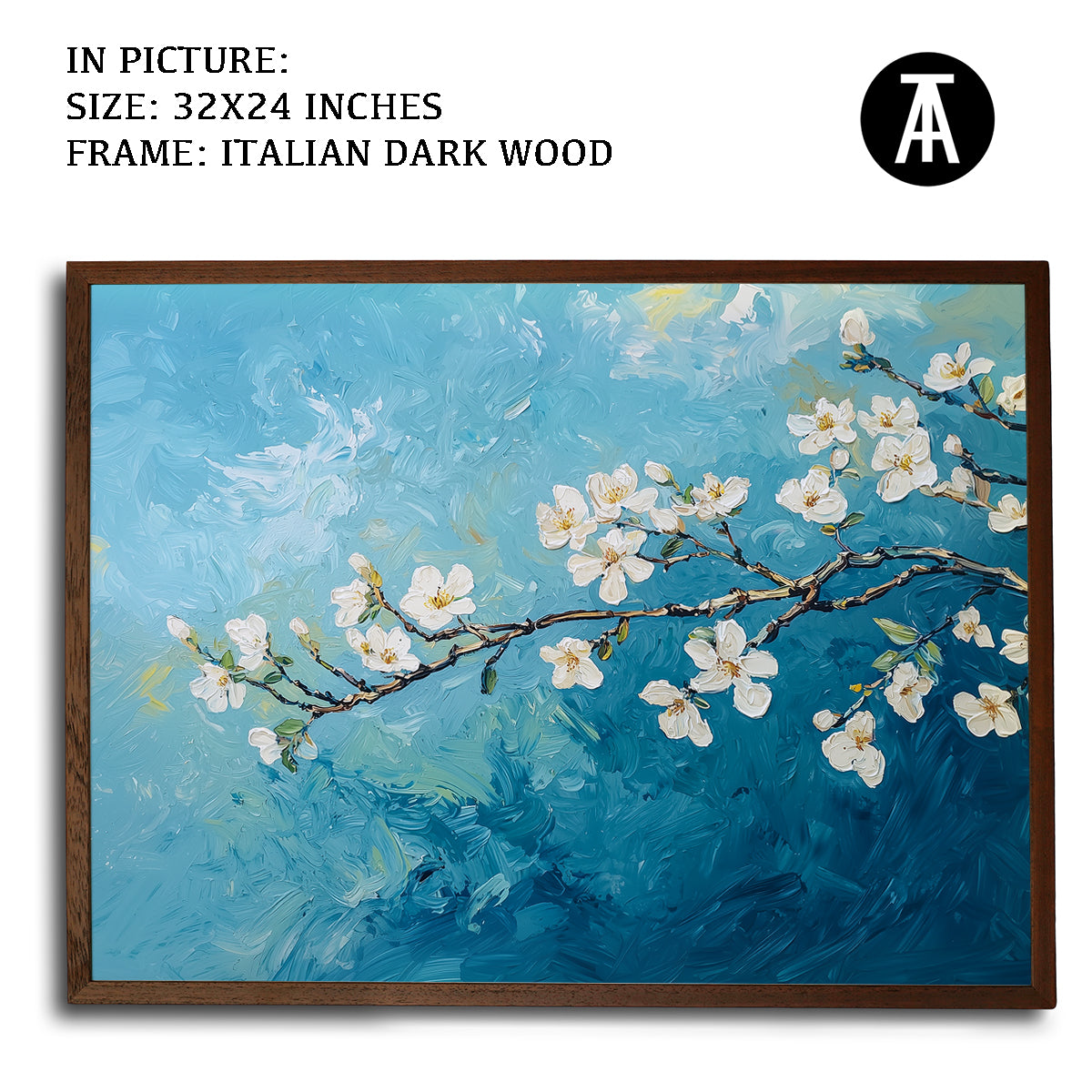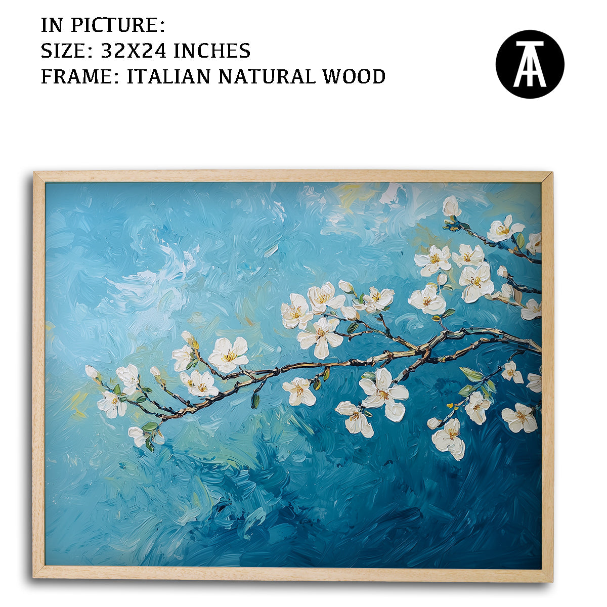 This artwork shows almond blossoms reaching up to the blue sky. The white flowers look fresh and bright against the clear sky. It captures the simple beauty of springtime. This piece can bring a fresh, peaceful feeling to any room. Perfect for adding a bit of nature’s beauty to your space.