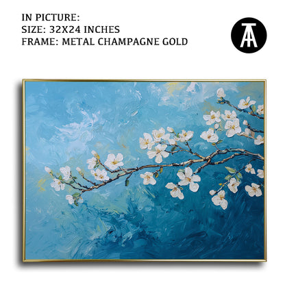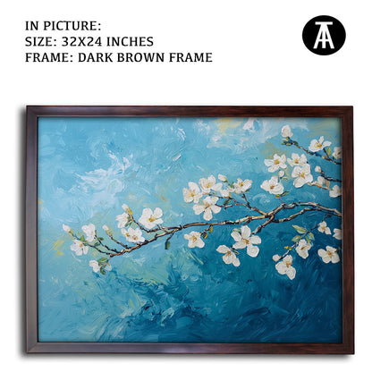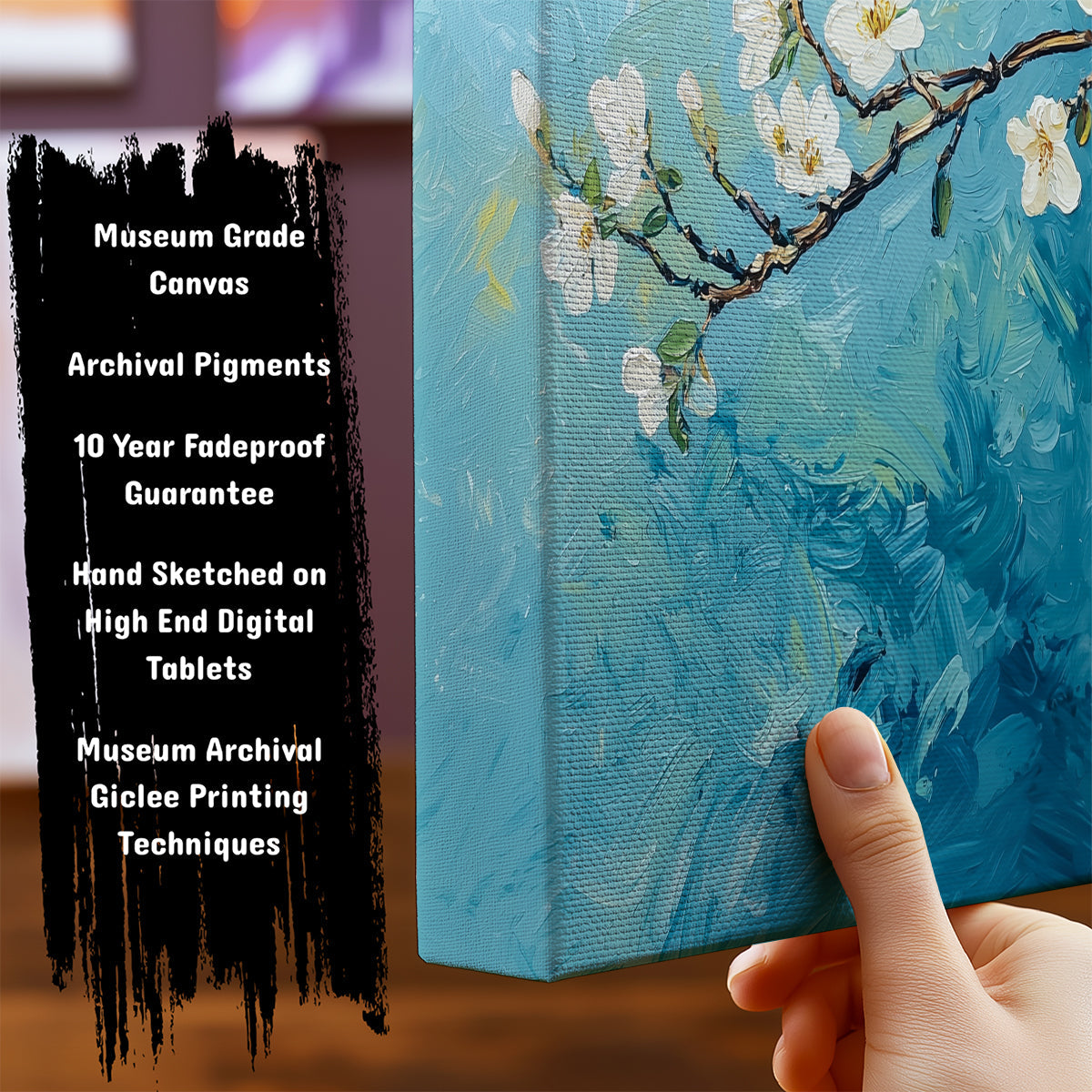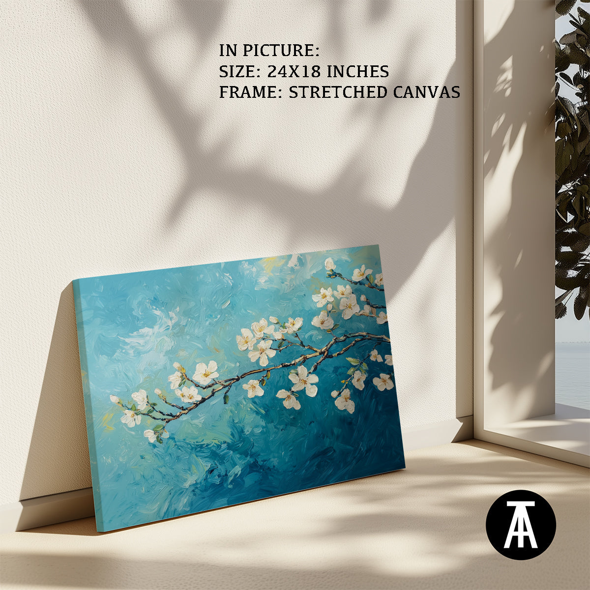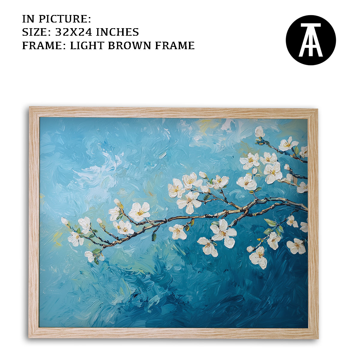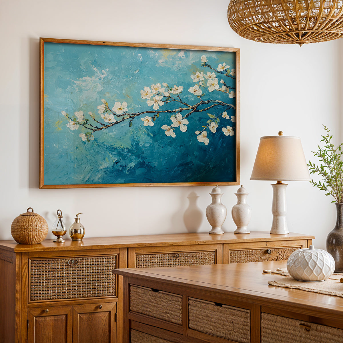 This artwork shows almond blossoms reaching up to the blue sky. The white flowers look fresh and bright against the clear sky. It captures the simple beauty of springtime. This piece can bring a fresh, peaceful feeling to any room. Perfect for adding a bit of nature’s beauty to your space.