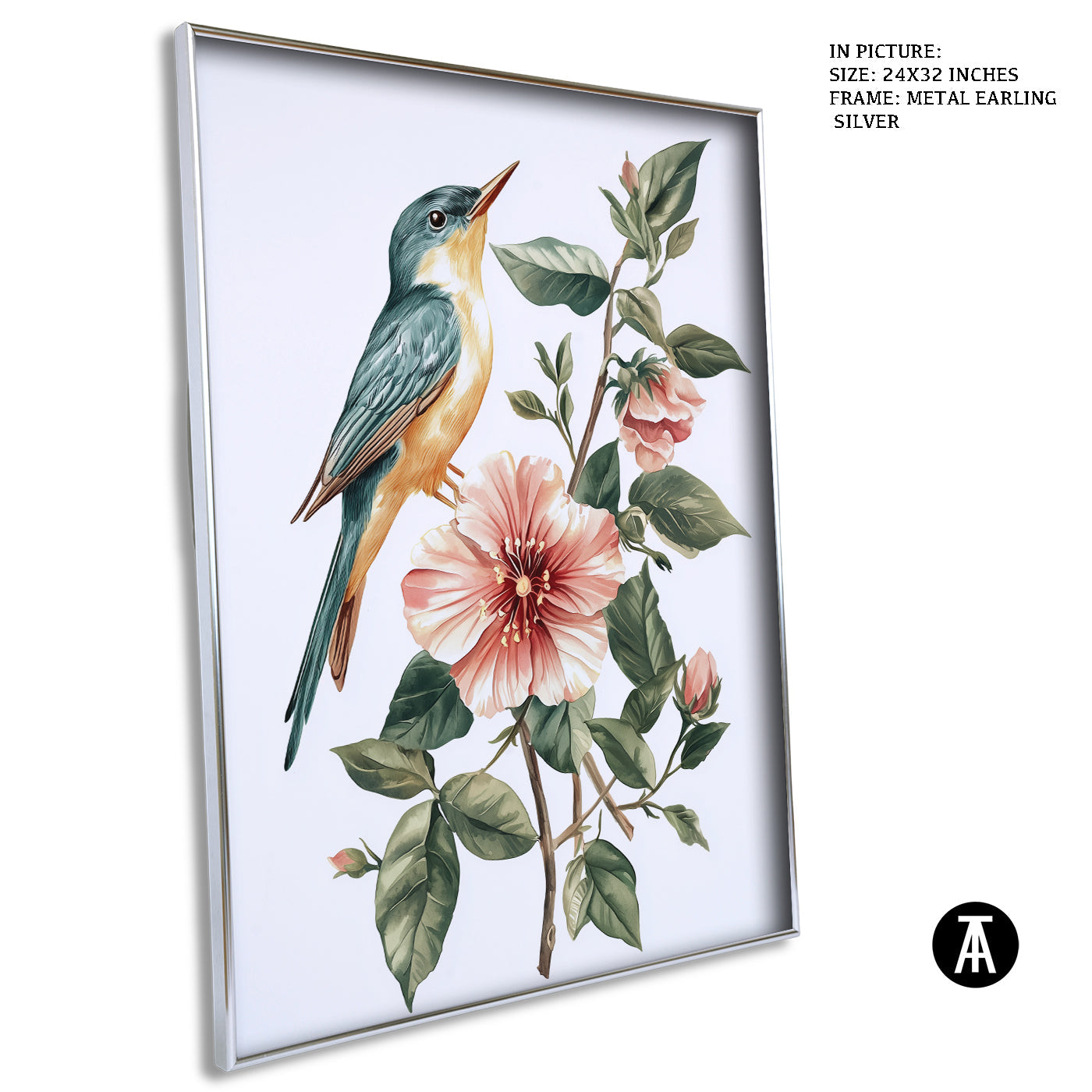 This artwork shows a small bird sitting on a pink flower. It’s a simple and beautiful moment from nature. The soft colors make it calm and relaxing to look at. This piece is great for adding a touch of nature to your home. It’s perfect for anyone who loves the quiet beauty of birds and flowers.