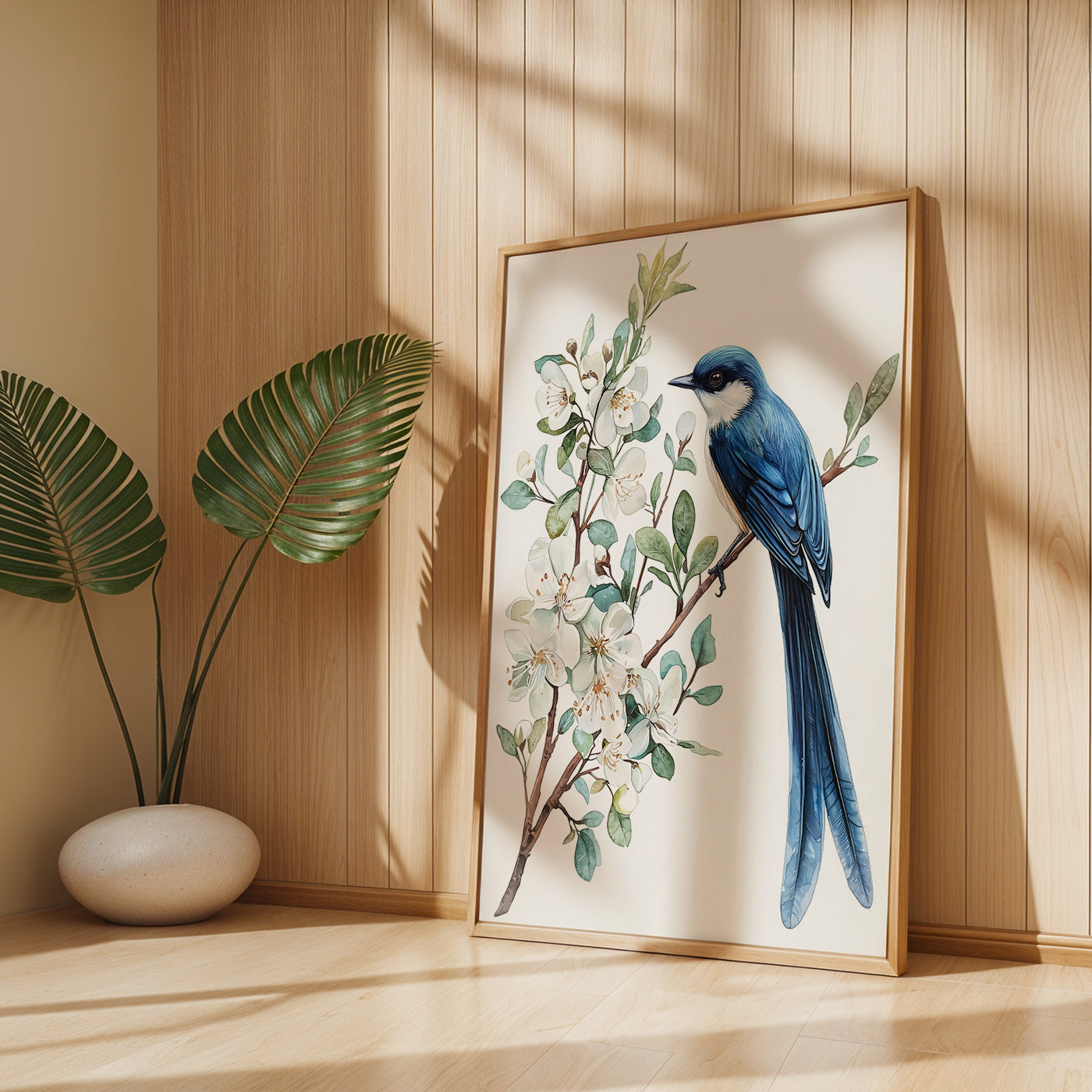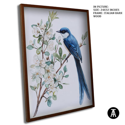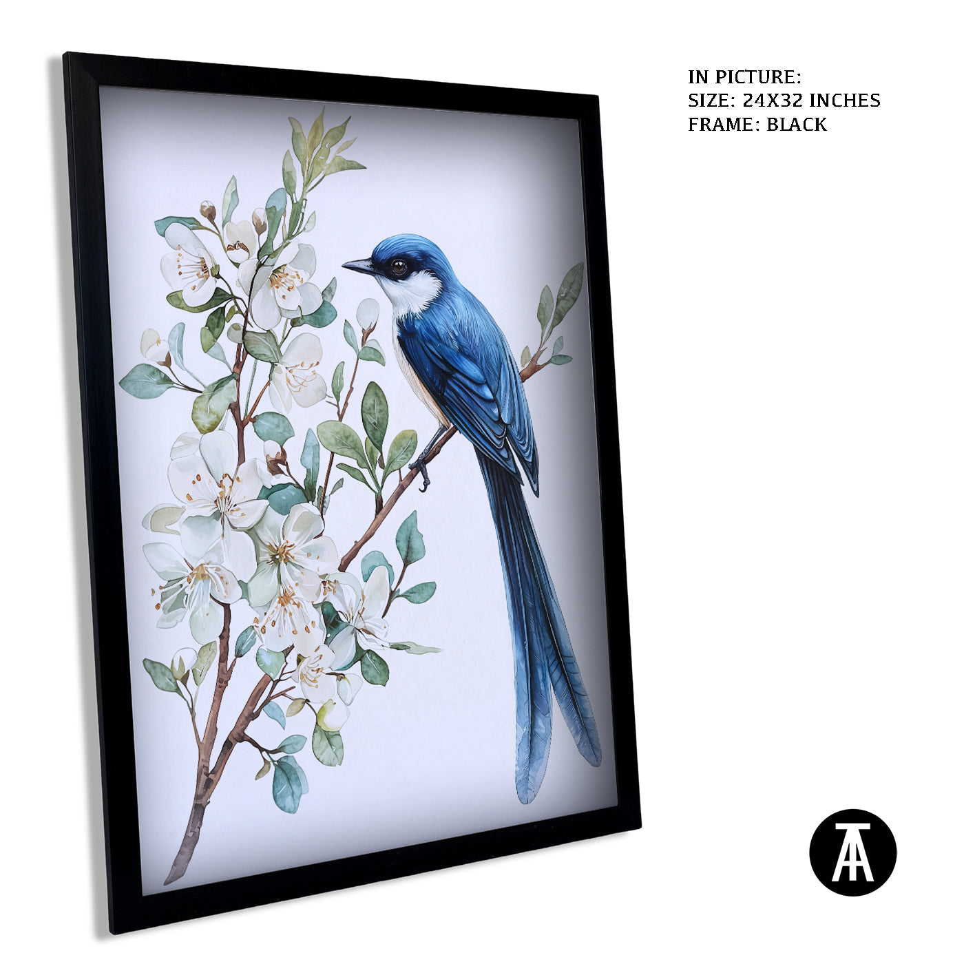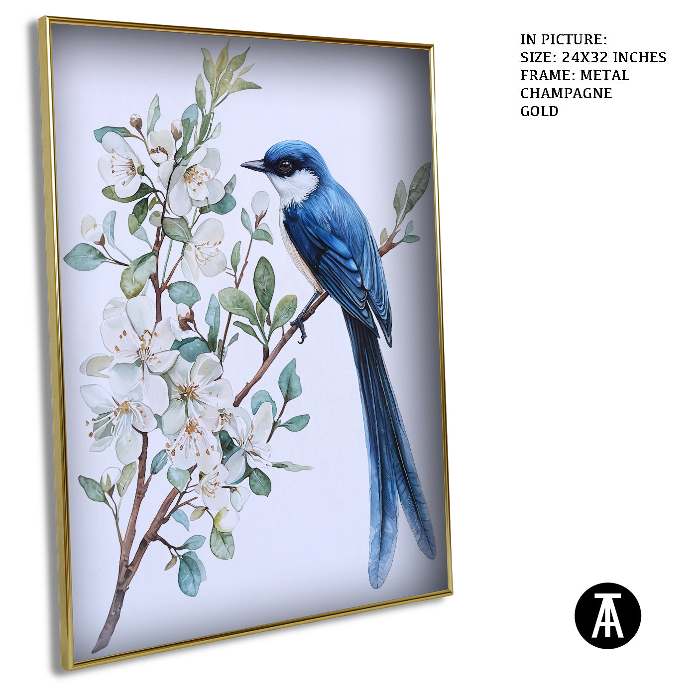 A blue bird sits quietly on a branch in this peaceful artwork. The simple scene shows the beauty of nature. The soft colors make it a calm and nice piece to have in your room. It’s great for adding a bit of nature’s charm to your home. A lovely way to enjoy the beauty of birds.
