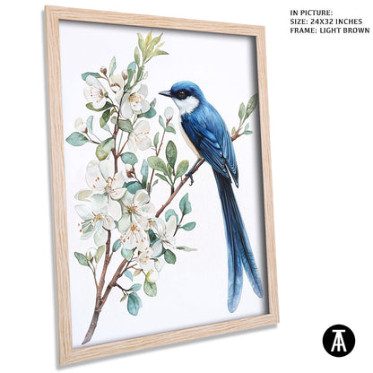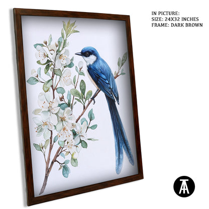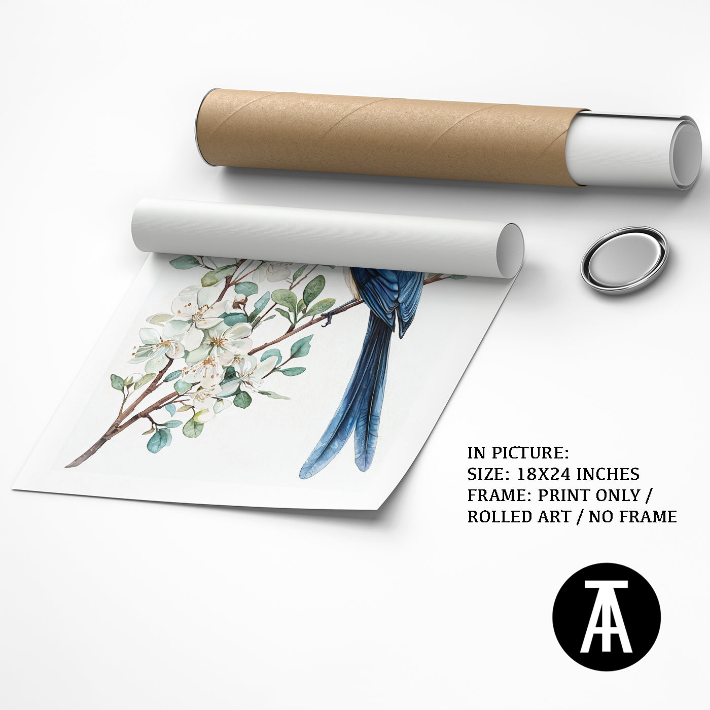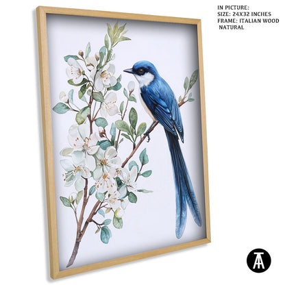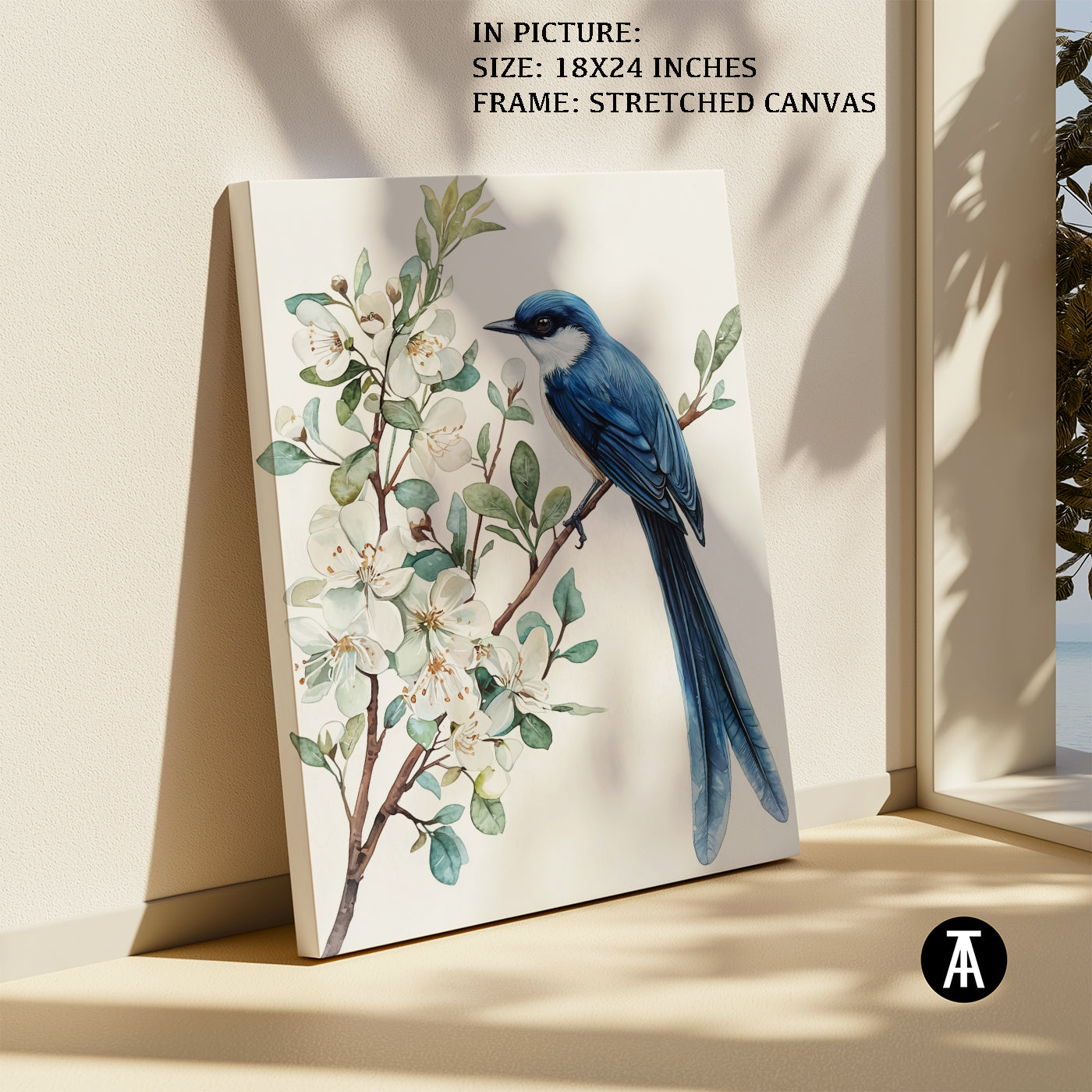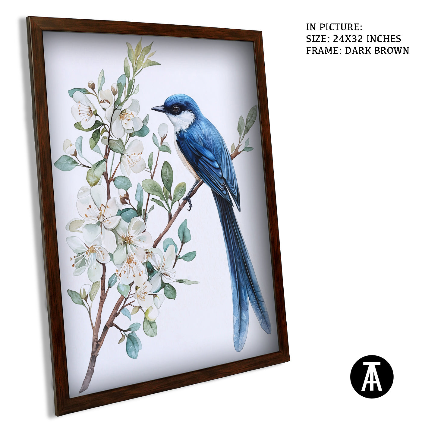 A blue bird sits quietly on a branch in this peaceful artwork. The simple scene shows the beauty of nature. The soft colors make it a calm and nice piece to have in your room. It’s great for adding a bit of nature’s charm to your home. A lovely way to enjoy the beauty of birds.