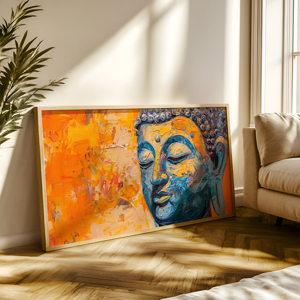 Bring a touch of peace and serenity to your home with this stunning abstract depiction of Gautam Buddha. Rendered in calming shades of blue, this piece is a beautiful reminder of inner peace and mindfulness. Available as a framed art print, this makes a perfect addition to your living room, bedroom, or meditation space.