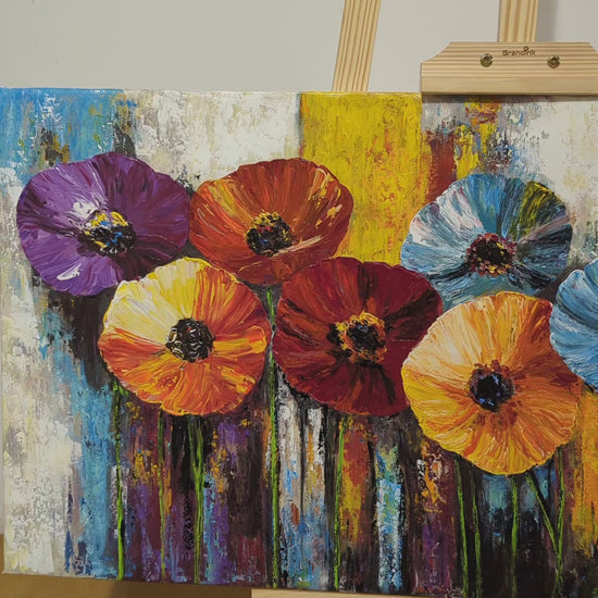 A vibrant row of bold blossoms in jewel tones with expressive brushwork—playful, modern, and high-energy. The textured petals and vertical drips give it a contemporary gallery feel with strong color impact. Perfect for dining walls, creative offices, modern living rooms, and statement corridors.