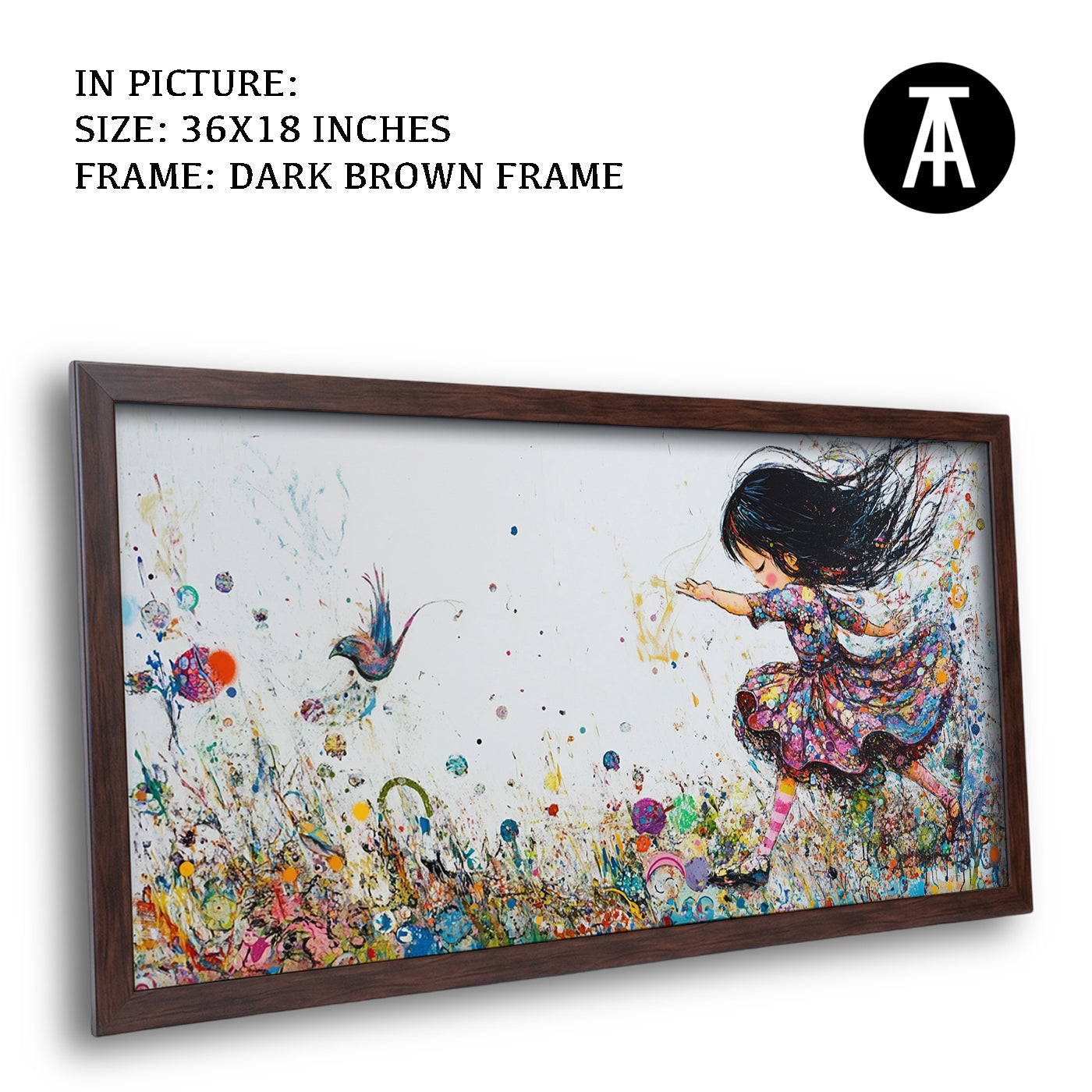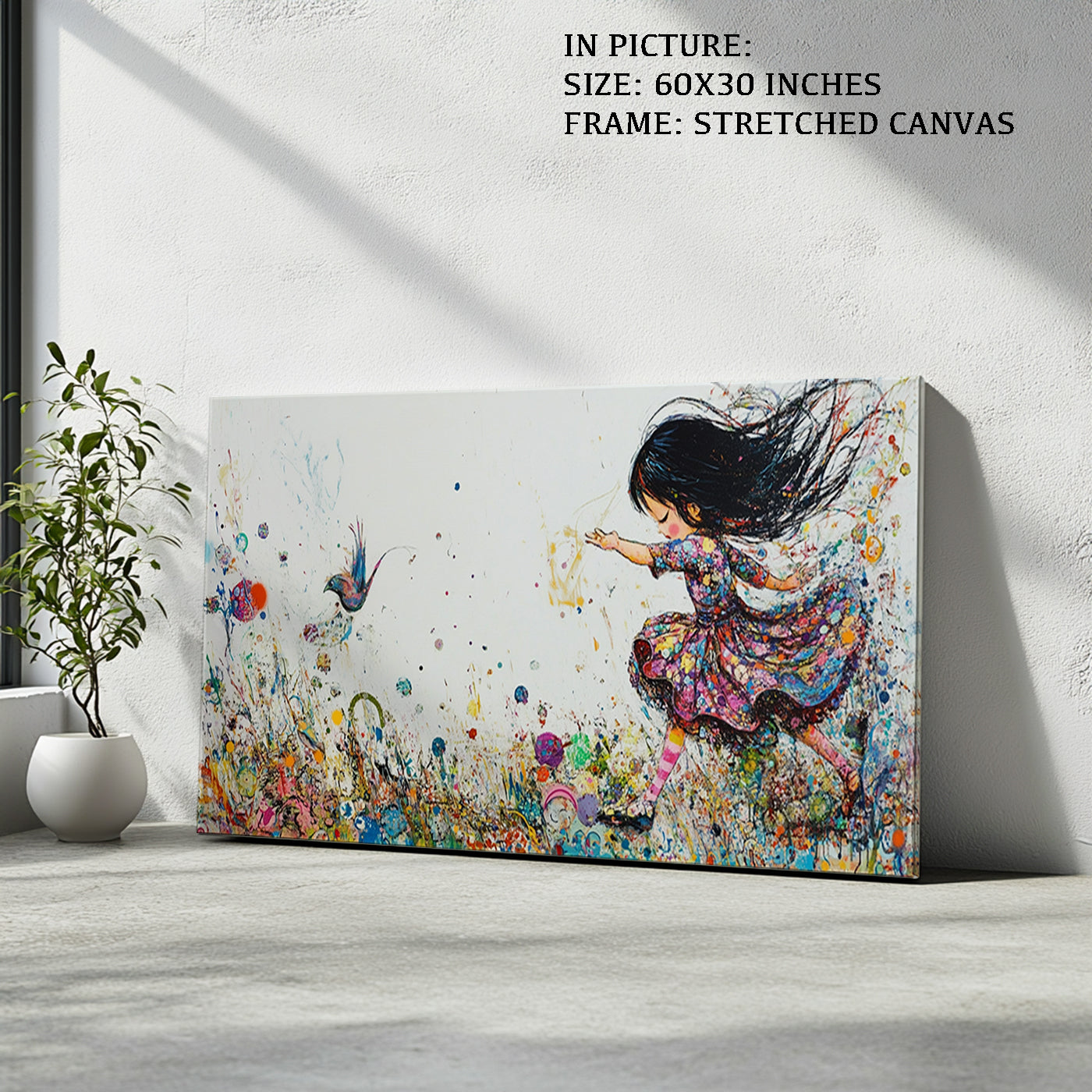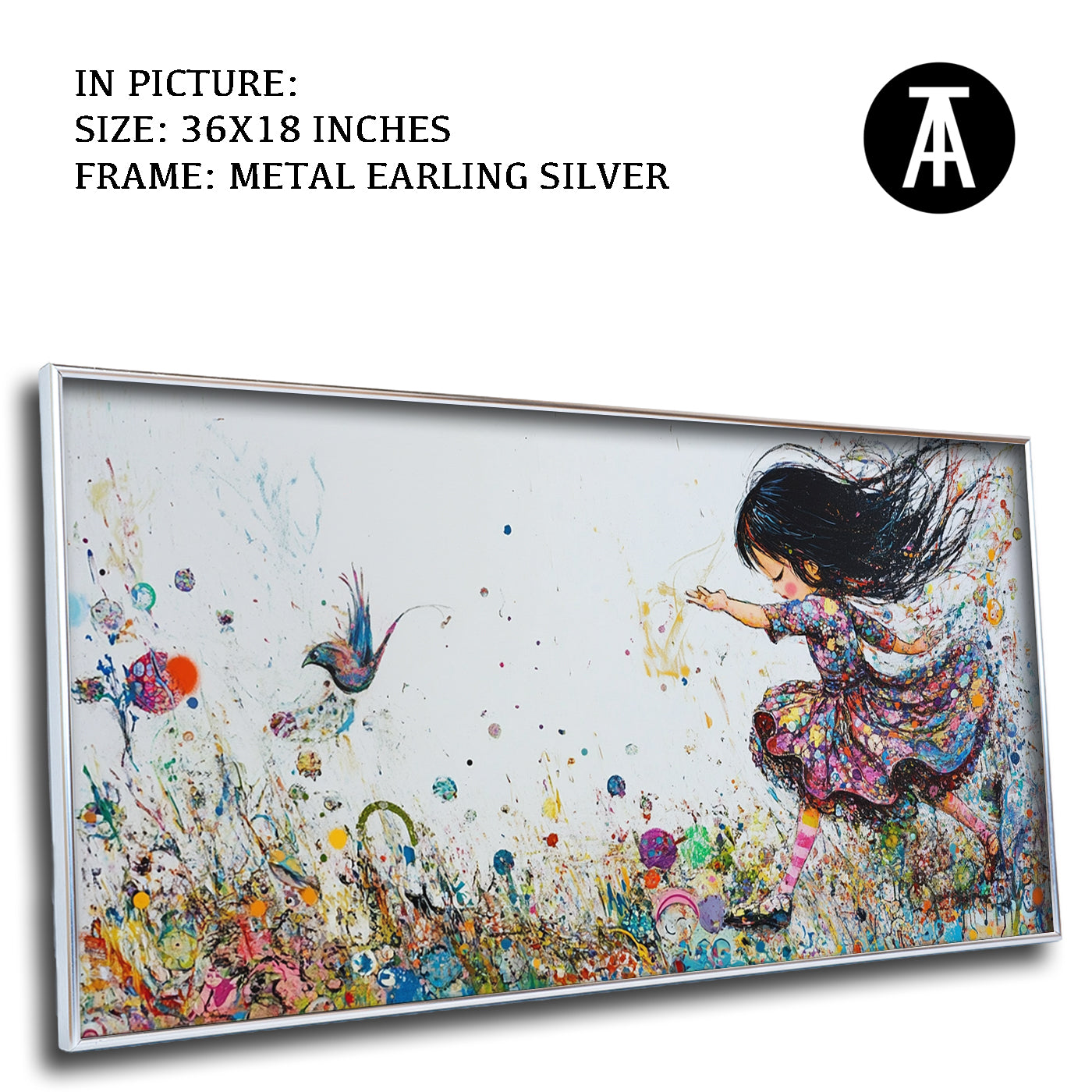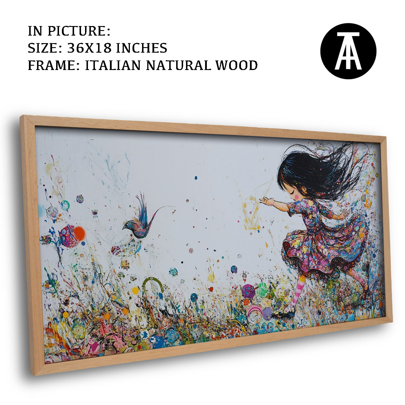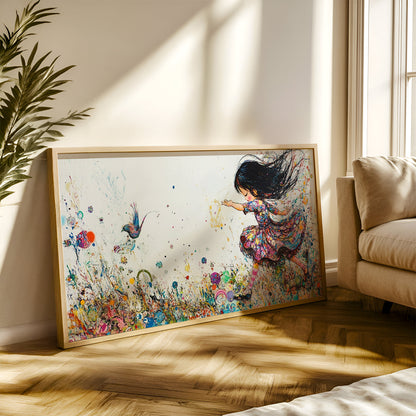 This vibrant, abstract painting by Pompidou Moderne is a burst of color and energy. A young girl, filled with wonder and curiosity, chases butterflies through a field of wildflowers. The playful shapes and dynamic brushstrokes evoke a sense of freedom and exploration. Perfect for adding a touch of nature and childhood innocence to any living room, this piece is sure to spark conversation and inspire a sense of wonder.