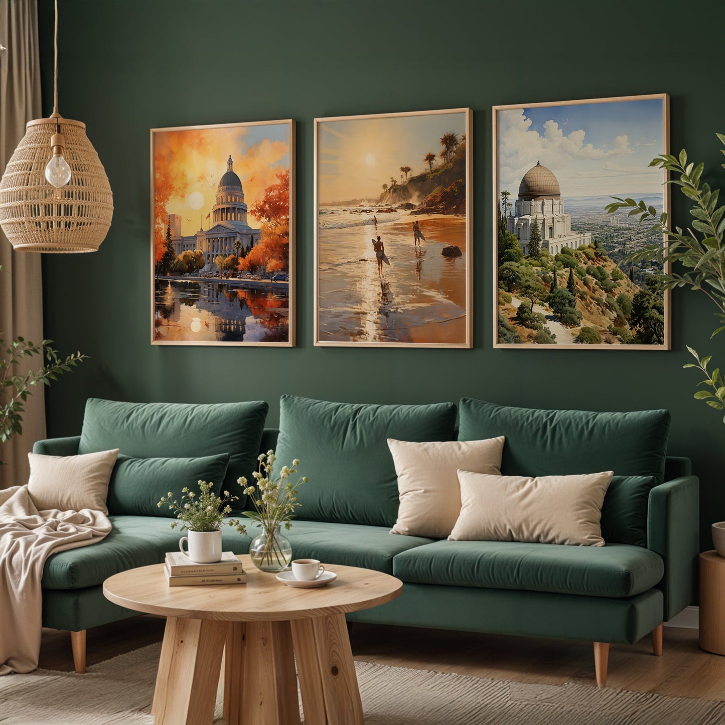 Transform your space with this premium art set featuring 3 stunning scenes: Griffith Observatory, Capitol Building Sunrise, and Surf Day by the Beach. Perfect for luxury homes, this gallery wall art brings a laid-back coastal vibe to any room, adding a touch of elegance to your home decor. This premium gallery set brings the perfect blend of elegance and coastal charm to your home, creating a laid-back yet sophisticated vibe. Whether you’re looking to add a touch of luxury to your living room or elevate your office decor, these artworks will infuse your space with the serene beauty of California’s coastlines.