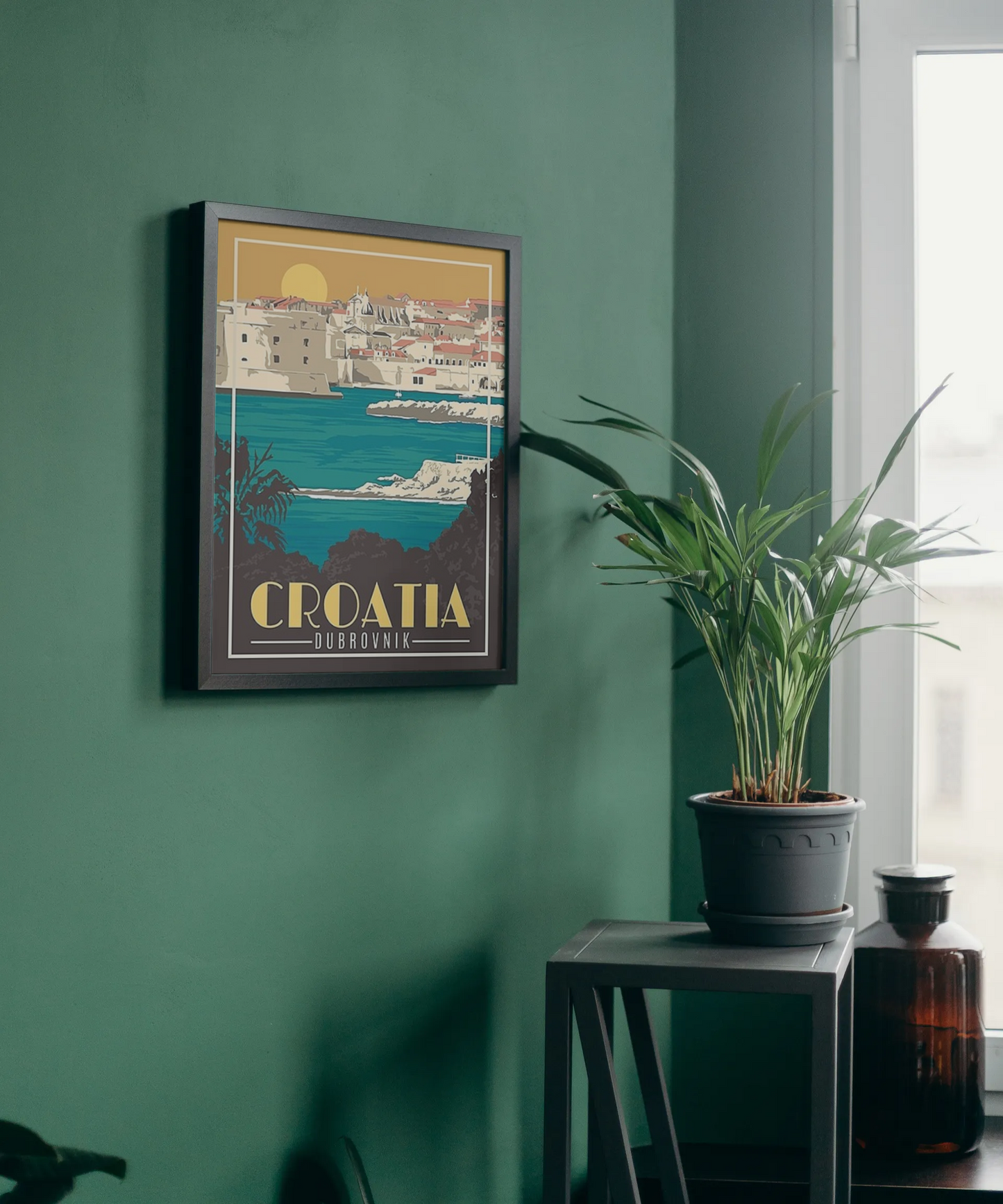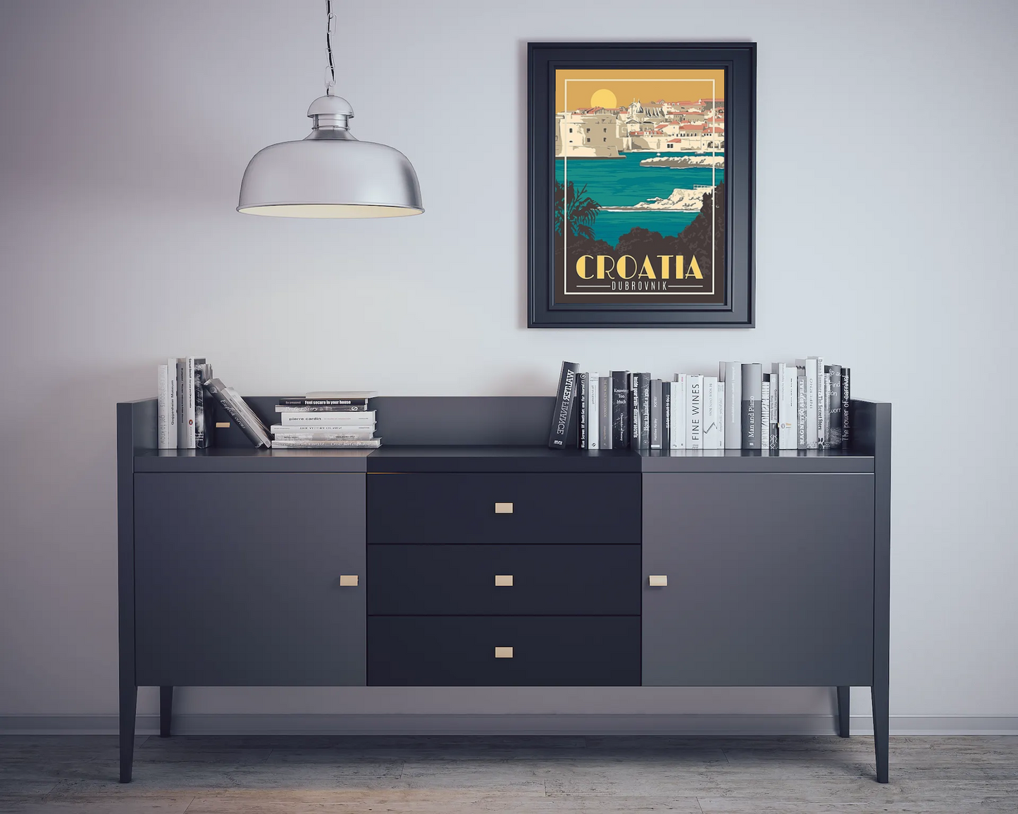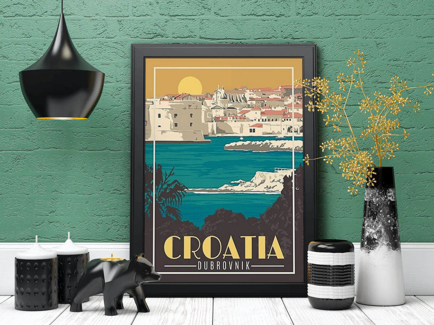 Immerse yourself in the enchanting beauty of Dubrovnik, Croatia, with our Vintage Dubrovnik Poster. This captivating artwork transports you to the historic walled city, showcasing its iconic redroofed buildings, charming streets, and breathtaking coastal views. A perfect choice for art collectors and travel enthusiasts, this vintage poster brings the allure and elegance of Dubrovnik's architectural wonders to your space, infusing it with a touch of Mediterranean charm and wanderlust.