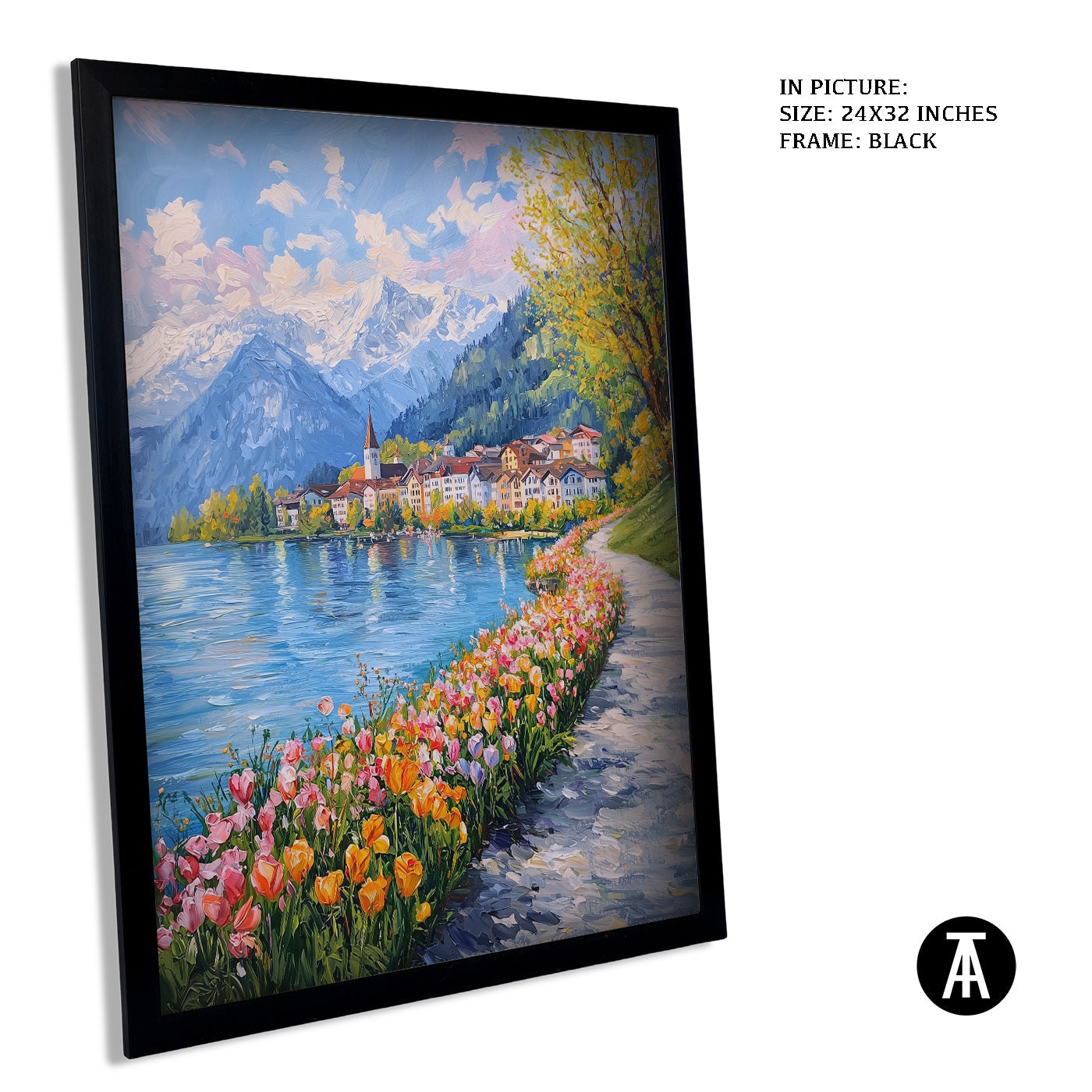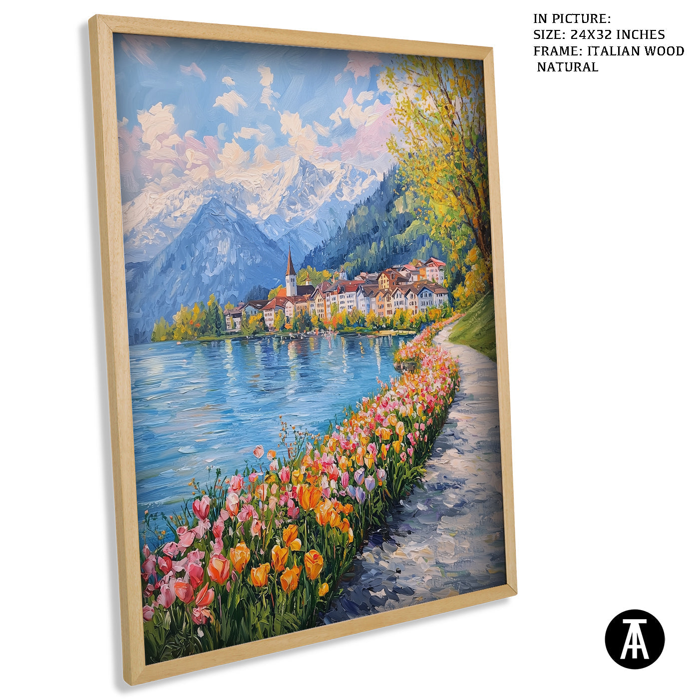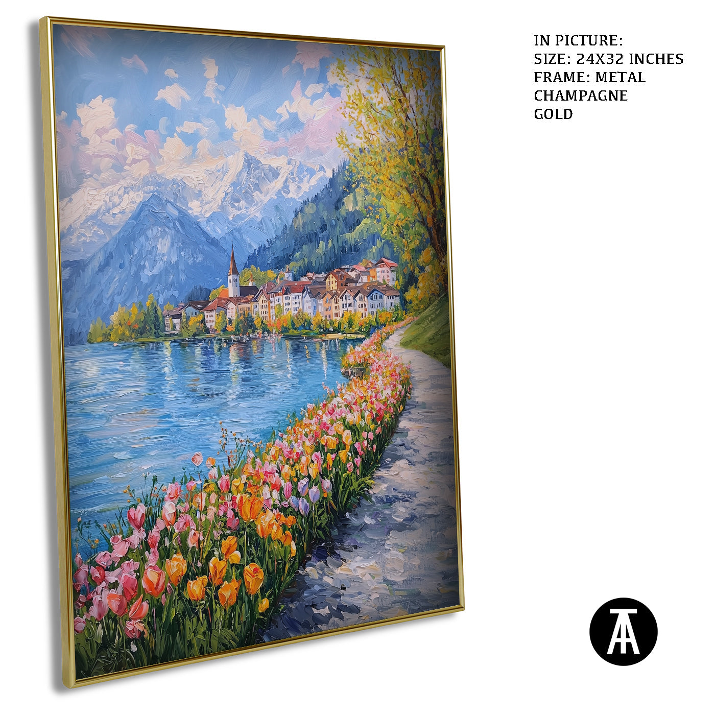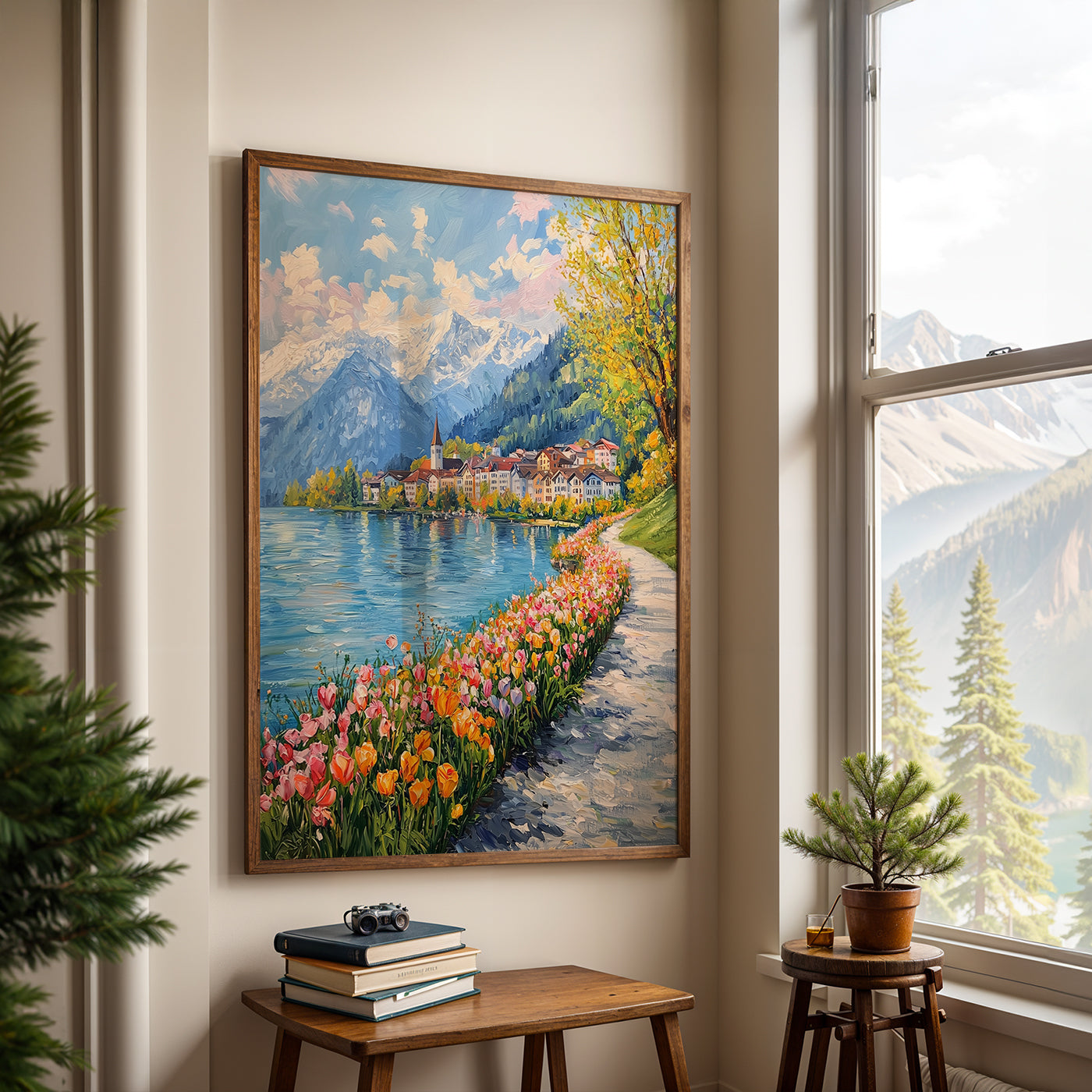 Bring the vibrant energy of Interlaken into your space with this artwork of colorful flower beds and a scenic city view. The painting captures the picturesque charm of this Swiss town, nestled between majestic Alpine peaks. Perfect as framed art for your living room, hallway, or study, this modern art piece adds a refreshing touch to your decor. Let this wall painting inspire moments of joy and connection with nature's beauty and urban elegance. A perfect addition for lovers of Swiss landscapes and bright, cheerful art.
