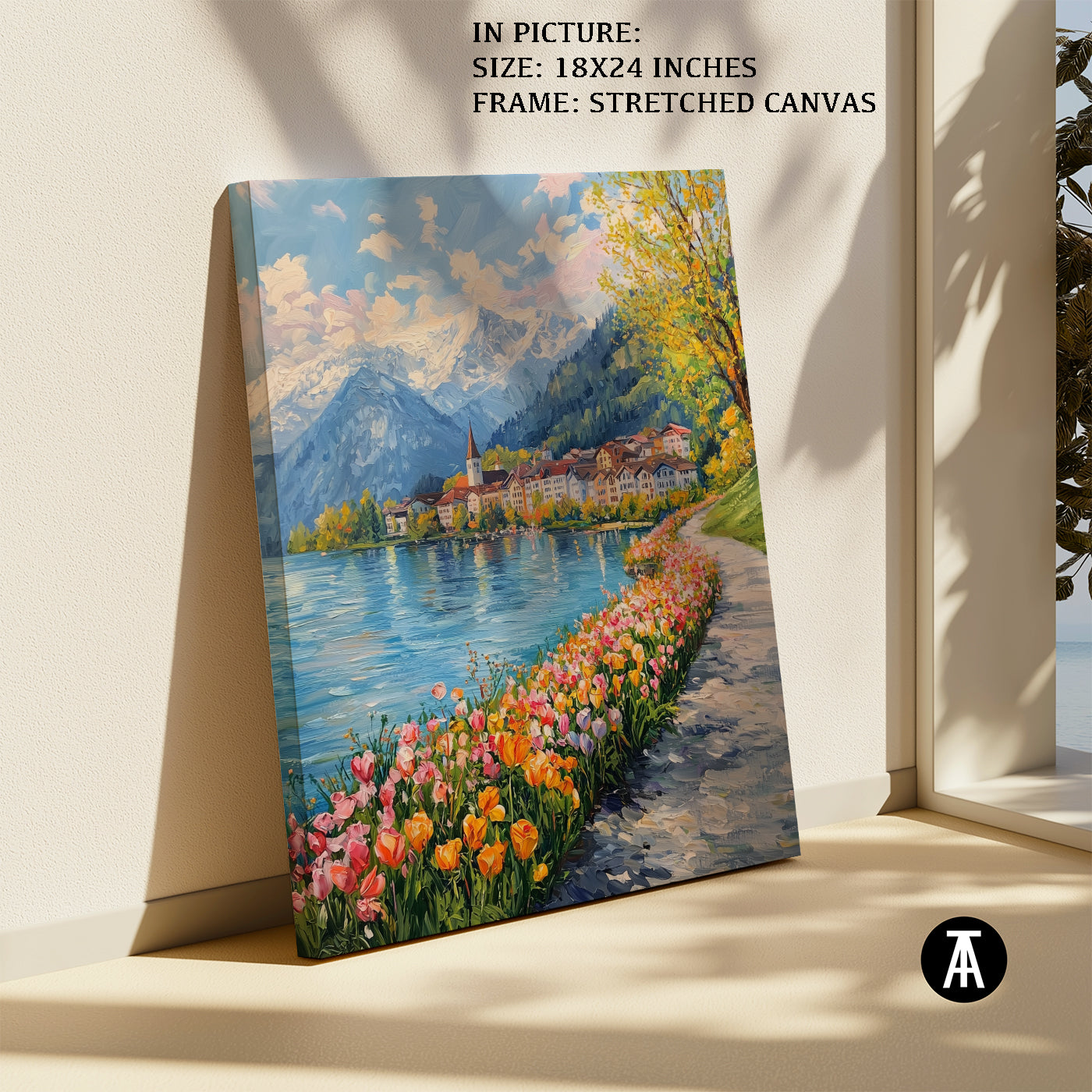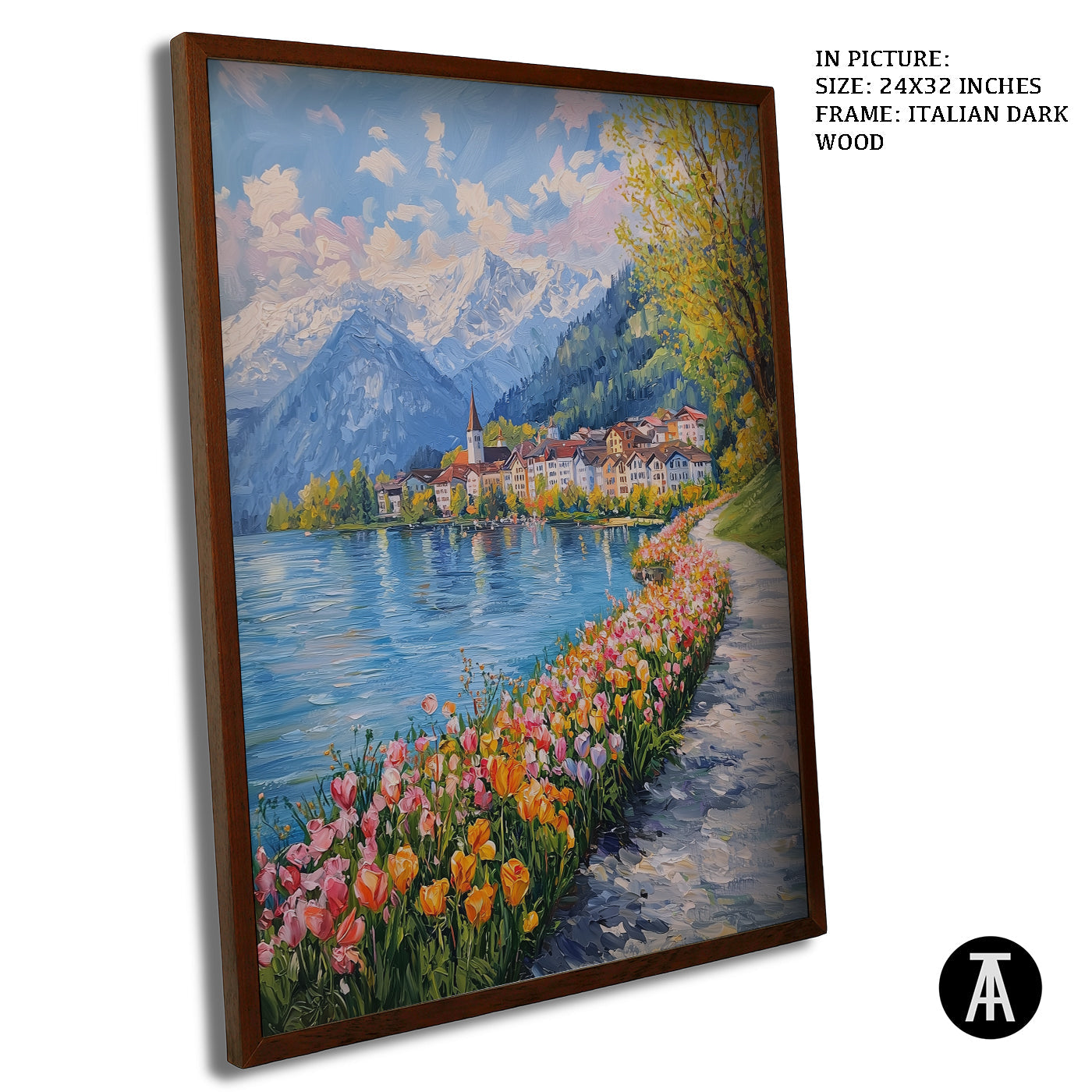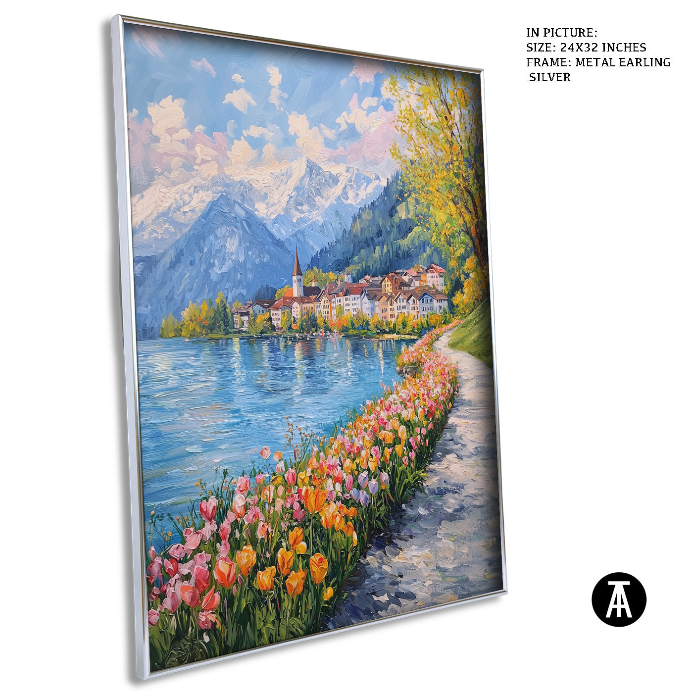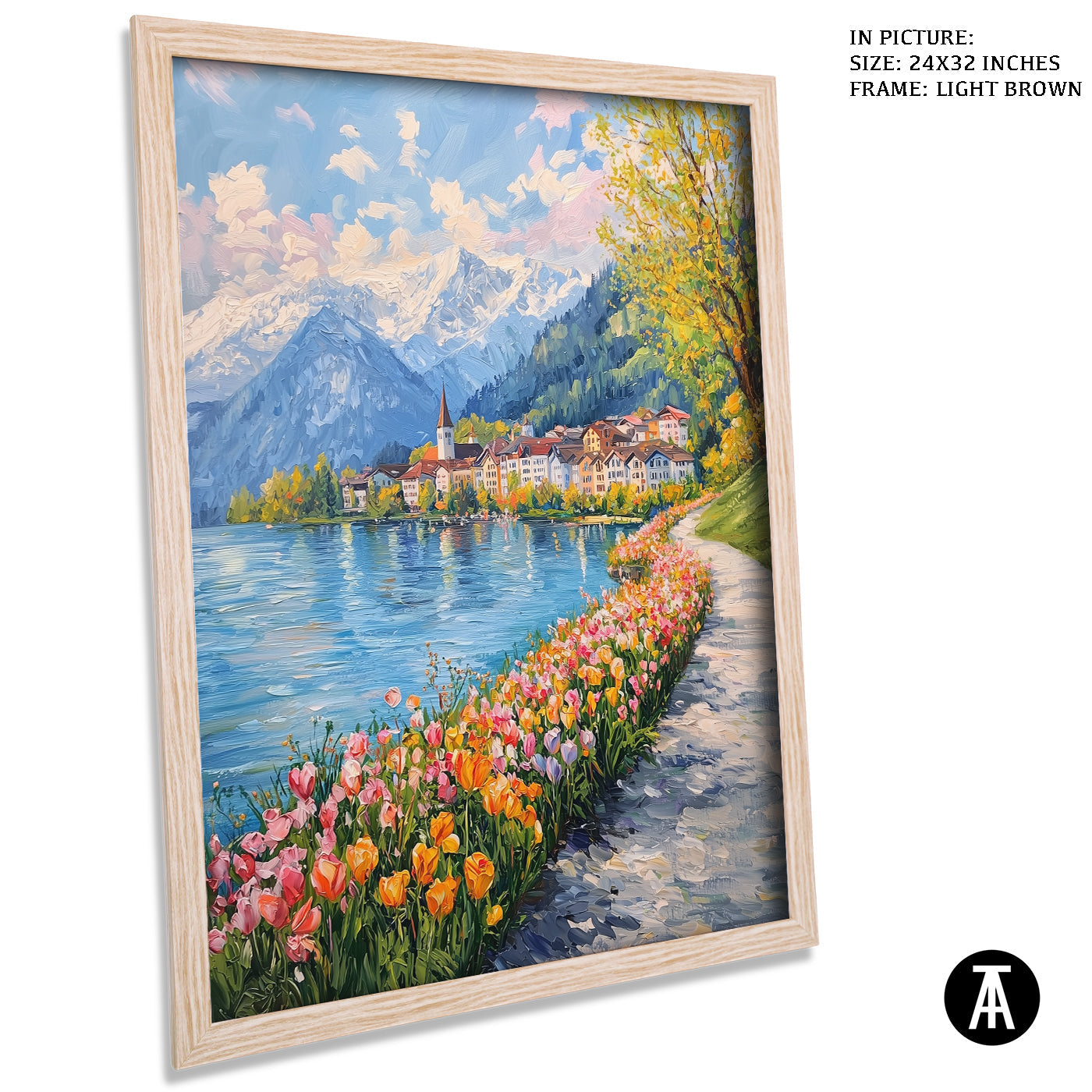 Bring the vibrant energy of Interlaken into your space with this artwork of colorful flower beds and a scenic city view. The painting captures the picturesque charm of this Swiss town, nestled between majestic Alpine peaks. Perfect as framed art for your living room, hallway, or study, this modern art piece adds a refreshing touch to your decor. Let this wall painting inspire moments of joy and connection with nature's beauty and urban elegance. A perfect addition for lovers of Swiss landscapes and bright, cheerful art.
