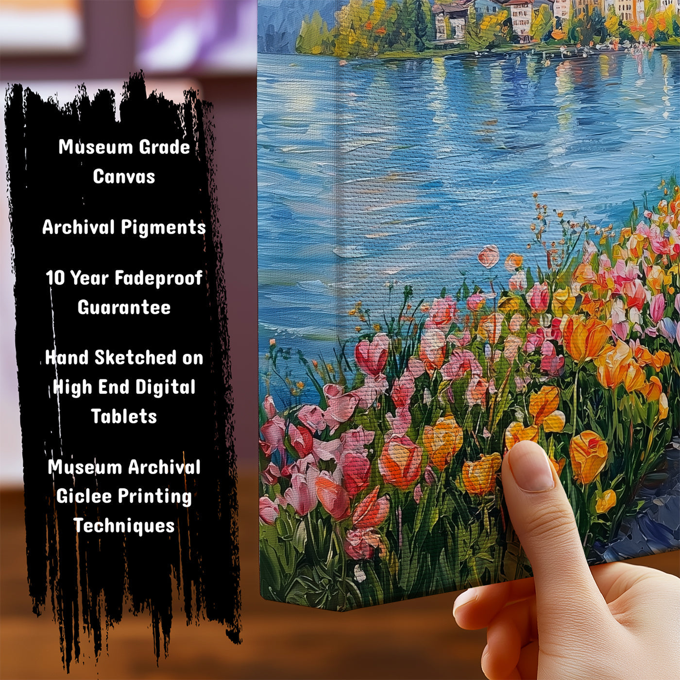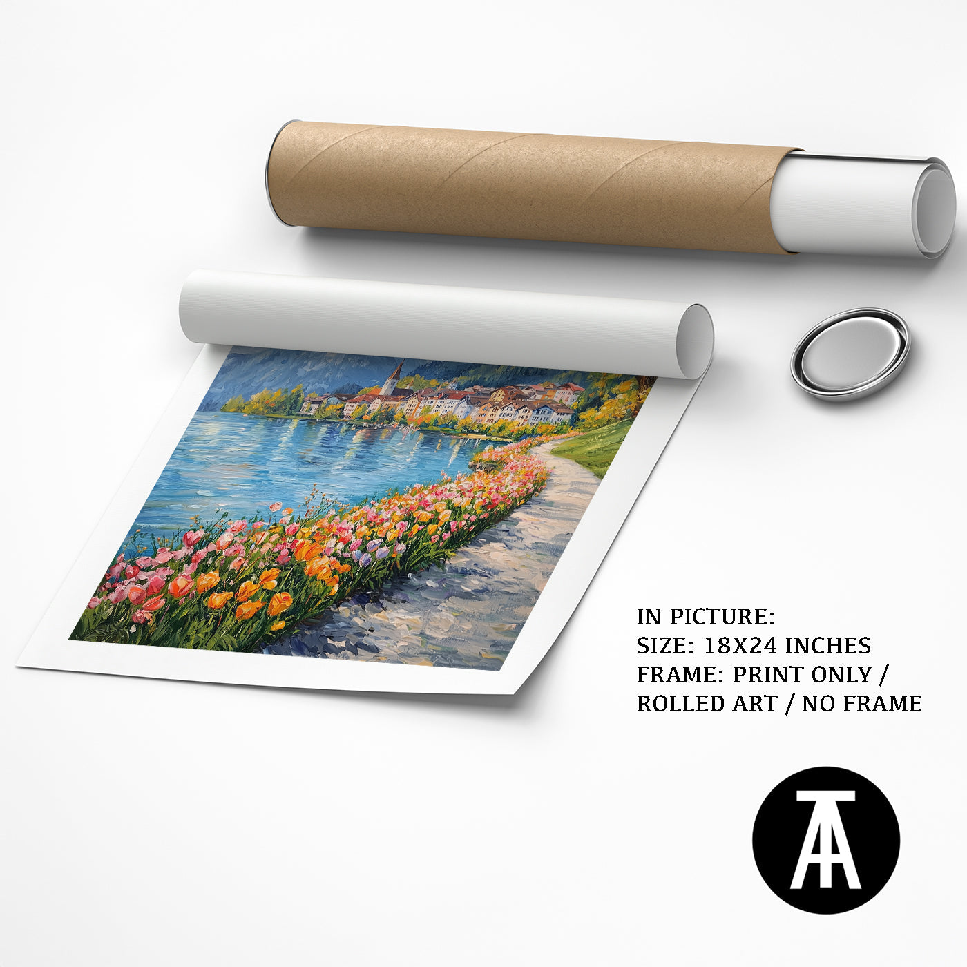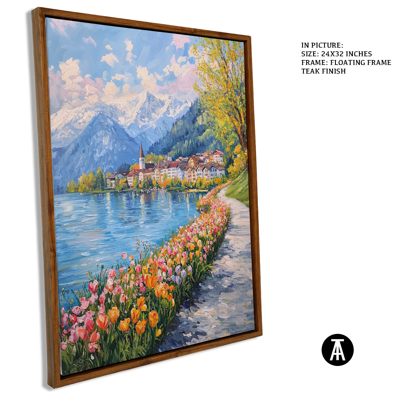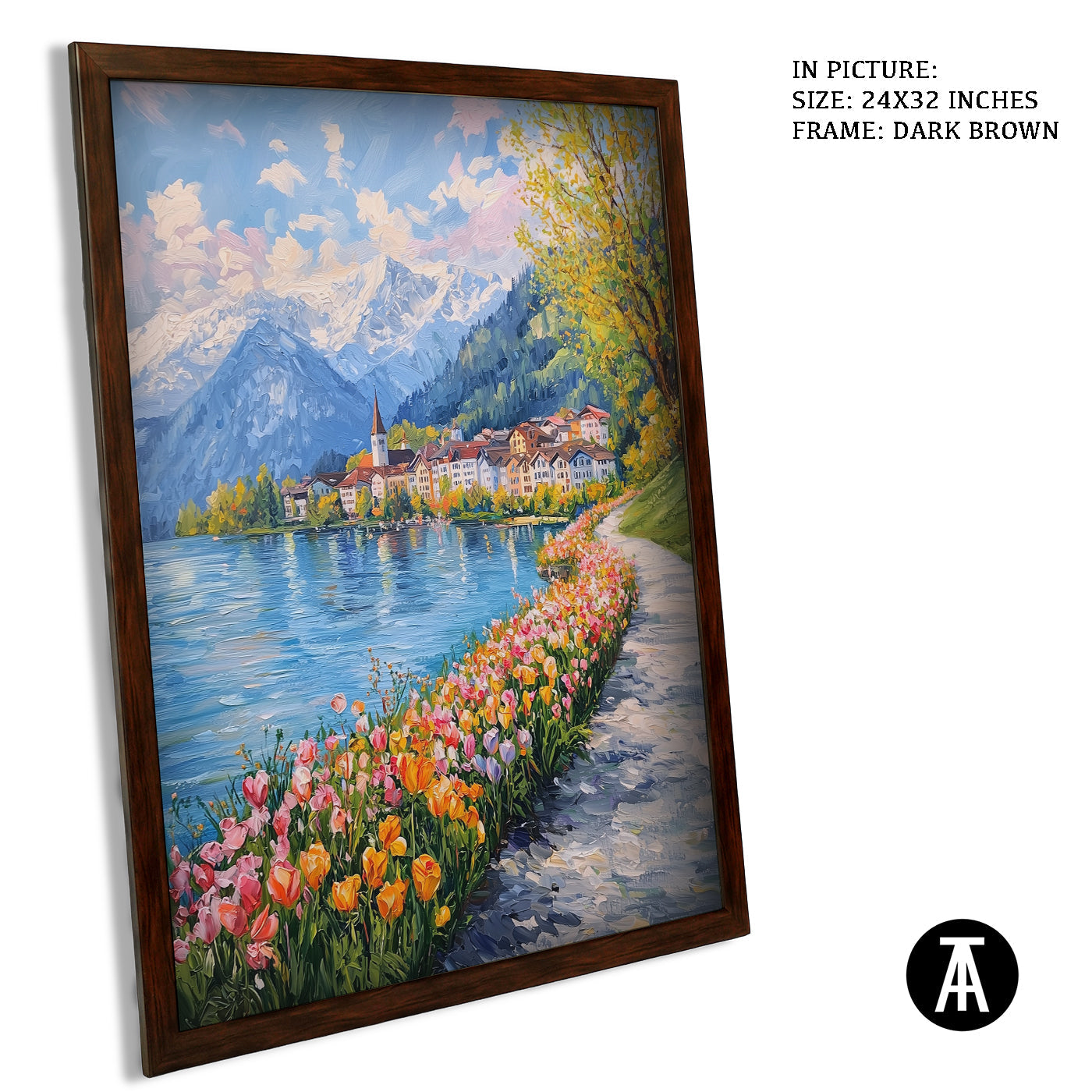 Bring the vibrant energy of Interlaken into your space with this artwork of colorful flower beds and a scenic city view. The painting captures the picturesque charm of this Swiss town, nestled between majestic Alpine peaks. Perfect as framed art for your living room, hallway, or study, this modern art piece adds a refreshing touch to your decor. Let this wall painting inspire moments of joy and connection with nature's beauty and urban elegance. A perfect addition for lovers of Swiss landscapes and bright, cheerful art.