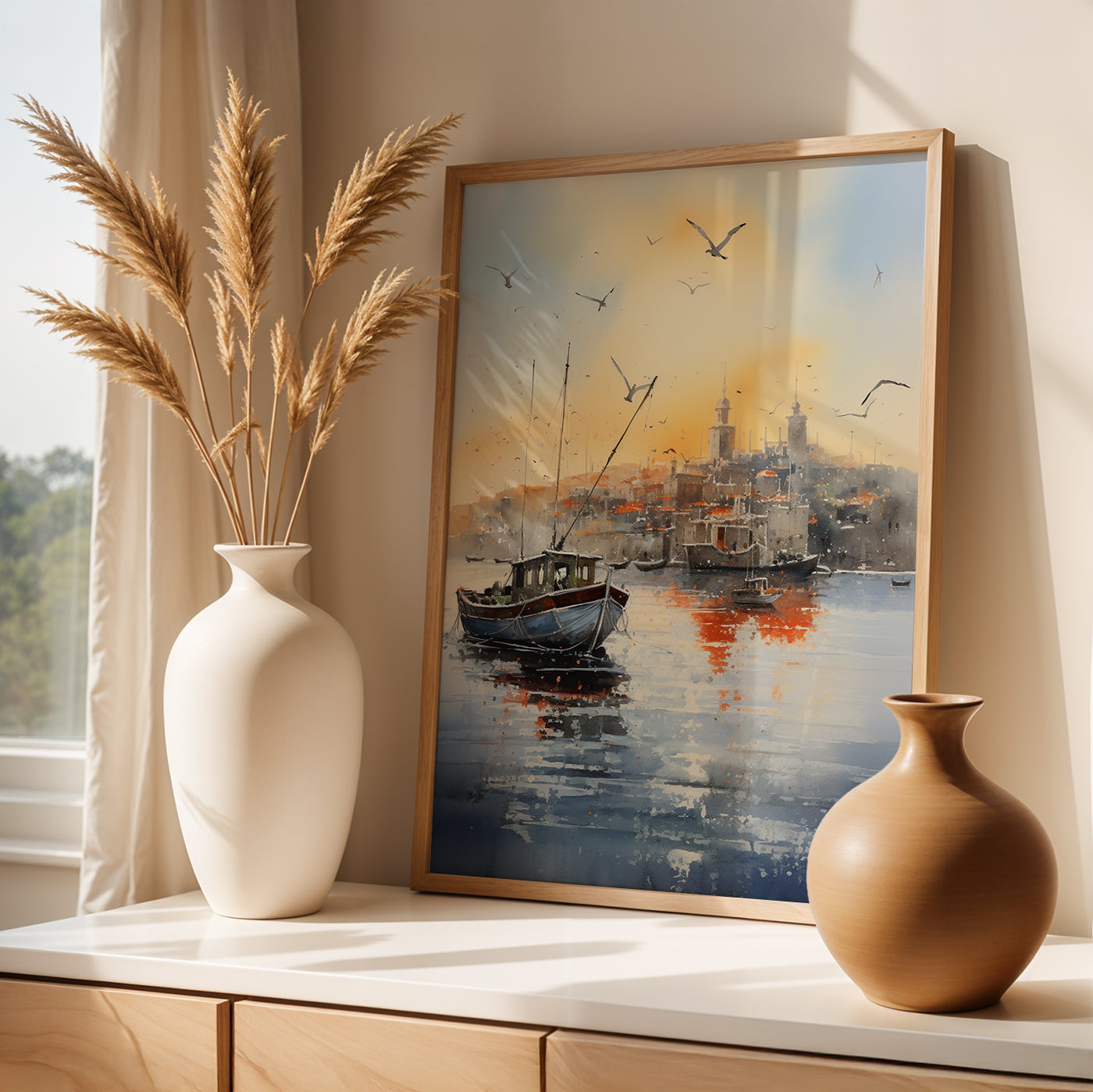 Elevate your interior design with a framed artwork capturing the beauty of the Golden Horn in Istanbul. This exquisite piece seamlessly blends luxury decor and scenic beauty, making it an ideal addition to your wall art collection. Immerse your living space in the breathtaking views and cultural richness of this iconic Istanbul waterway.