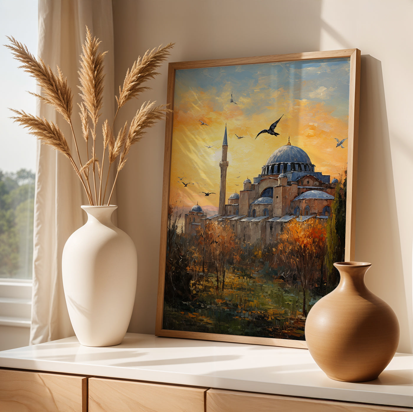 Immerse yourself in the grandeur of Istanbul with a framed artwork featuring the iconic Hagia Sophia. This luxurious piece adds a touch of cultural sophistication to your home decor, capturing the timeless beauty of this historic landmark. Ideal for those seeking a statement piece that reflects the rich heritage of Istanbul.