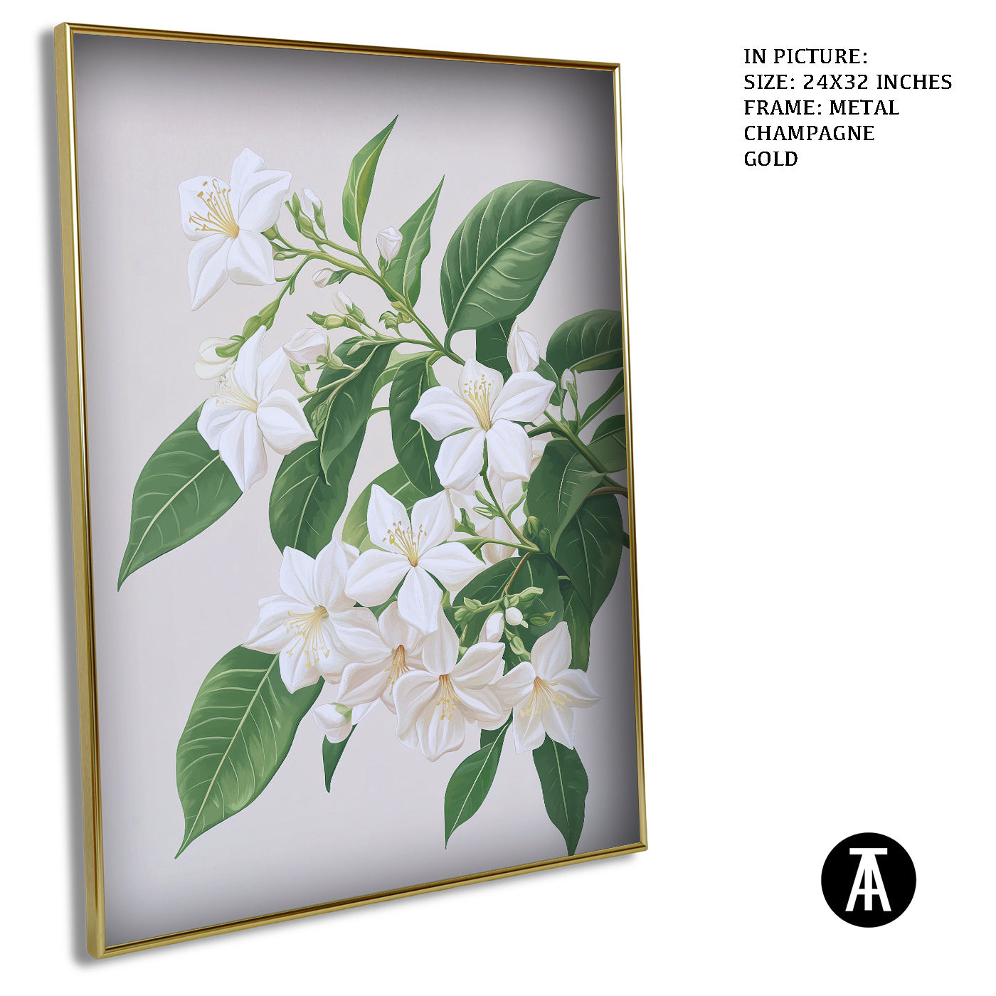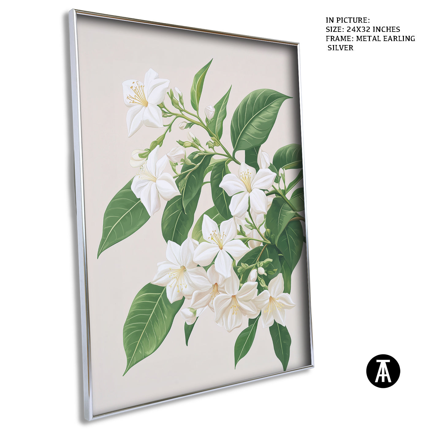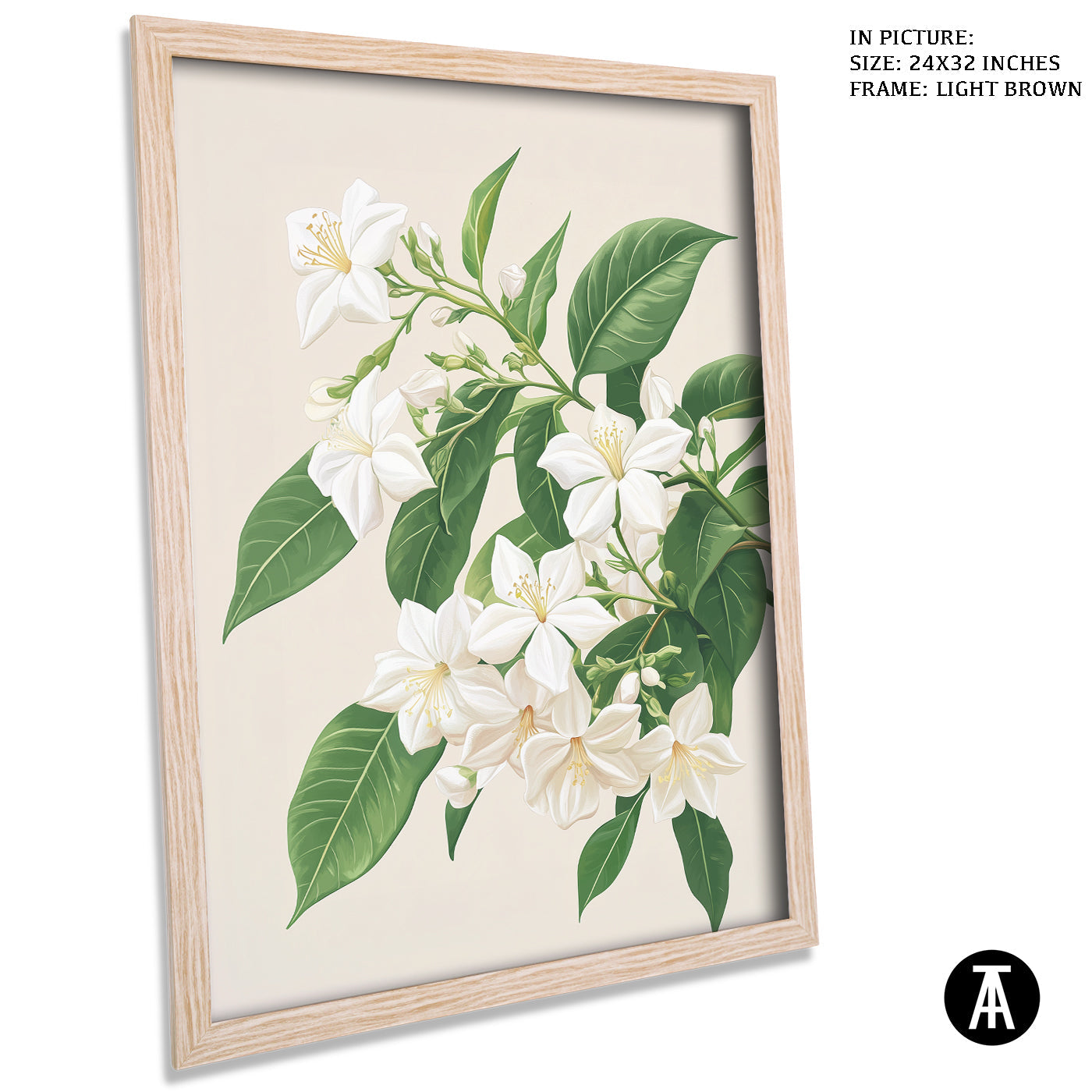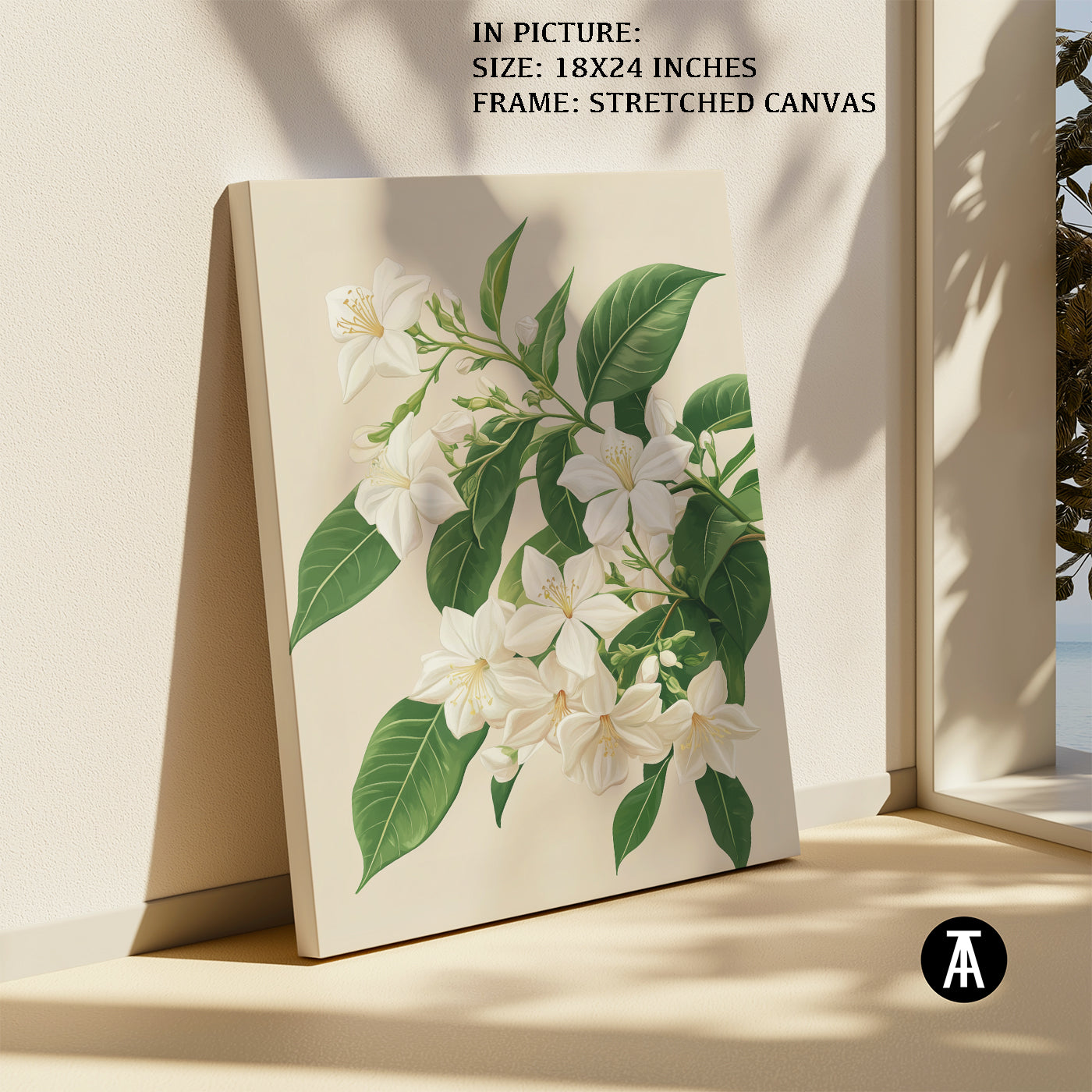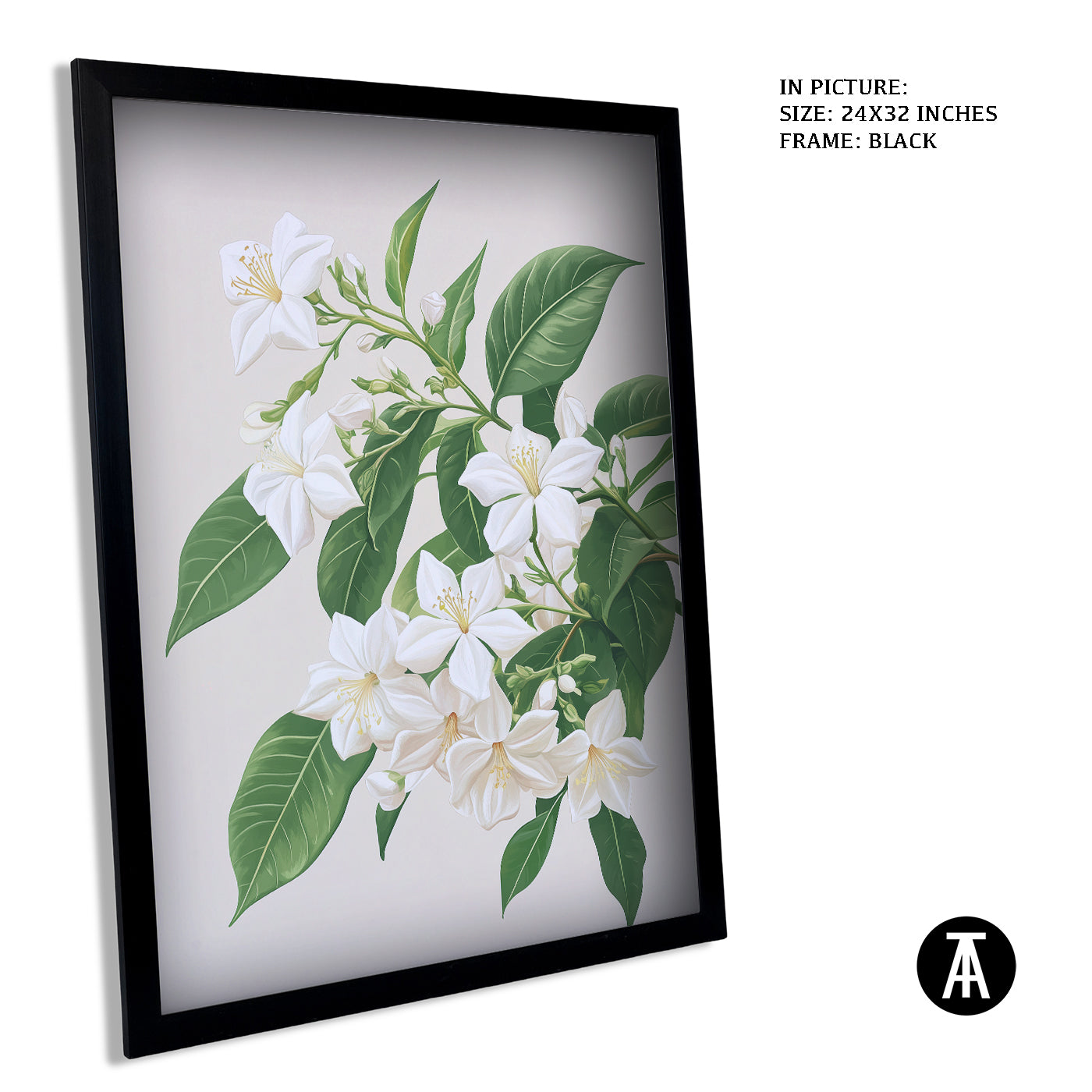 This artwork captures the delicate beauty of jasmine flowers in bloom. The soft white petals and fresh green leaves create a peaceful and refreshing look. It’s perfect for adding a touch of nature’s charm to your home. A great choice for anyone who loves simple, elegant floral art.