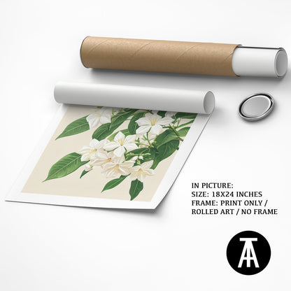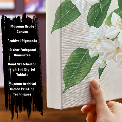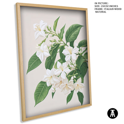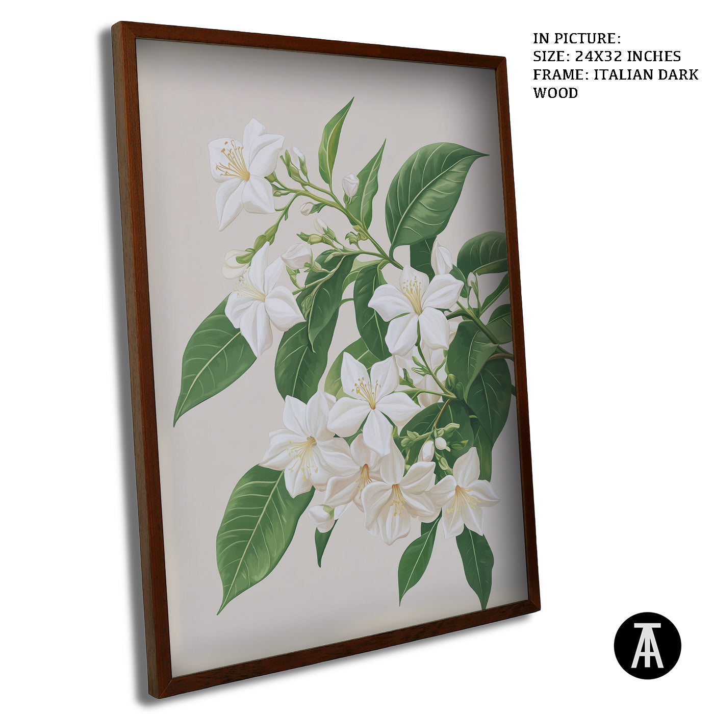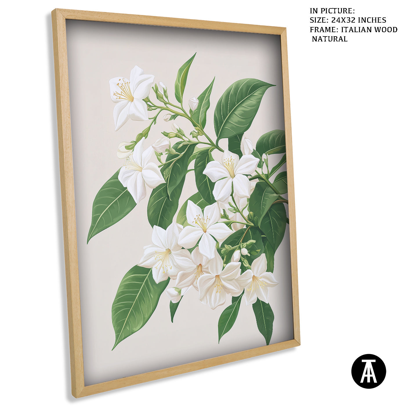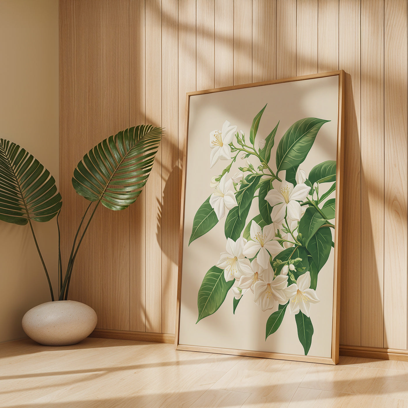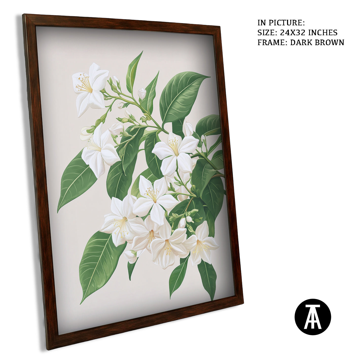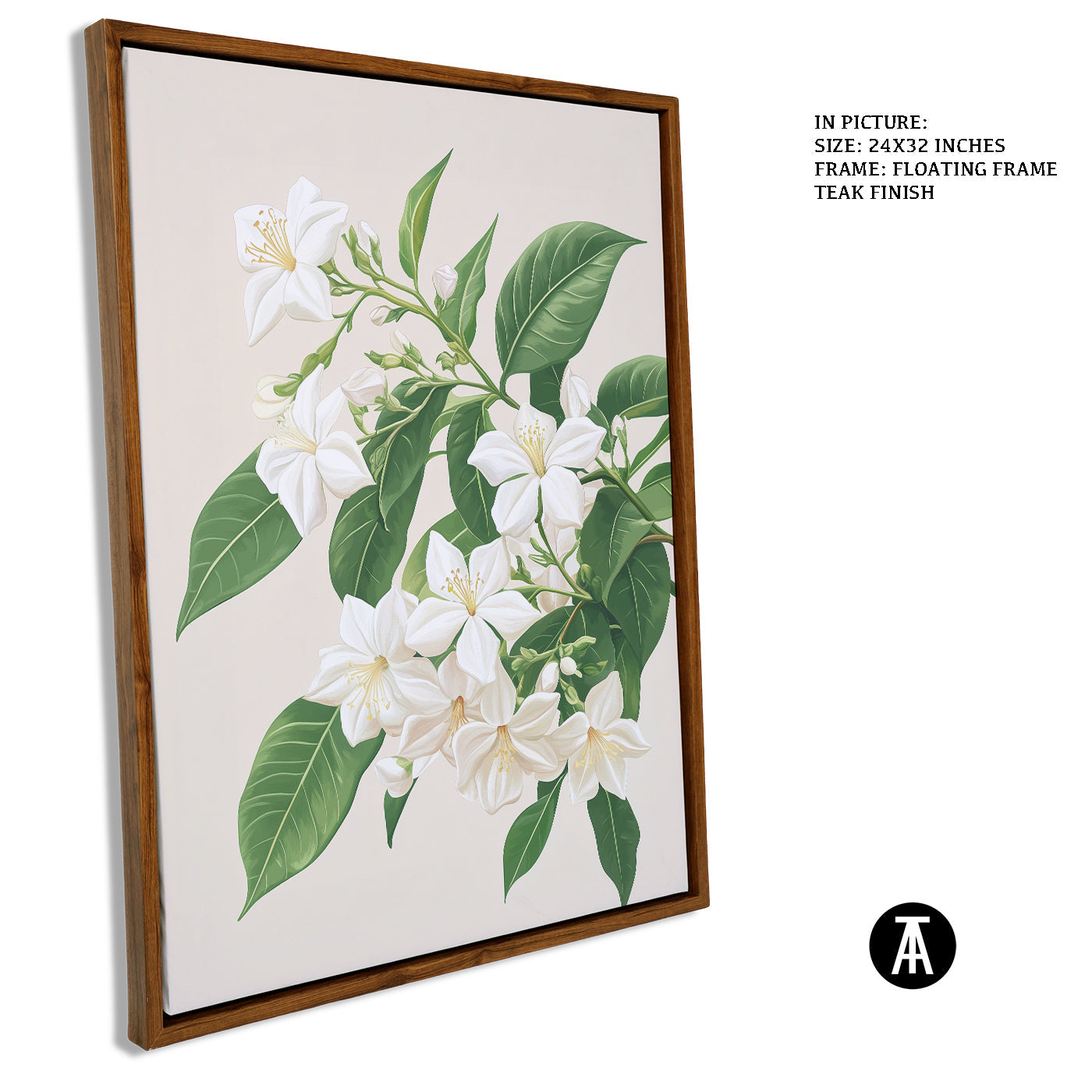 This artwork captures the delicate beauty of jasmine flowers in bloom. The soft white petals and fresh green leaves create a peaceful and refreshing look. It’s perfect for adding a touch of nature’s charm to your home. A great choice for anyone who loves simple, elegant floral art.