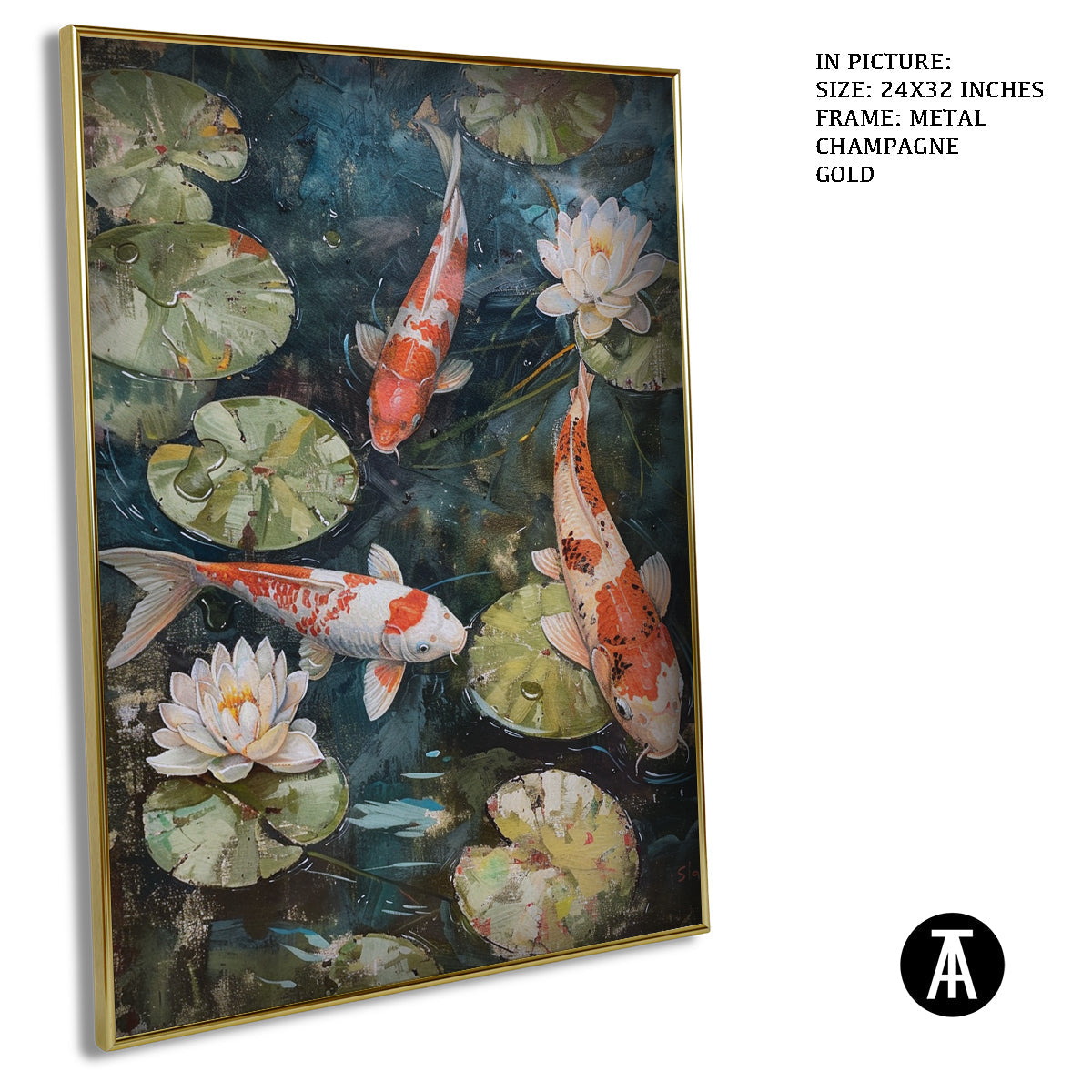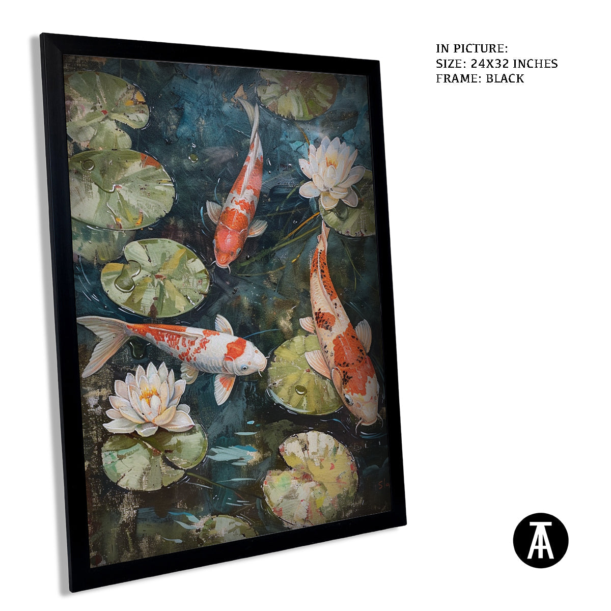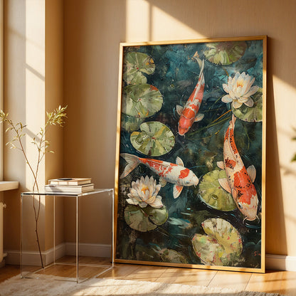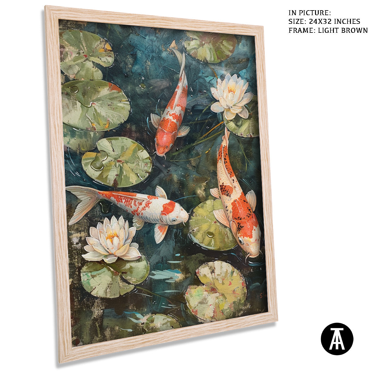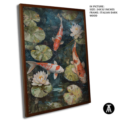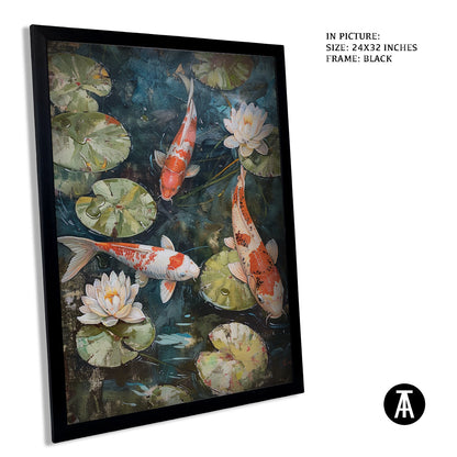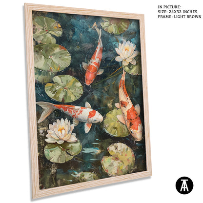 "Koi Fish in a Pond" is a beautiful framed artwork that shows colorful koi fish swimming peacefully in a calm pond. The bright colors of the fish and the soft ripples in the water create a relaxing and soothing feeling. This artwork is perfect for adding a peaceful touch to any room.