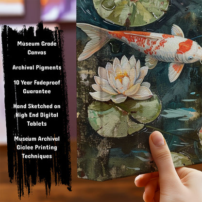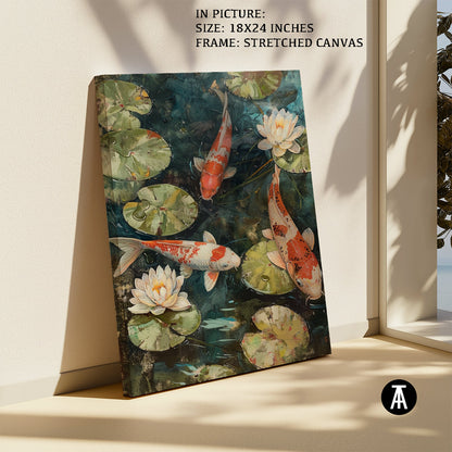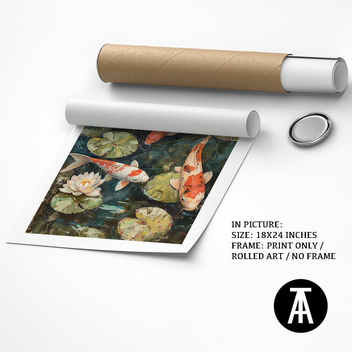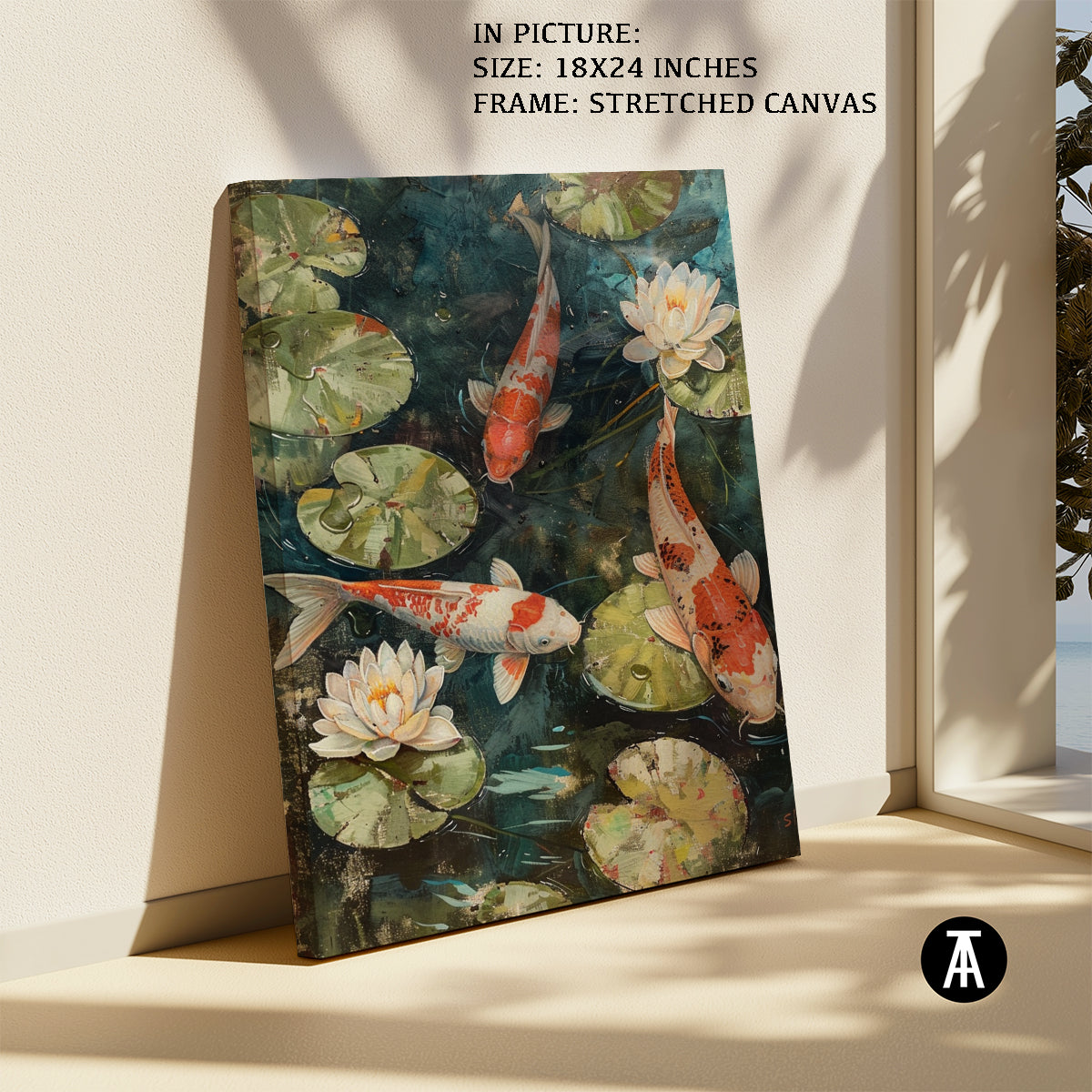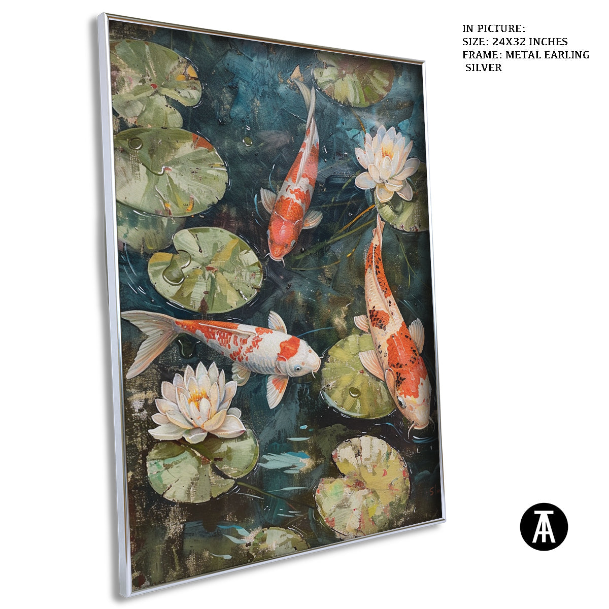 "Koi Fish in a Pond" is a beautiful framed artwork that shows colorful koi fish swimming peacefully in a calm pond. The bright colors of the fish and the soft ripples in the water create a relaxing and soothing feeling. This artwork is perfect for adding a peaceful touch to any room.
