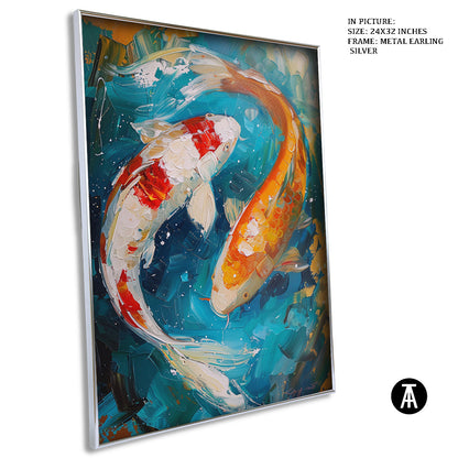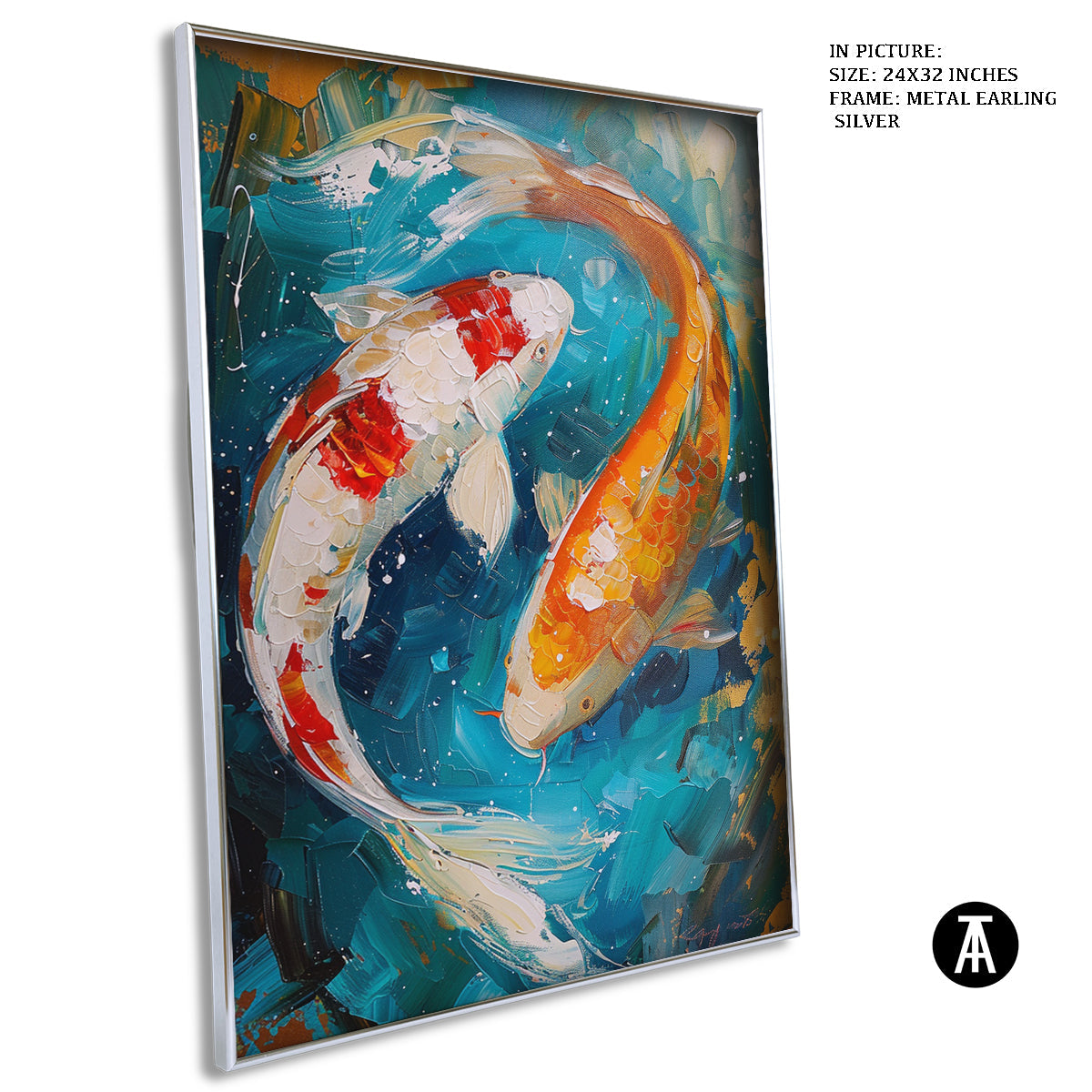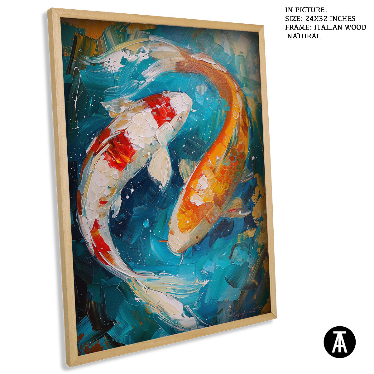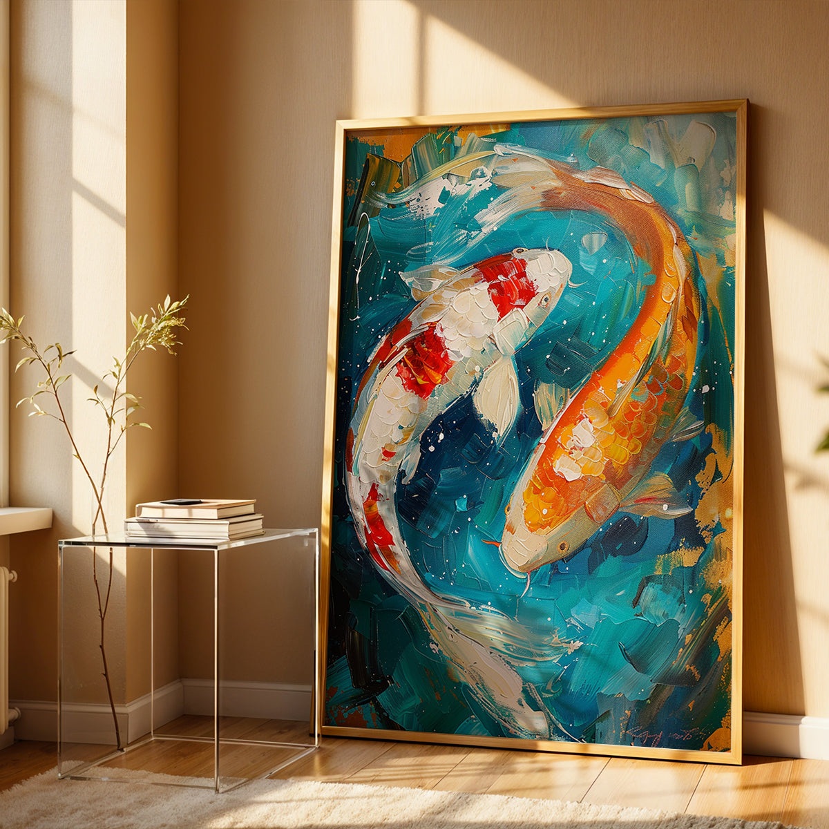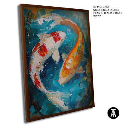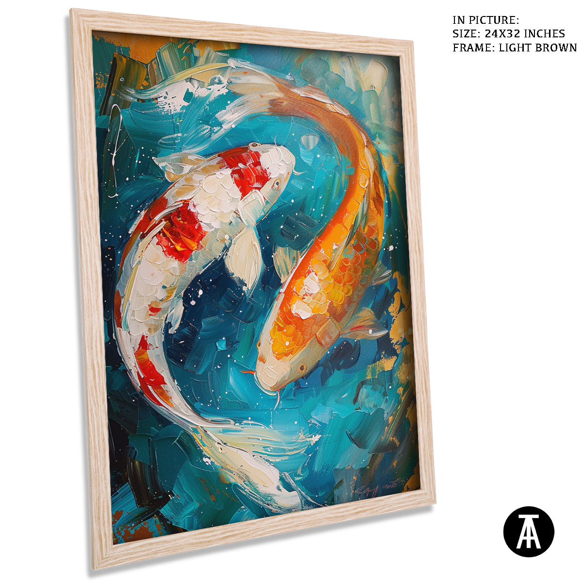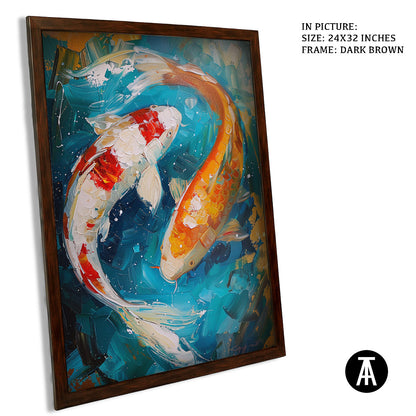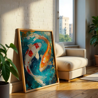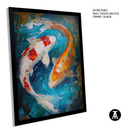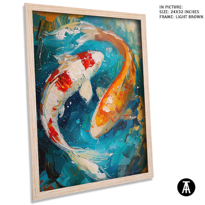 This framed artwork, titled "Koi Fish Pond," captures the serene beauty of a peaceful pond filled with vibrant koi fish. The detailed illustration brings the gentle ripples of water and the graceful movement of the fish to life, creating a calming and harmonious atmosphere. Perfect for adding a touch of tranquility to any space.