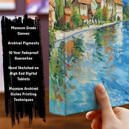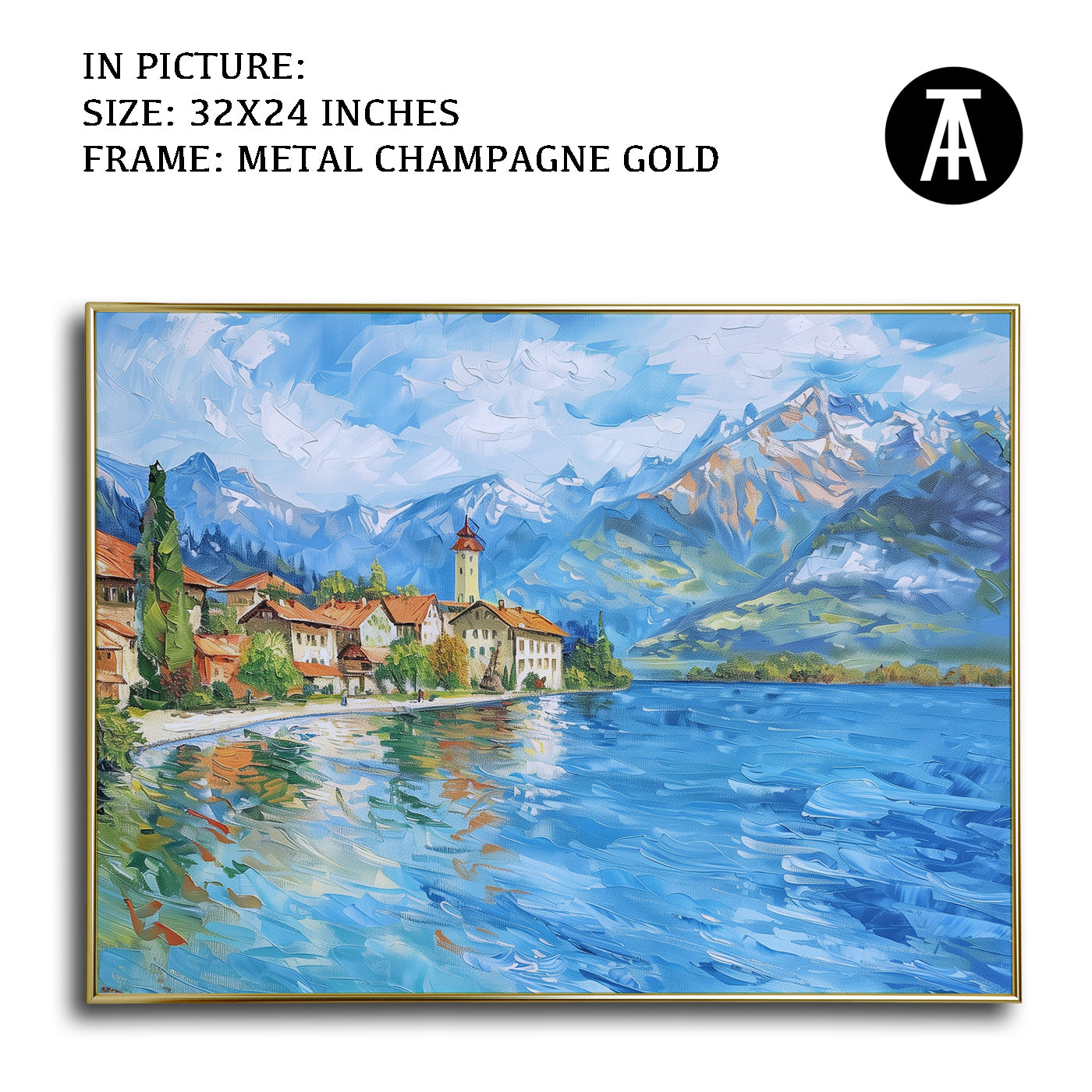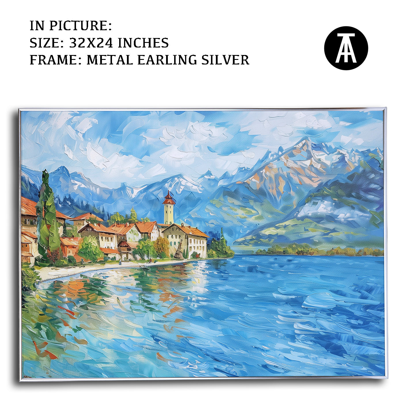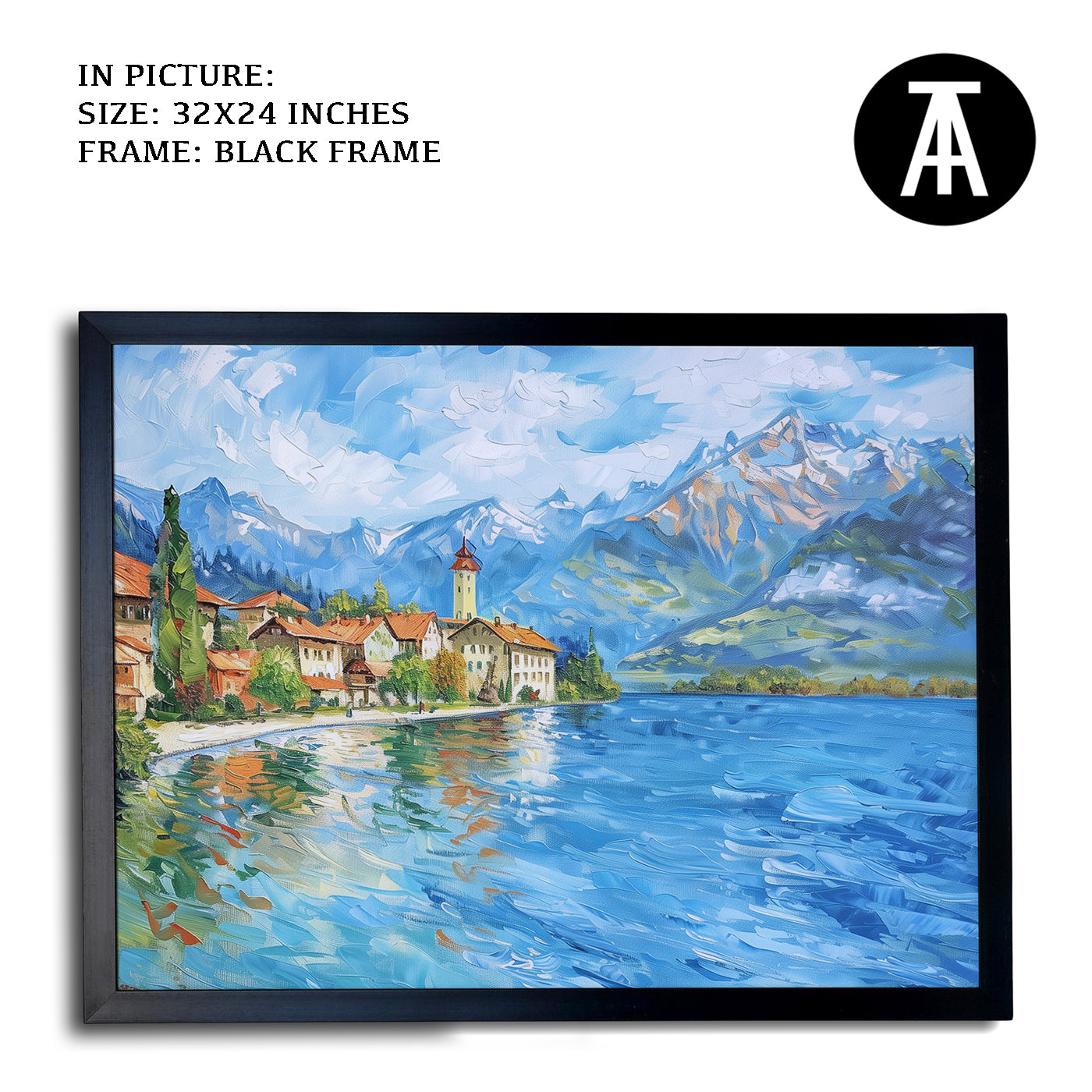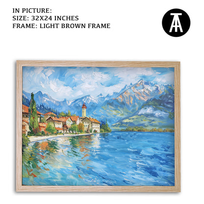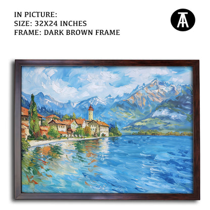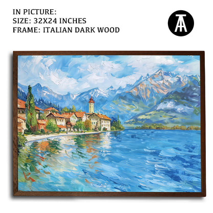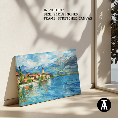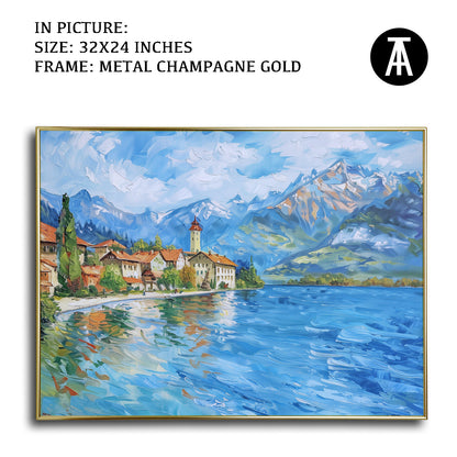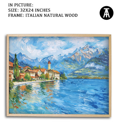 Dive into the serene beauty of Lake Thun with this captivating artwork. The painting captures the crystal-clear waters framed by majestic mountains and lush greenery, creating a scene of pure tranquility. Perfect as framed art for your living room, bedroom, or office, this modern art piece brings a sense of calm and natural splendor to your decor. A stunning wall painting for nature enthusiasts and lovers of Alpine landscapes.
