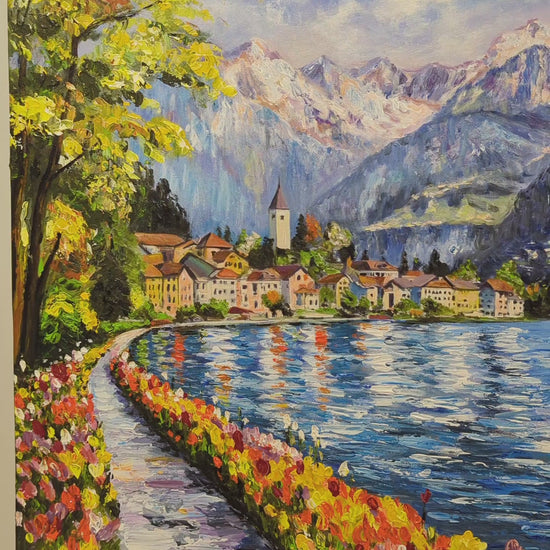 A vibrant landscape with a flower-lined lakeside path, shimmering water, and distant mountains—fresh, scenic, and travel-inspired. The brushwork feels airy and uplifting, bringing daylight energy into the room. Perfect for living rooms, corridors, vacation homes, and spaces needing an open, expansive feel.