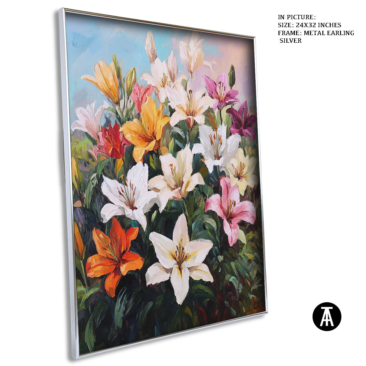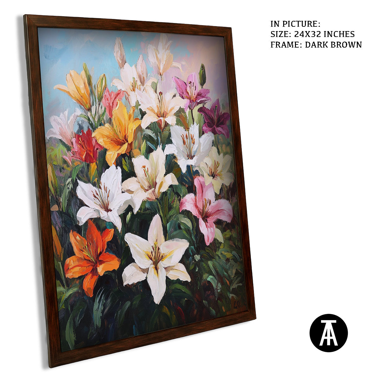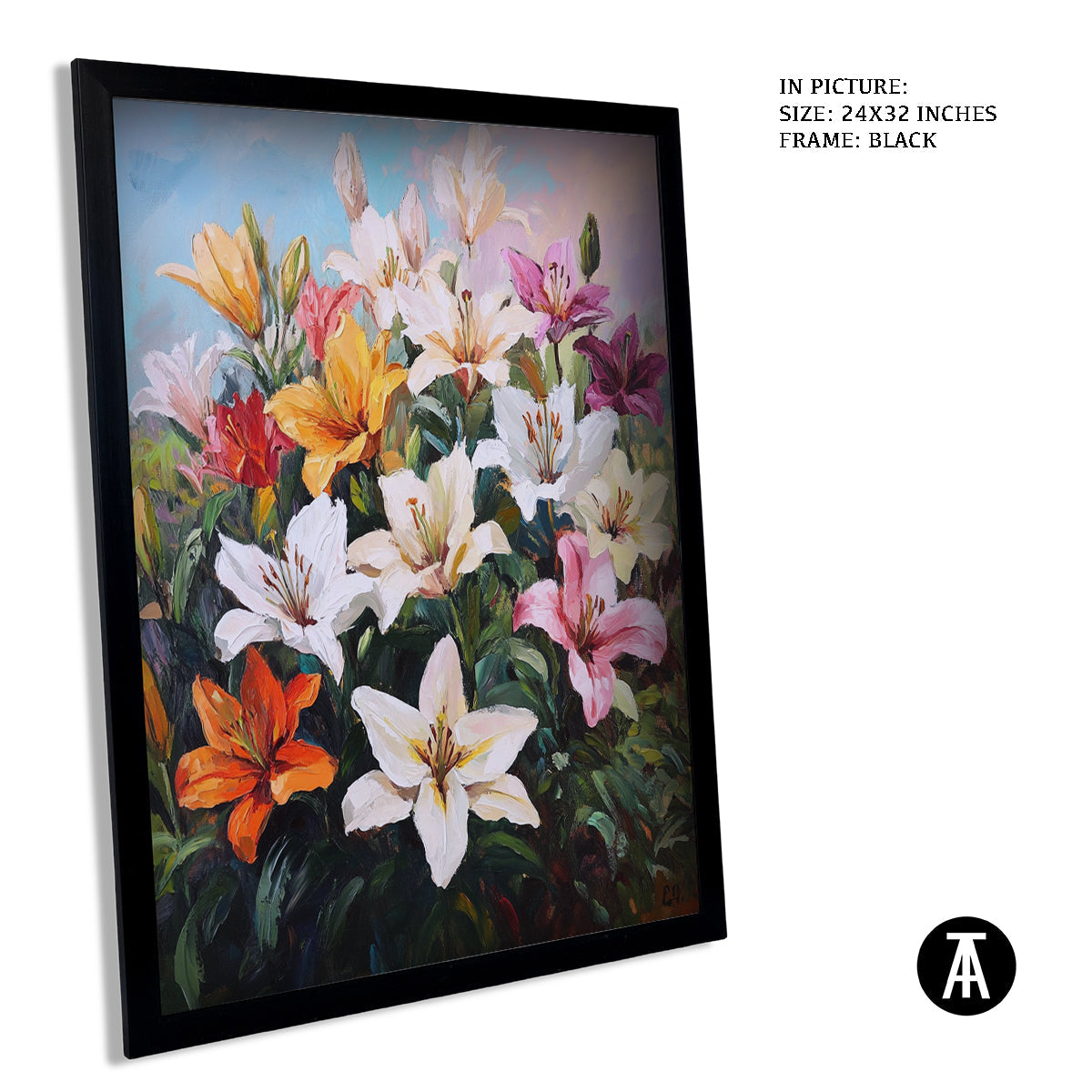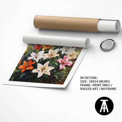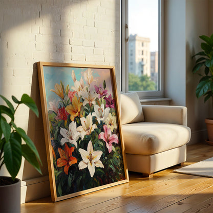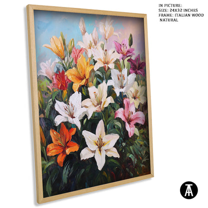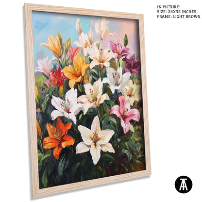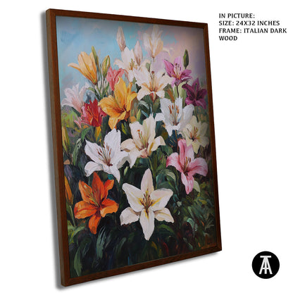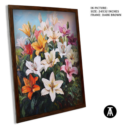 Elevate your space with our modern art masterpiece featuring vibrant lilies. This exquisite framed art piece brings the beauty of nature indoors, perfect for enhancing any living room or contemporary setting. Ideal as wall art or a stunning wall painting, it seamlessly blends into modern decor while adding a touch of elegance. Discover the allure of modern paintings with this captivating floral artwork.