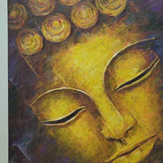 A glowing golden visage rendered with dramatic shadows and rich texture—peaceful, meditative, and quietly powerful. The deep charcoal and violet undertones add depth while the warm gold radiates calm and focus. Perfect for zen corners, living rooms, meditation spaces, and boutique hotel styling.