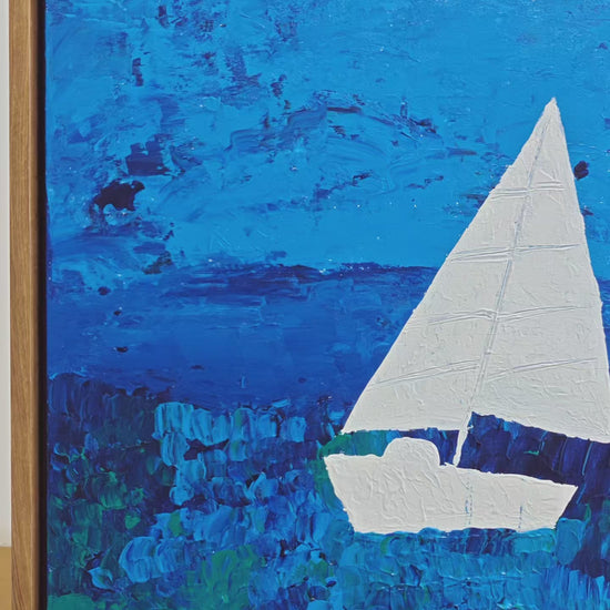 “Lost at Sea” captures the feeling of drifting through life’s overwhelming moments, symbolised by a solitary sailboat navigating deep, textured waves. Painted in rich shades of blue, this expressive acrylic artwork reflects themes of isolation, introspection, and emotional turbulence. The stark white silhouette of the boat contrasts against the layered ocean, echoing the search for direction amidst inner chaos. Perfect for modern homes, coastal decor lovers, and collectors of contemporary abstract art. This original handmade painting adds depth, mood, and a sense of journey to any wall.