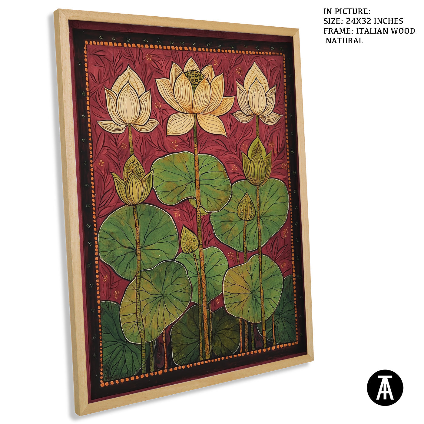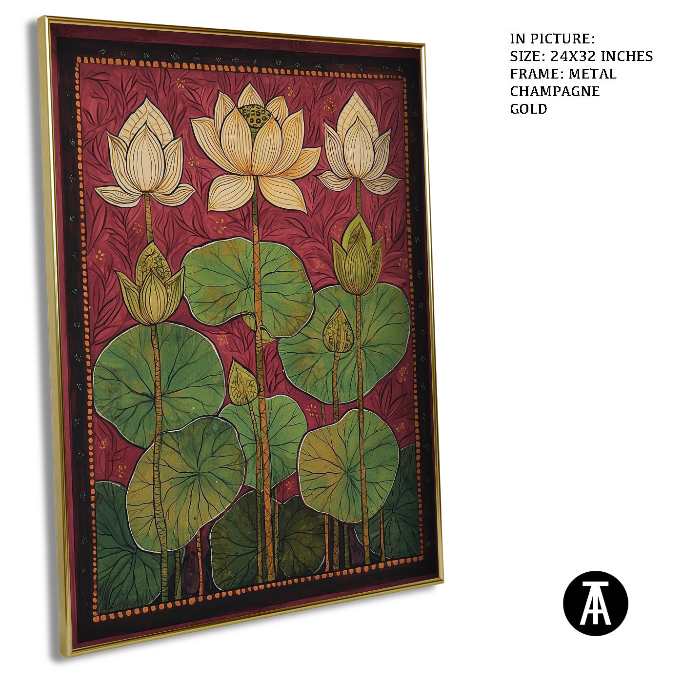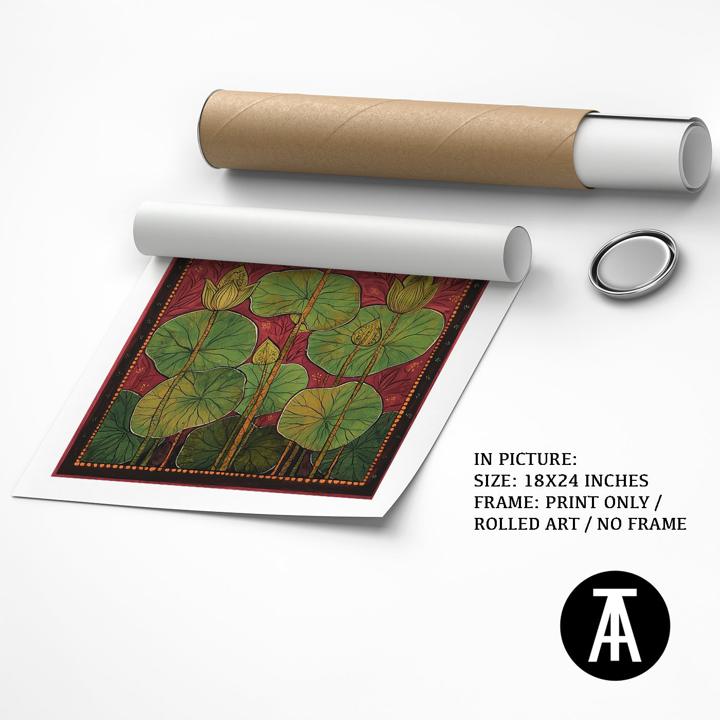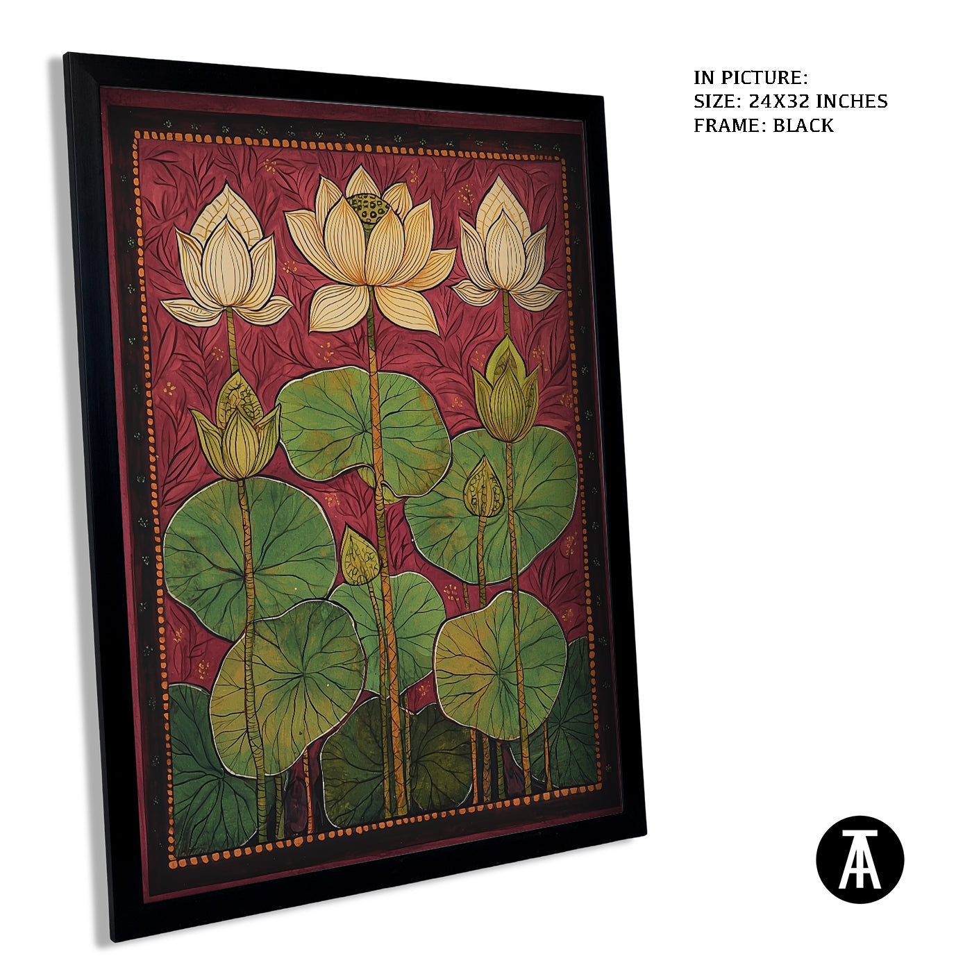 This artwork beautifully showcases the lotus flower in the traditional Madhubani style. The intricate patterns and vibrant colors bring a rich cultural feel to your space. It’s perfect for anyone who appreciates traditional Indian art. A great way to add a touch of elegance and heritage to your home.
