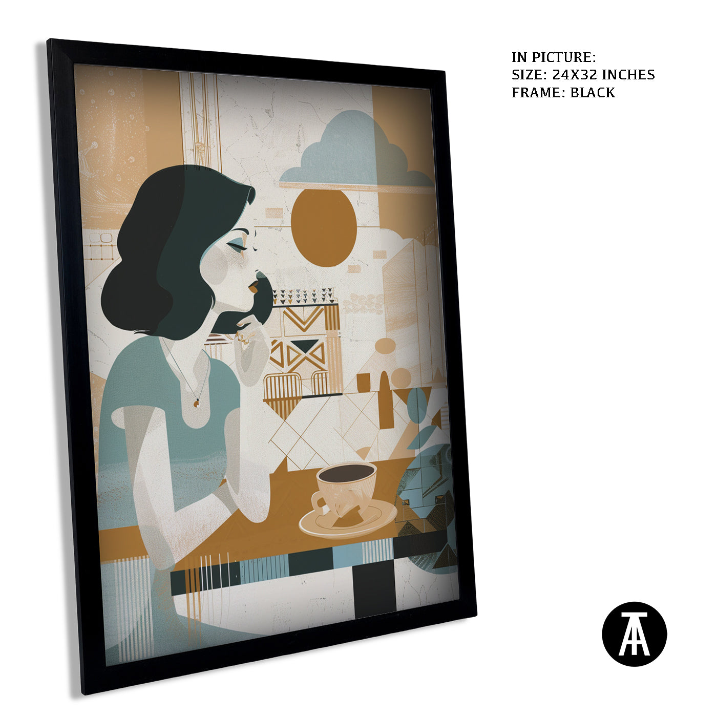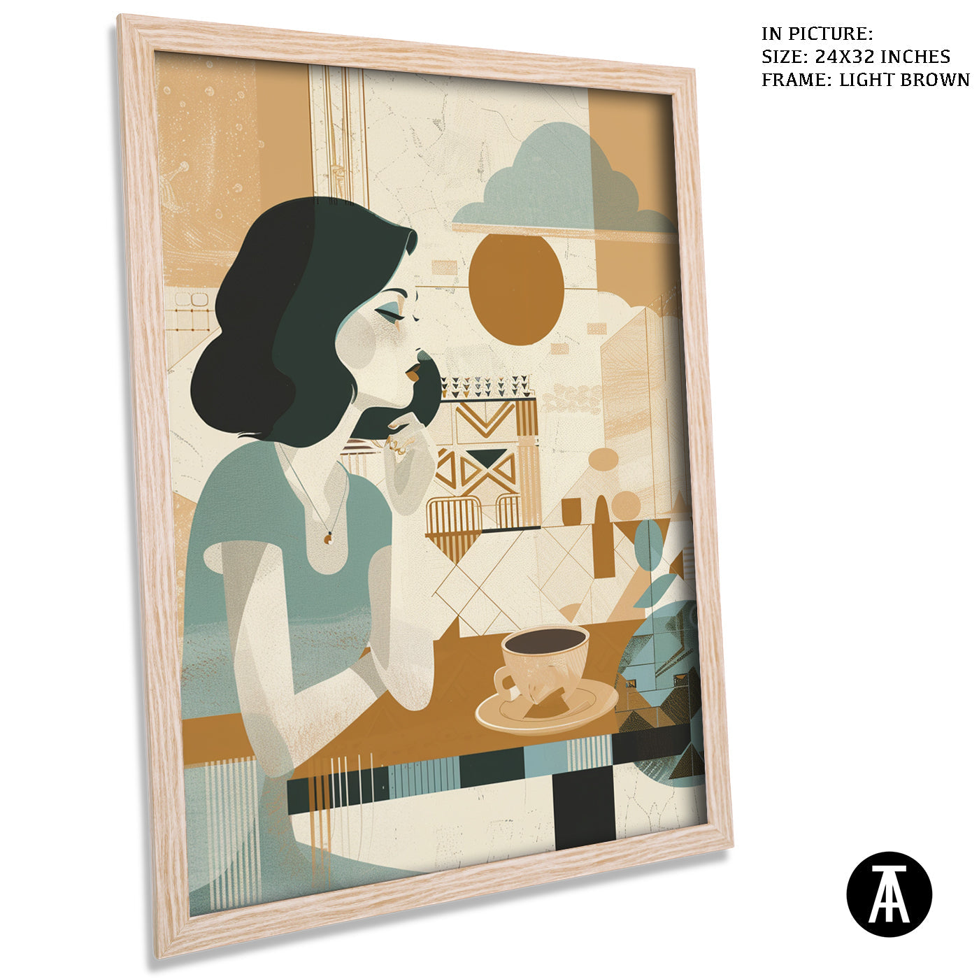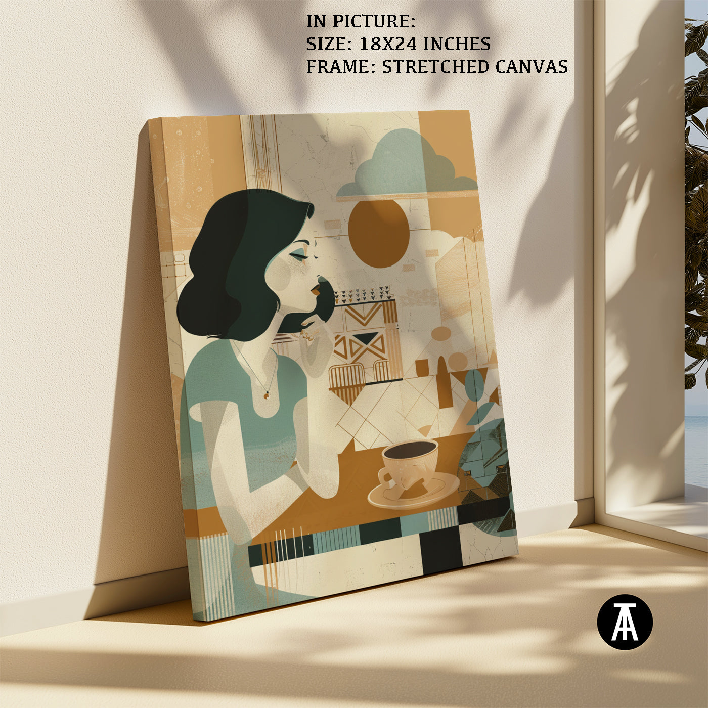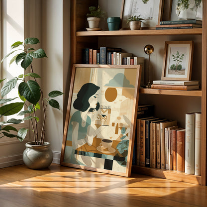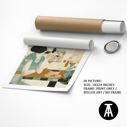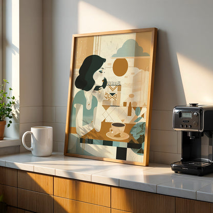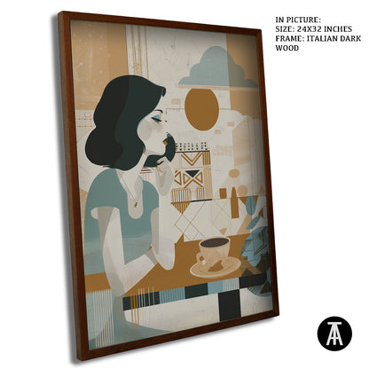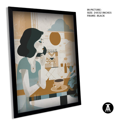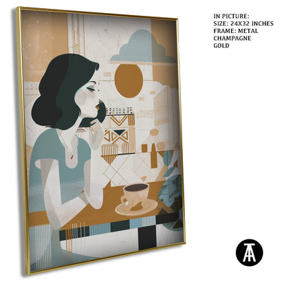 A gentle start to the day. This boho-style artwork depicts a woman enjoying her morning cup of coffee, creating a peaceful and calming atmosphere for your cafe. A relatable scene for coffee lovers who appreciate a quiet morning brew.
