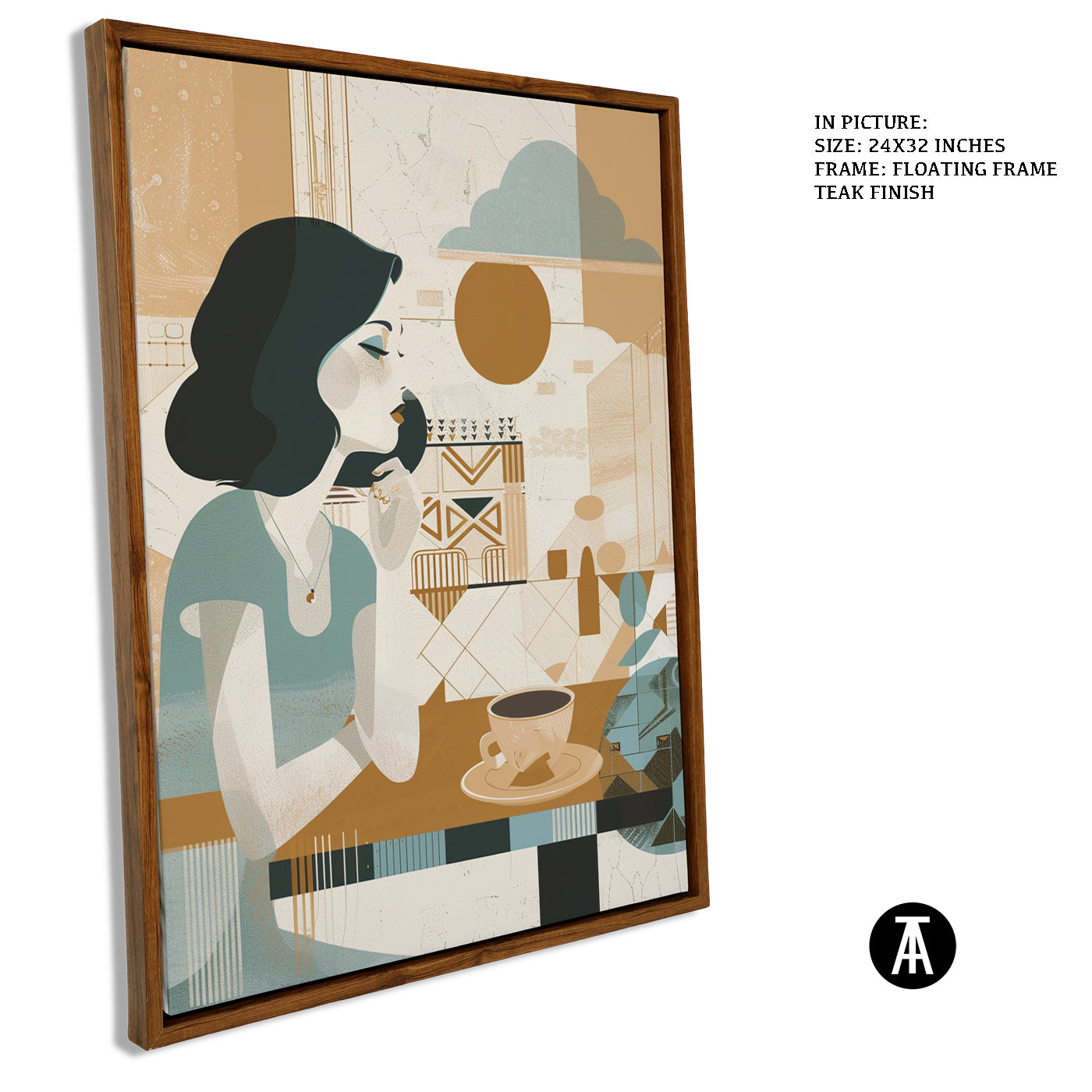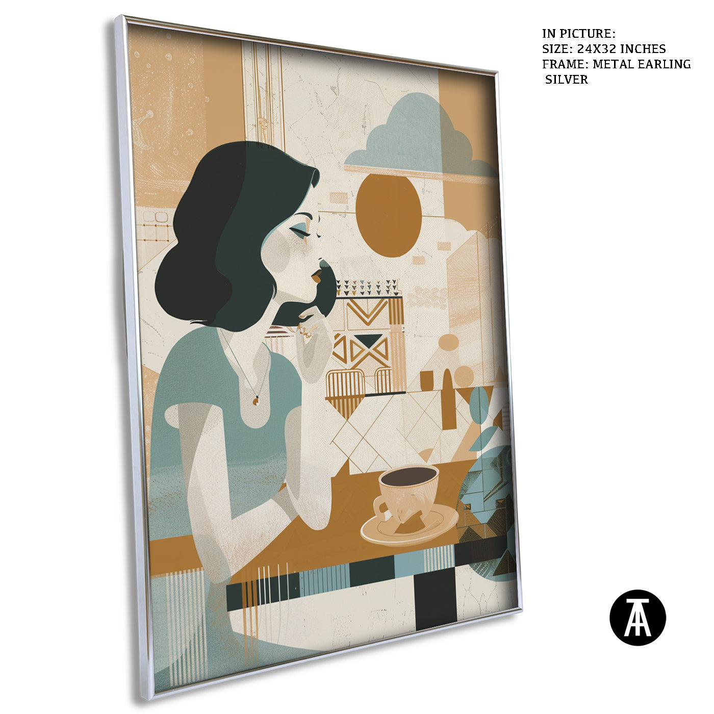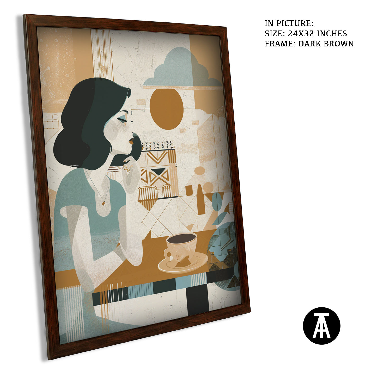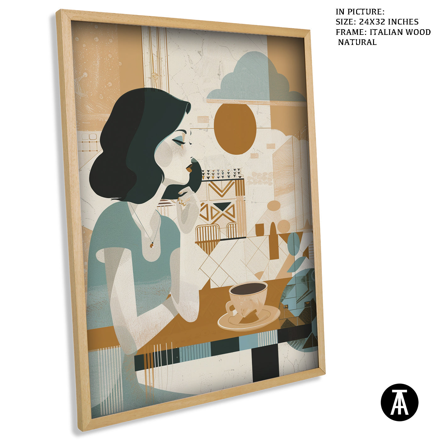 A gentle start to the day. This boho-style artwork depicts a woman enjoying her morning cup of coffee, creating a peaceful and calming atmosphere for your cafe. A relatable scene for coffee lovers who appreciate a quiet morning brew.