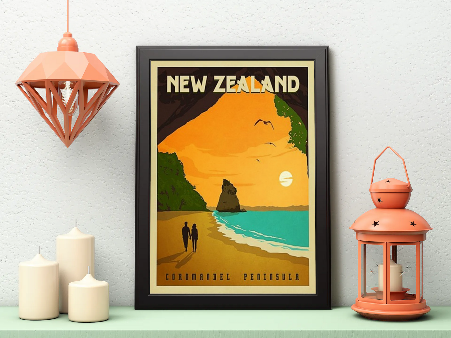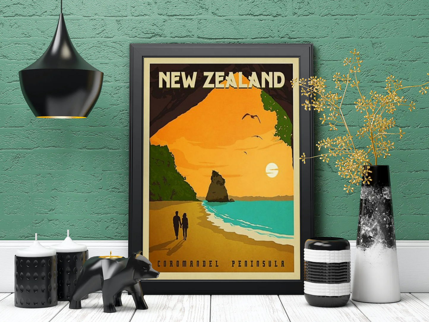 Transport yourself to the breathtaking beaches of New Zealand with our vintage poster. Feel the warmth of the golden sand beneath your feet as you gaze upon the turquoise waters of the Pacific Ocean. This artwork captures the serene beauty and tranquility of New Zealand's coastal landscapes, perfect for those seeking a coastal escape in their home decor.