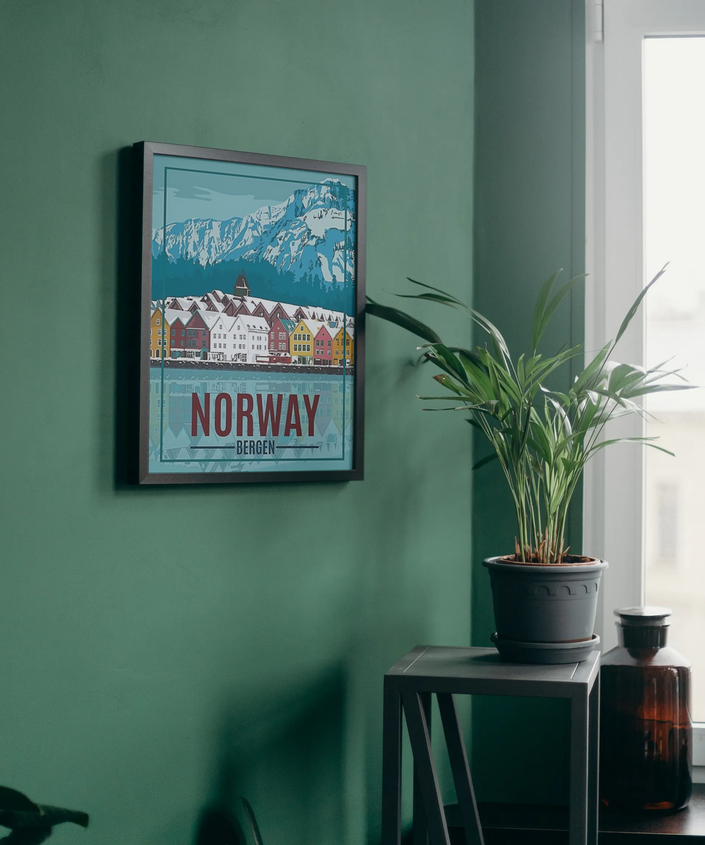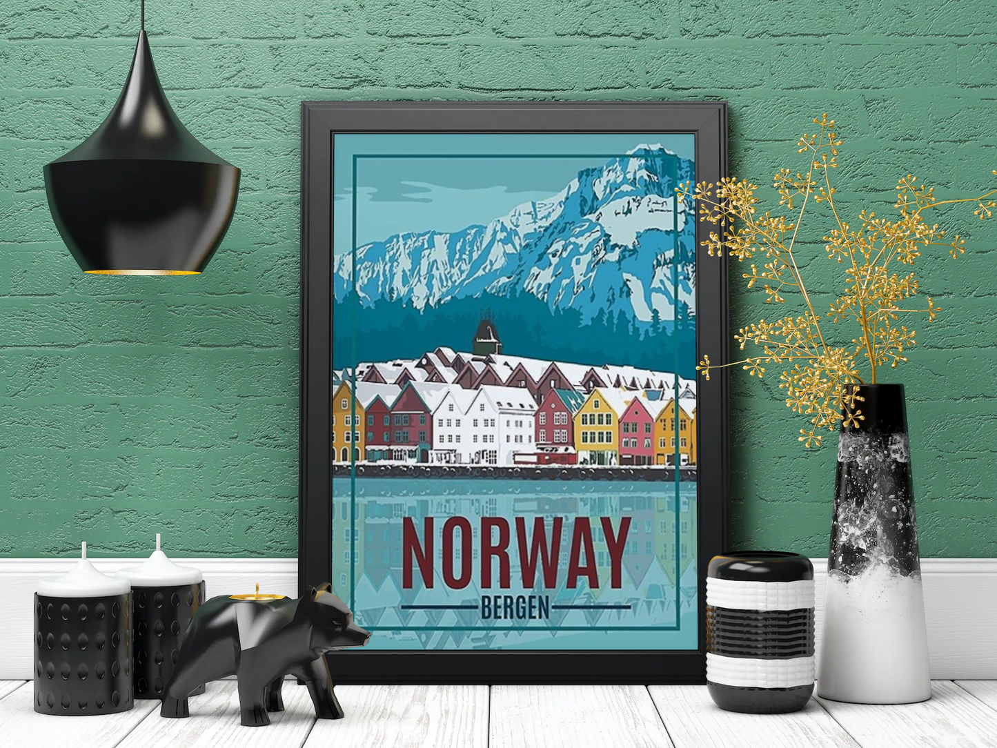 Experience the enchanting beauty of Bergen with our vintage poster. This captivating artwork transports you to the charming coastal city of Norway, where majestic mountains meet serene fjords. Adorn your walls with the timeless allure of Bergen and let its Scandinavian allure captivate your senses.