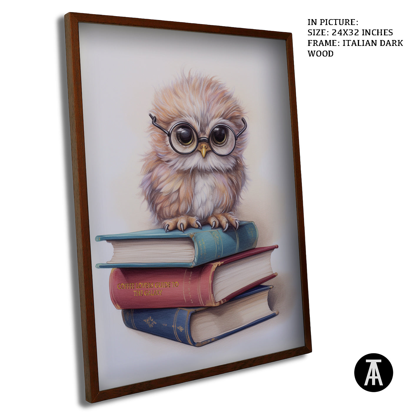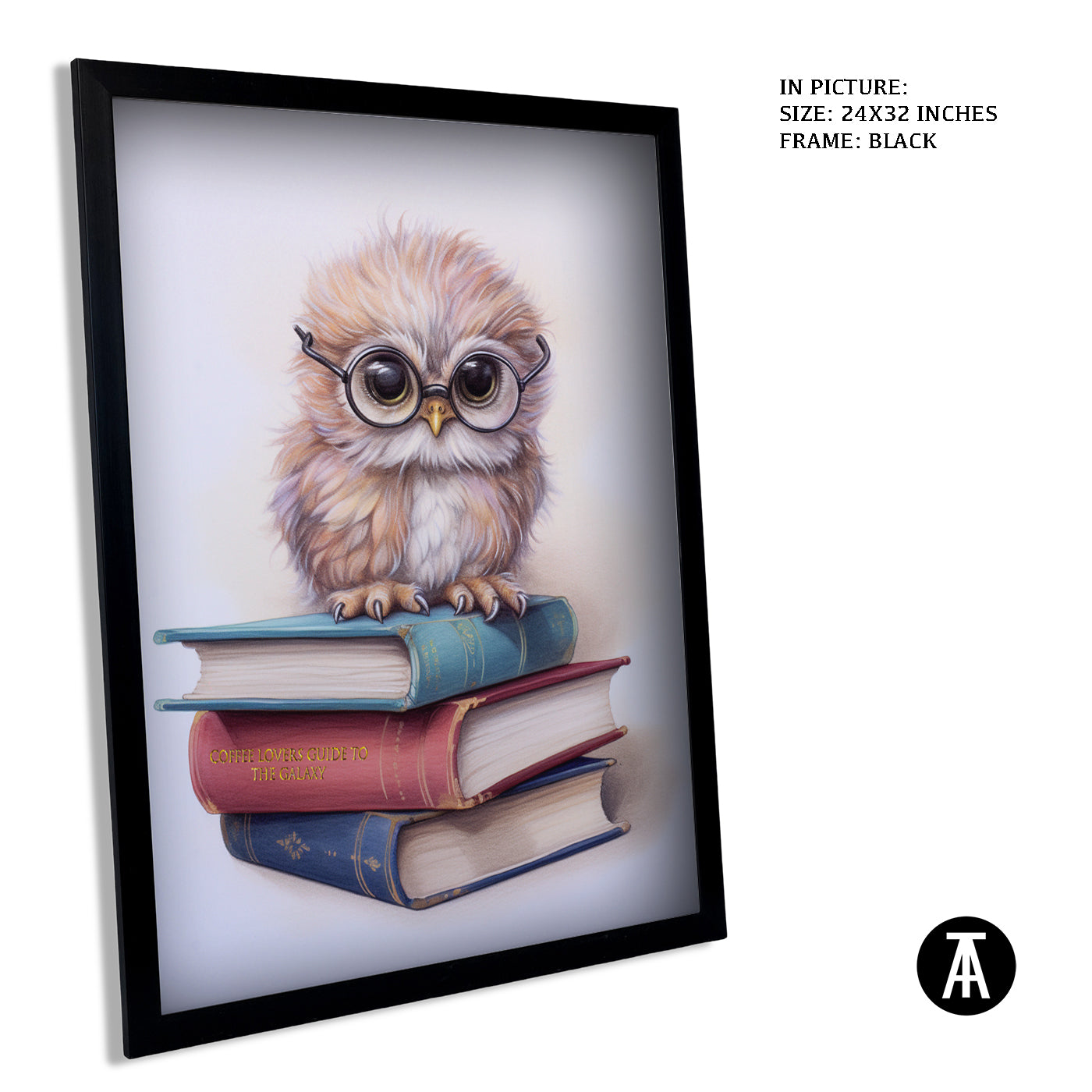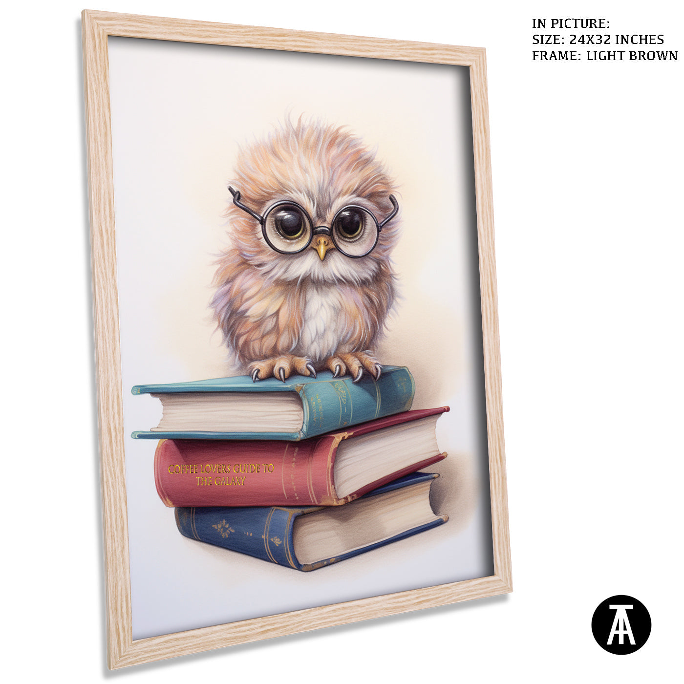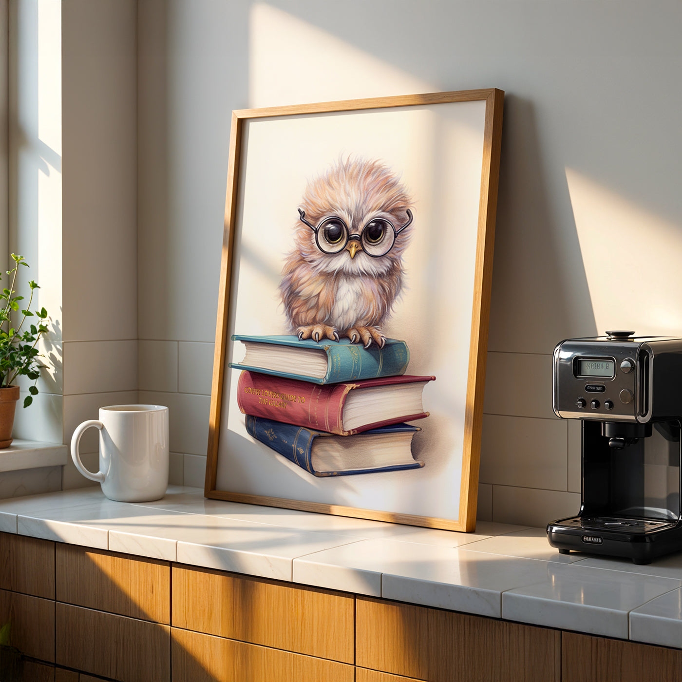 A wise choice! This whimsical artwork depicts an owl enjoying a cup of coffee in its library, creating a cozy and intellectual atmosphere for your cafe. A perfect conversation starter for bookworms and coffee lovers.