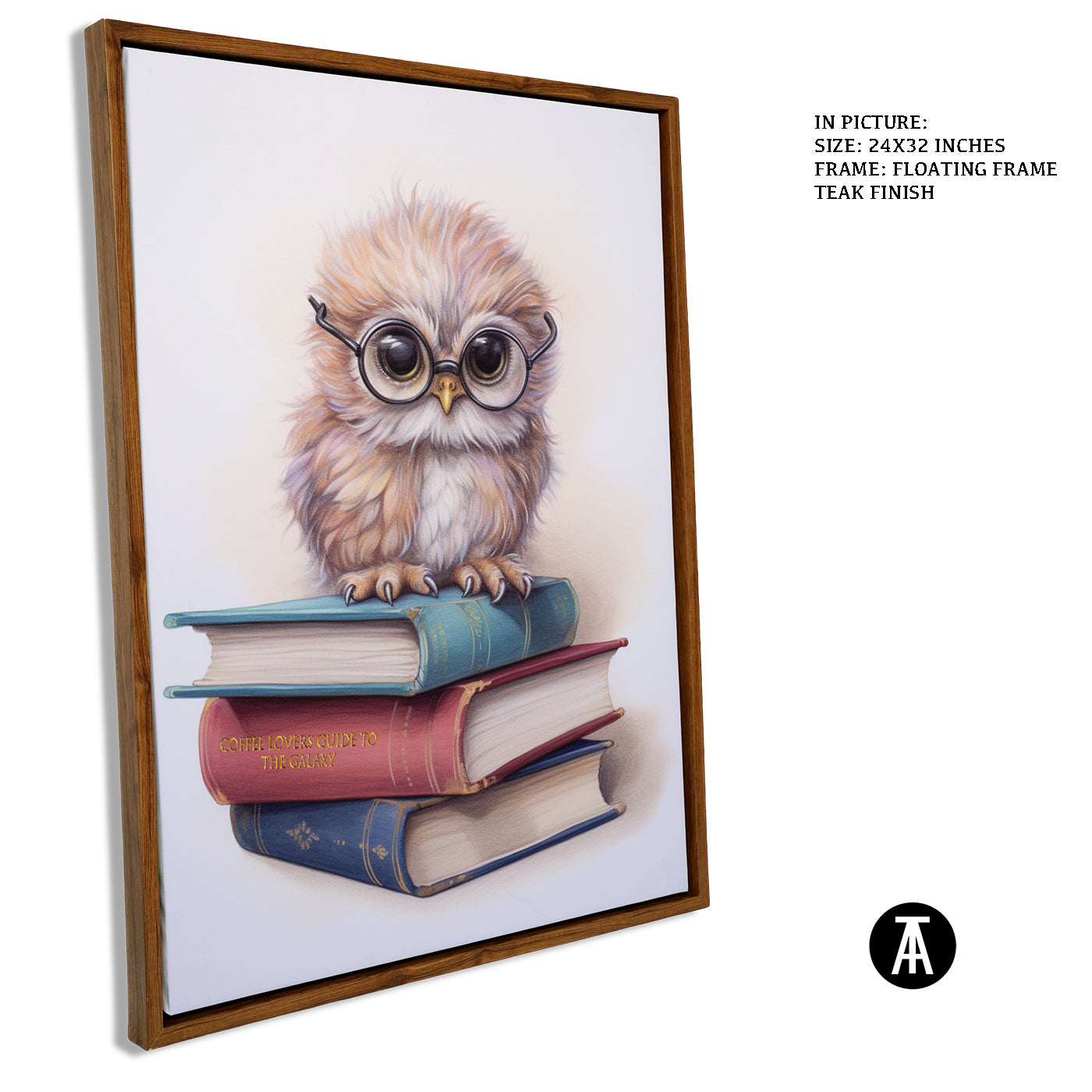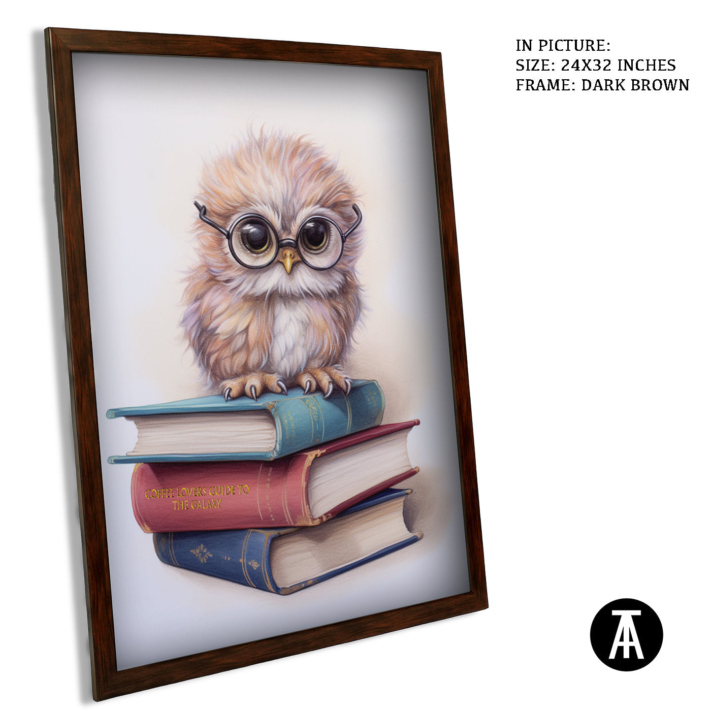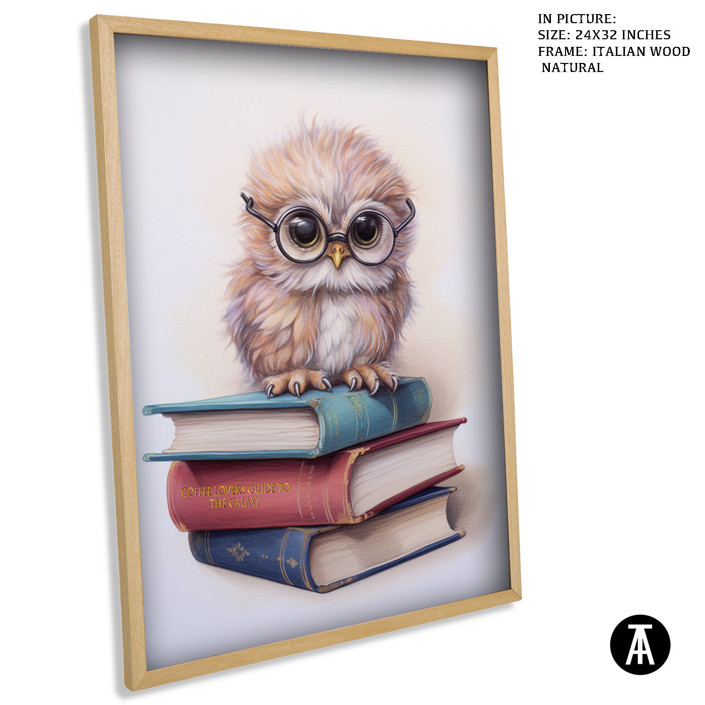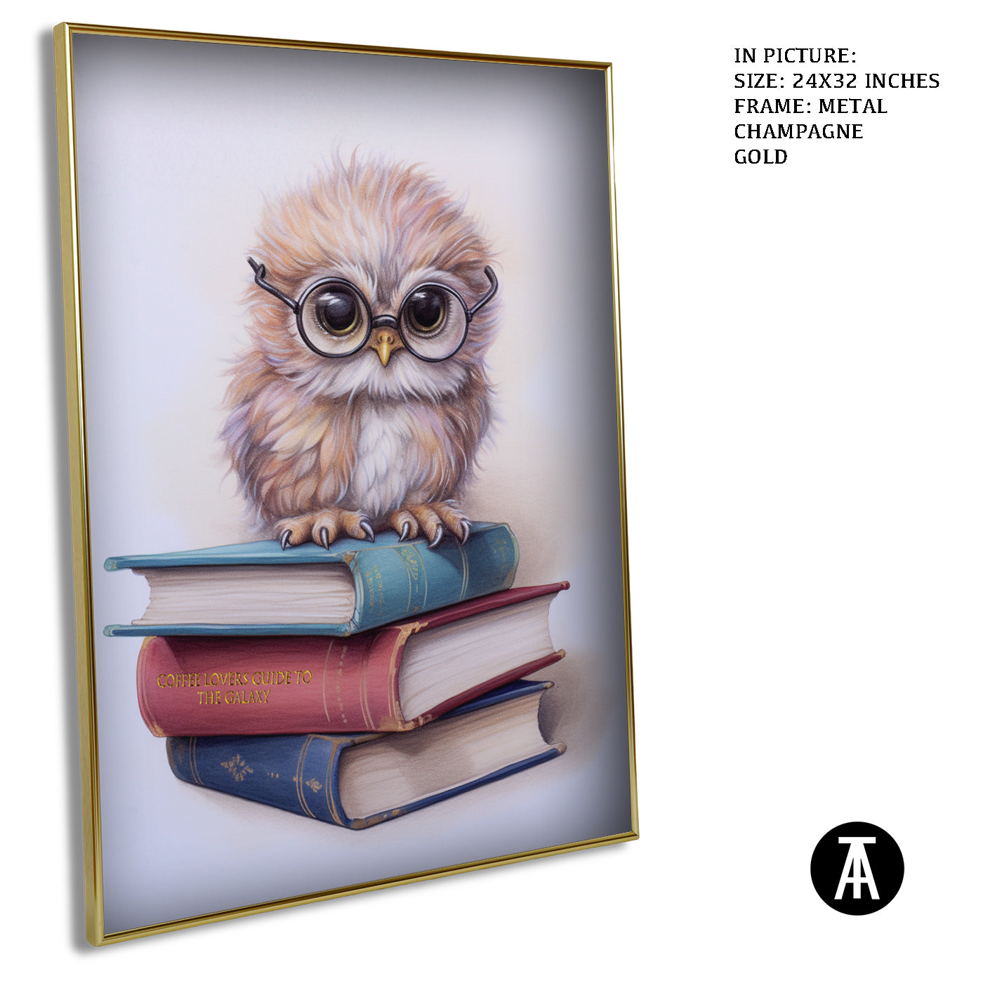 A wise choice! This whimsical artwork depicts an owl enjoying a cup of coffee in its library, creating a cozy and intellectual atmosphere for your cafe. A perfect conversation starter for bookworms and coffee lovers.