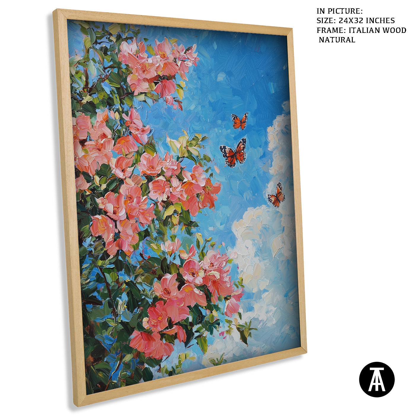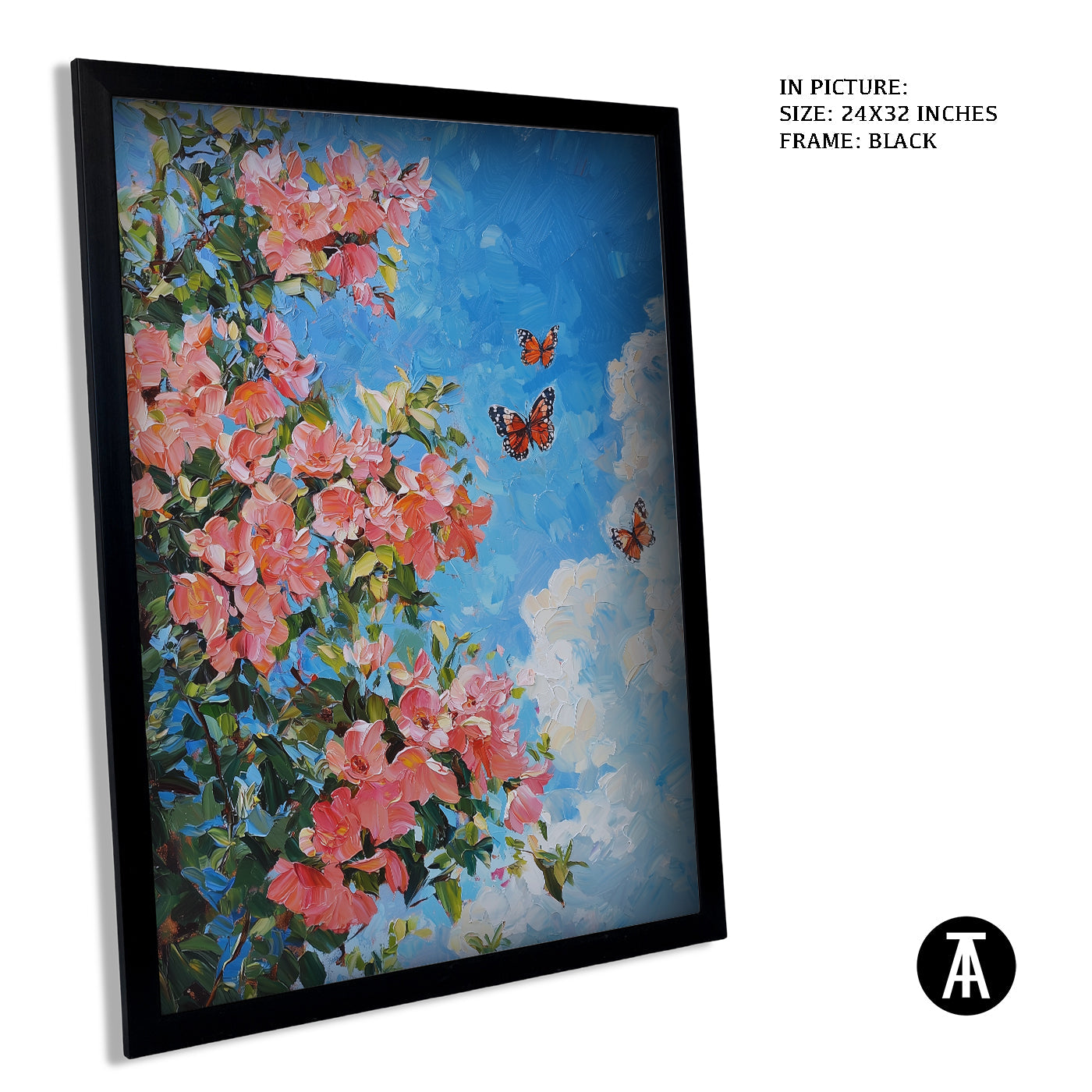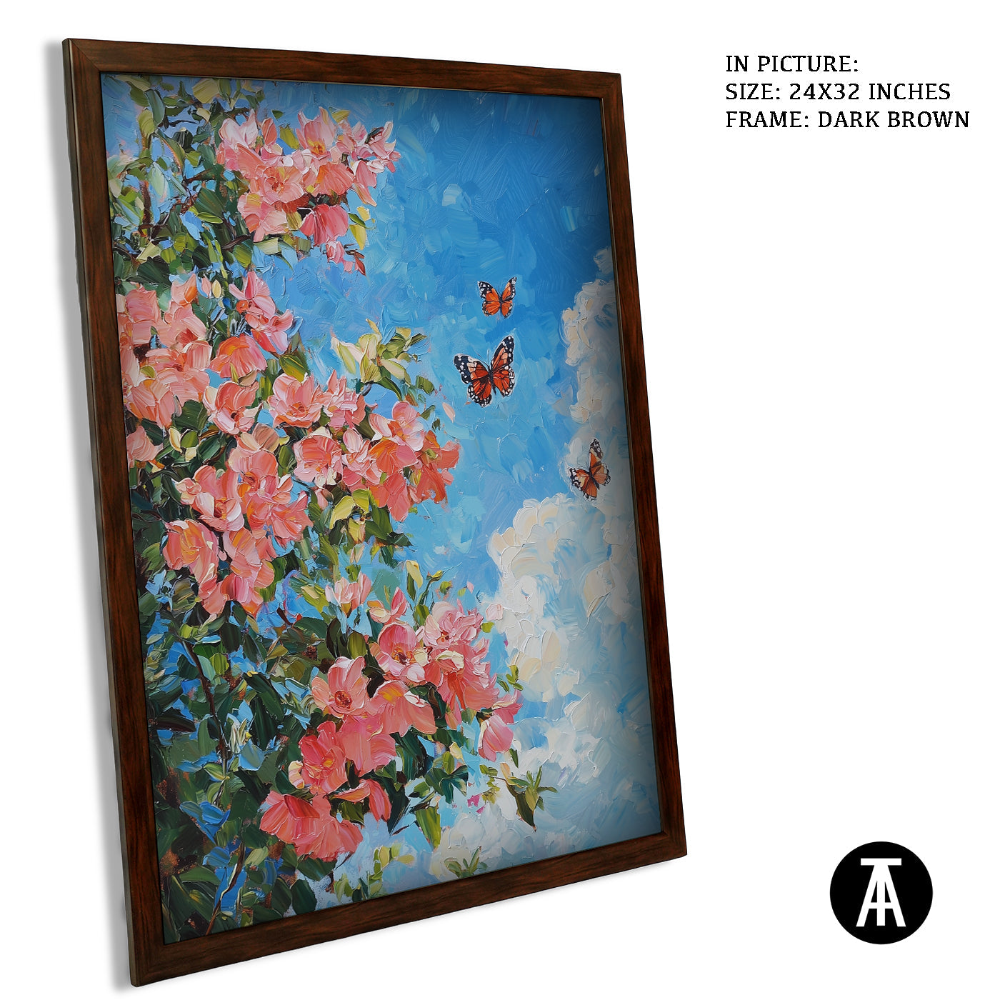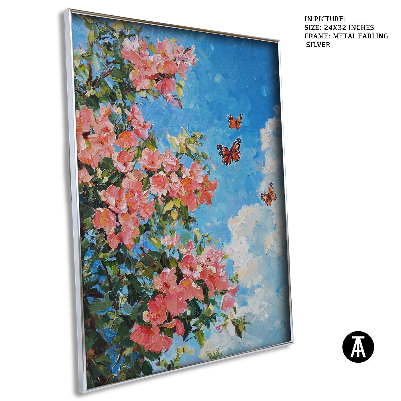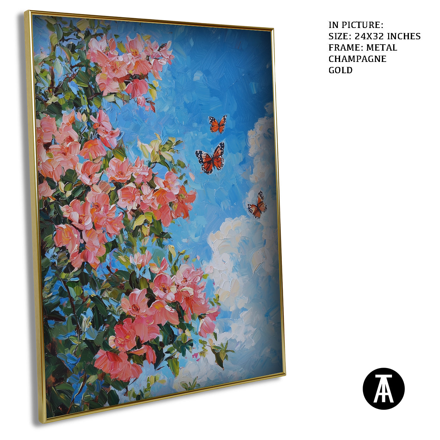 This artwork features a delightful scene of pink flowers and fluttering butterflies. The soft colors and gentle movement create a peaceful, joyful atmosphere. It’s perfect for adding a touch of nature’s beauty and charm to your space. A lovely choice for anyone who loves floral and butterfly art.