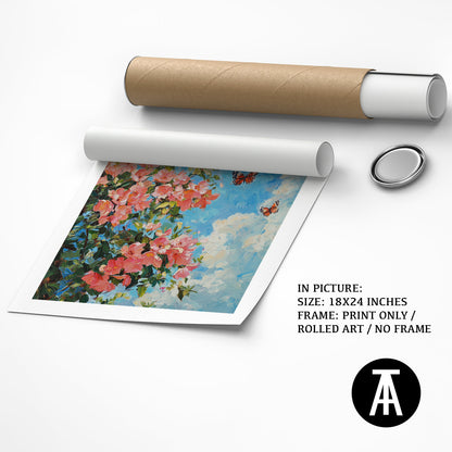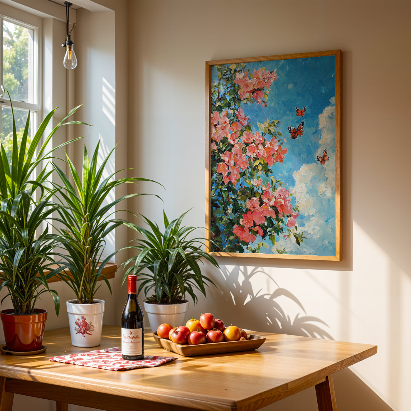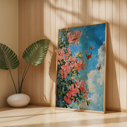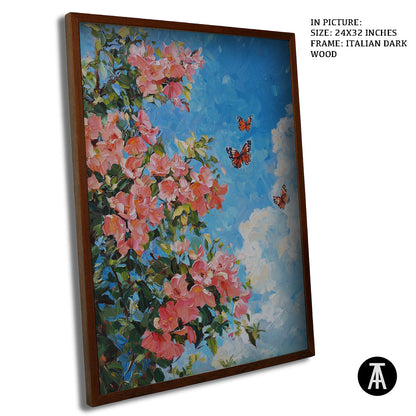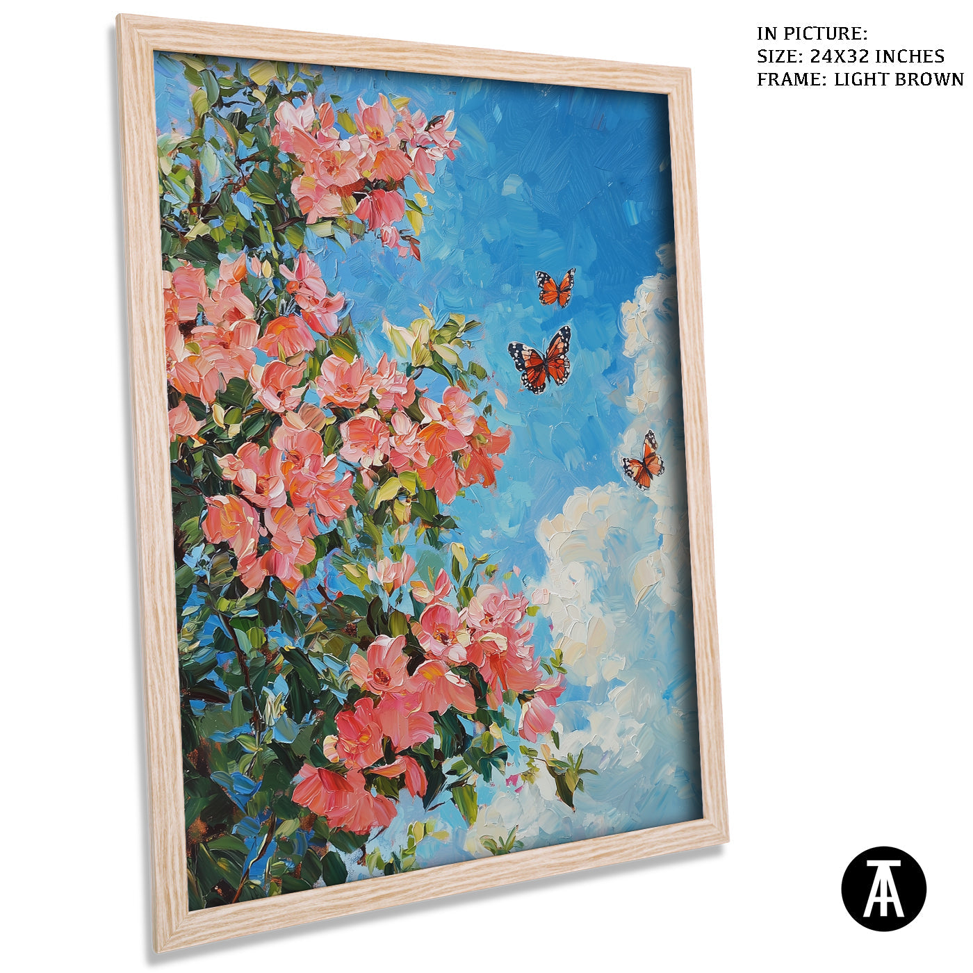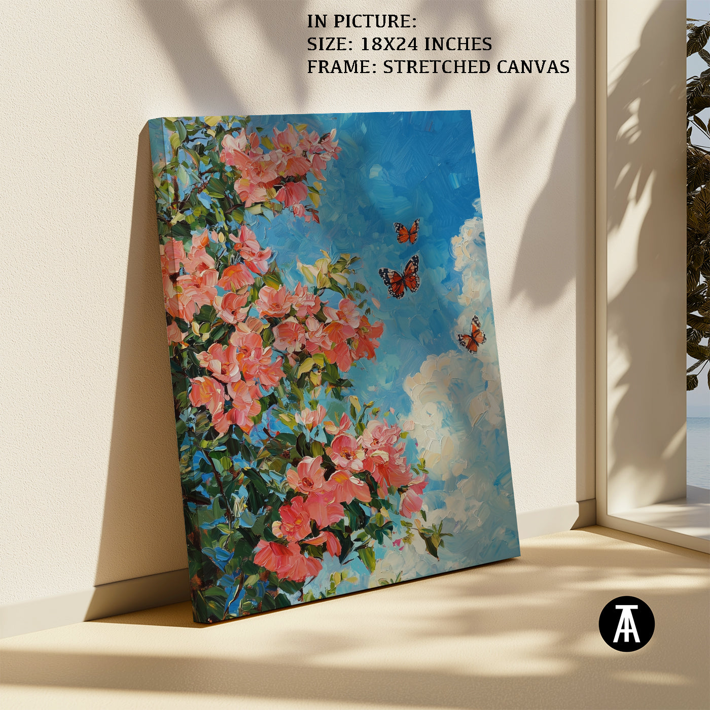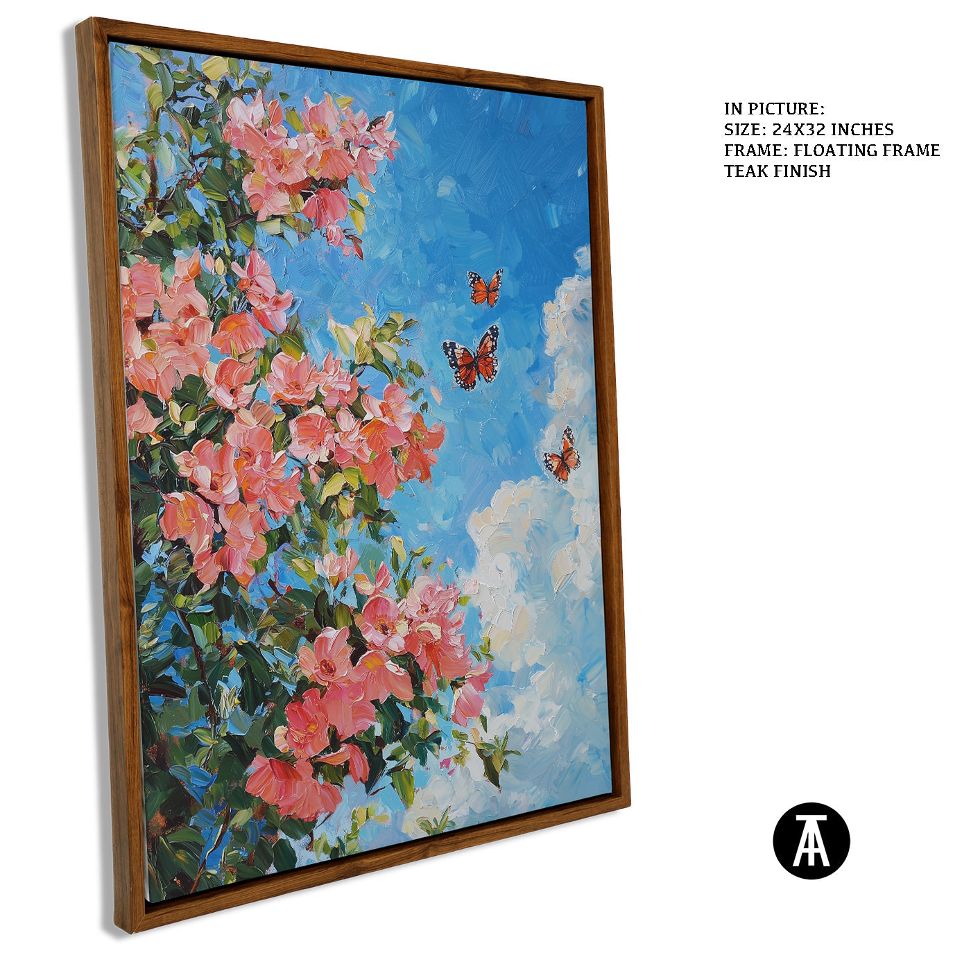 This artwork features a delightful scene of pink flowers and fluttering butterflies. The soft colors and gentle movement create a peaceful, joyful atmosphere. It’s perfect for adding a touch of nature’s beauty and charm to your space. A lovely choice for anyone who loves floral and butterfly art.