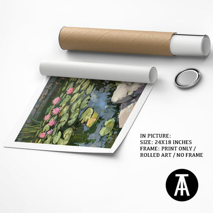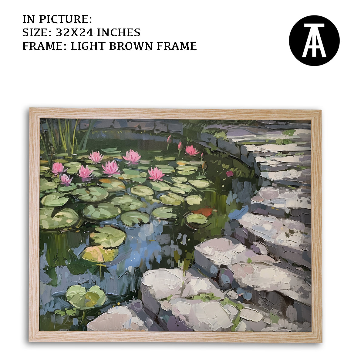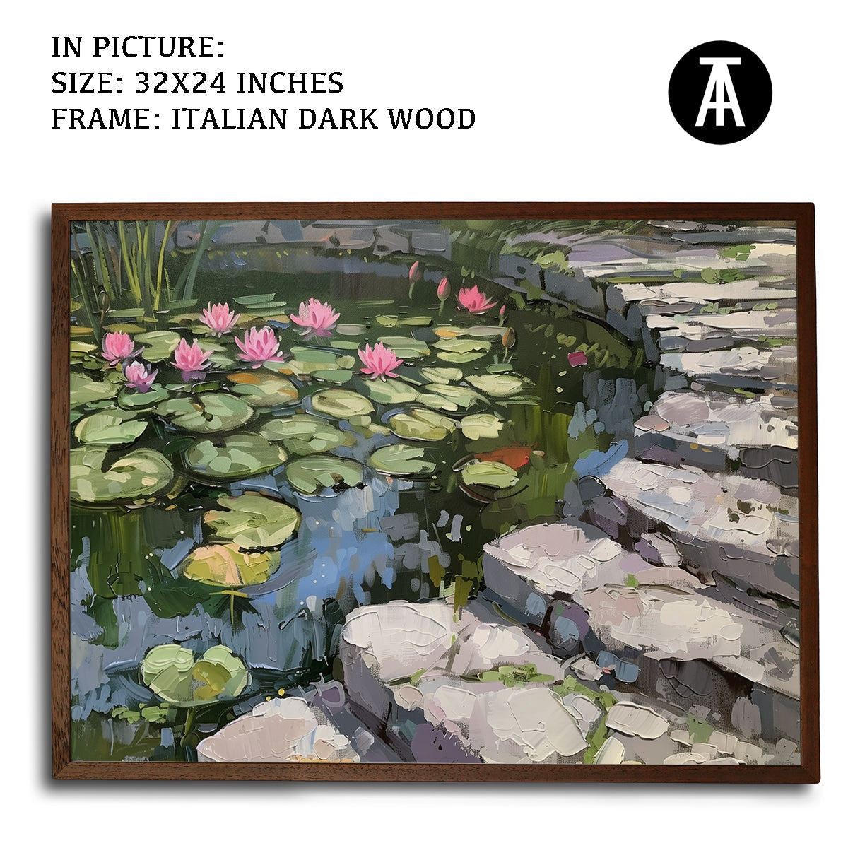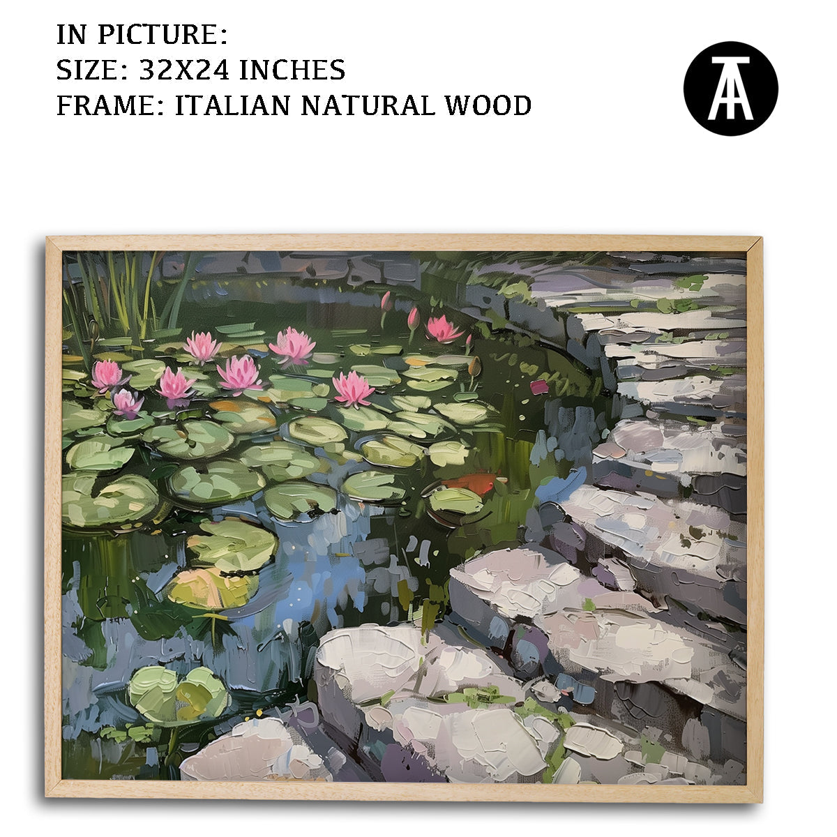 This artwork captures a peaceful pond surrounded by lush greenery. The calm water and soft reflections create a relaxing and serene scene. Perfect for adding a touch of nature to your home. A great way to enjoy the beauty of a quiet pond indoors.