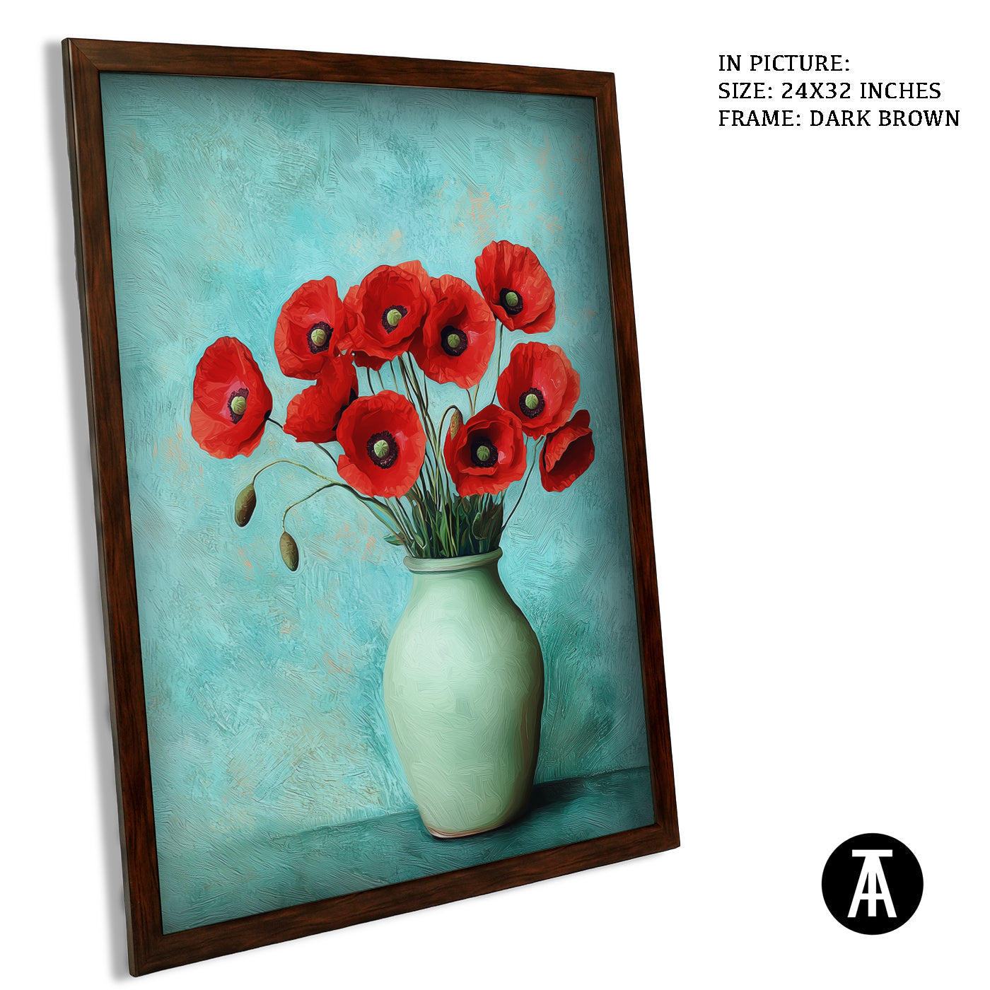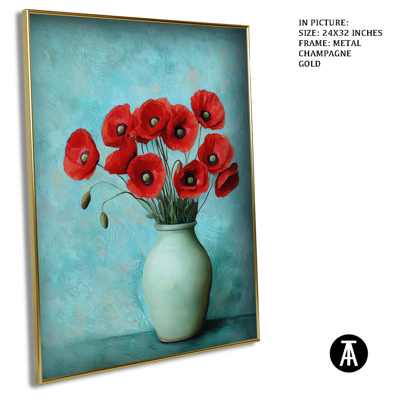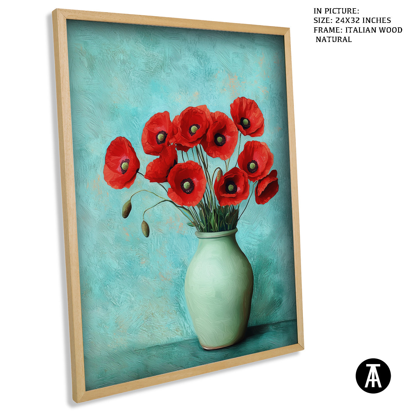 This artwork features a stunning display of bright red poppies in full bloom. The bold color and delicate petals create a lively and beautiful scene. Perfect for adding a touch of warmth and nature’s charm to your home. Enjoy the striking beauty of poppies with this lovely piece.