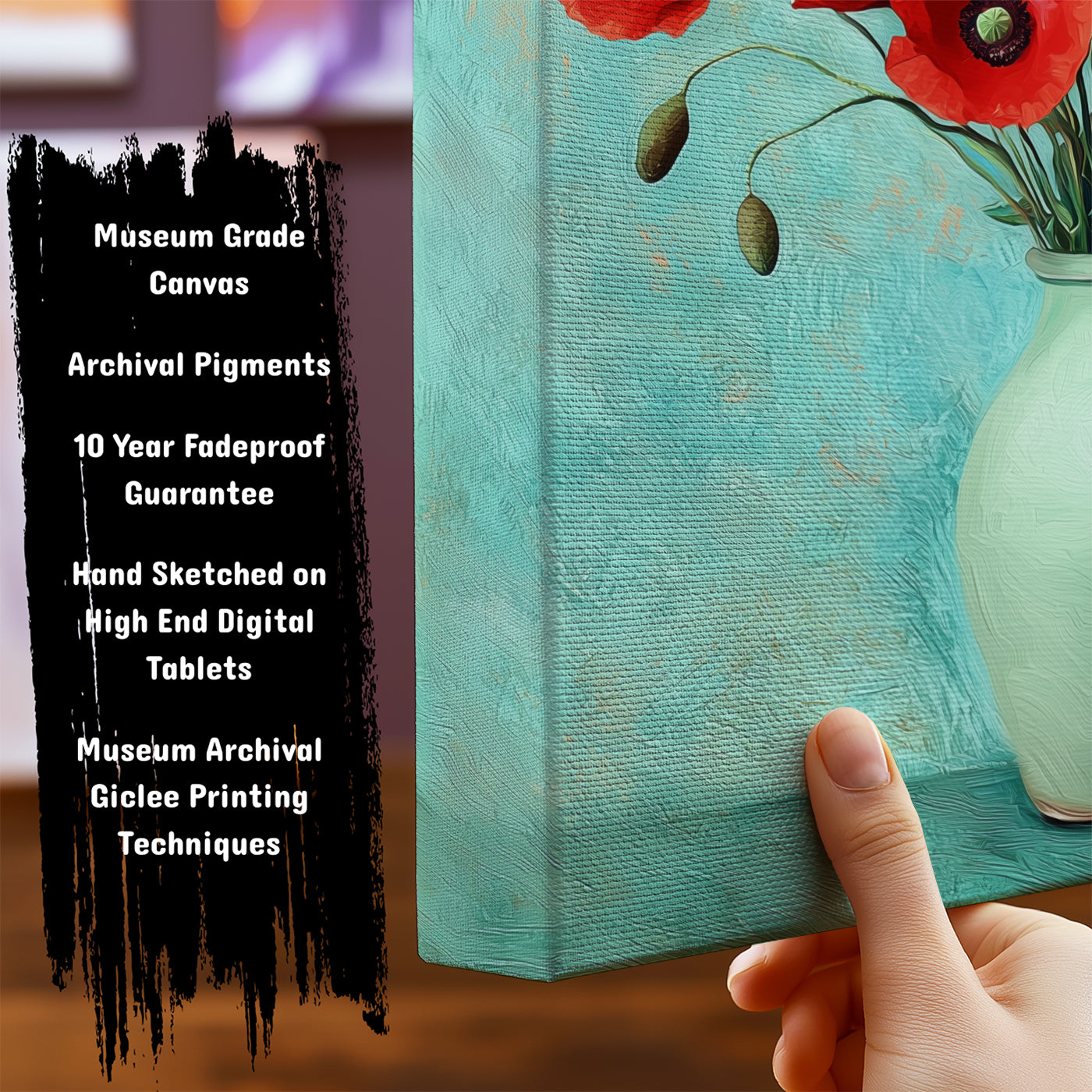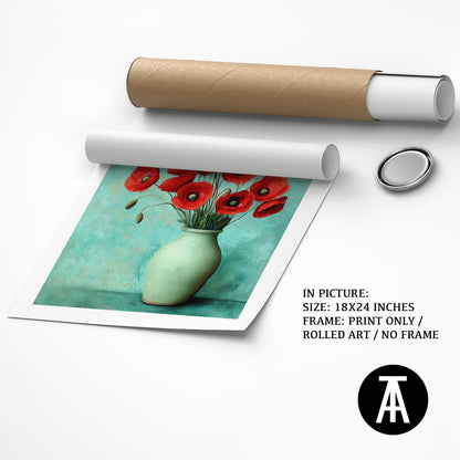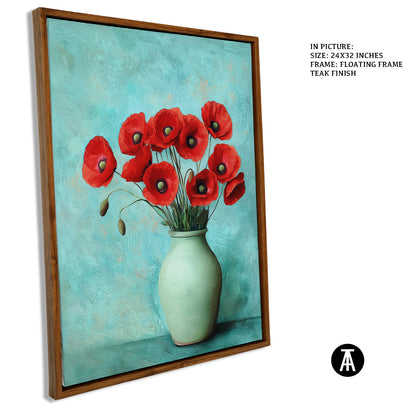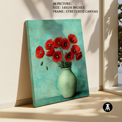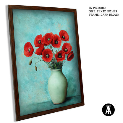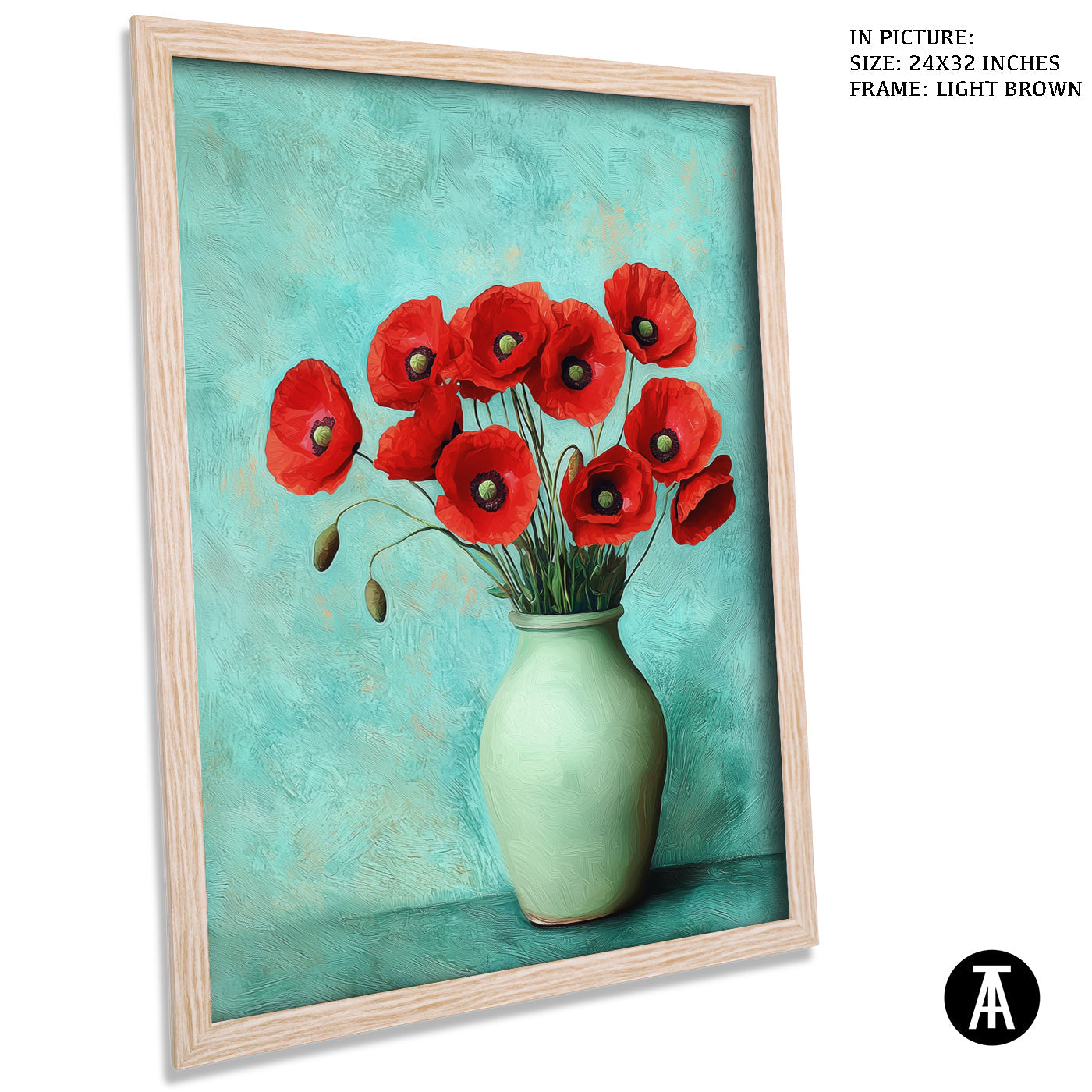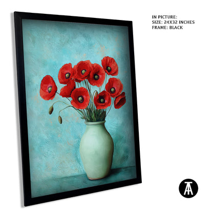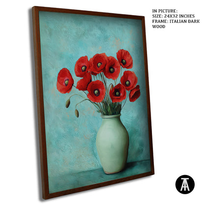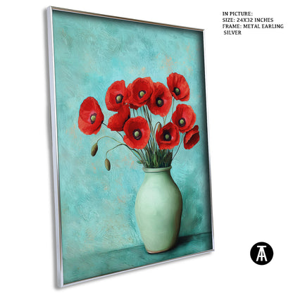 This artwork features a stunning display of bright red poppies in full bloom. The bold color and delicate petals create a lively and beautiful scene. Perfect for adding a touch of warmth and nature’s charm to your home. Enjoy the striking beauty of poppies with this lovely piece.