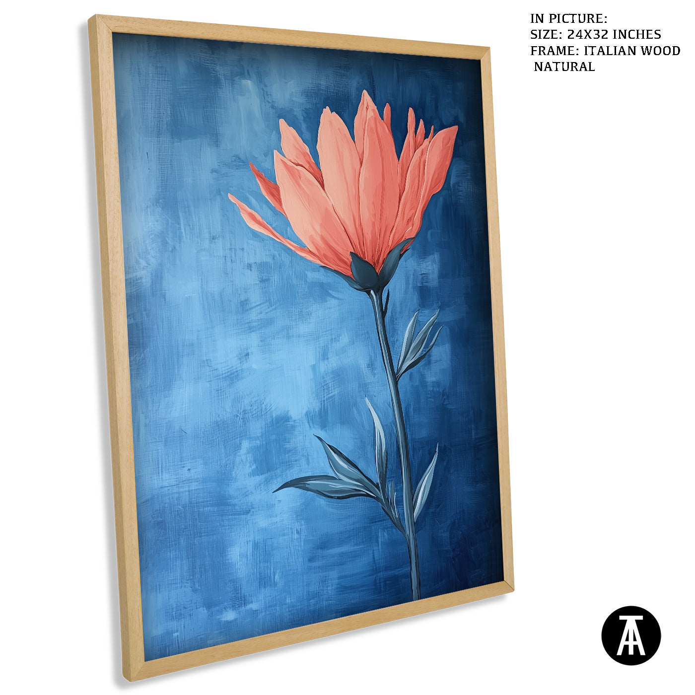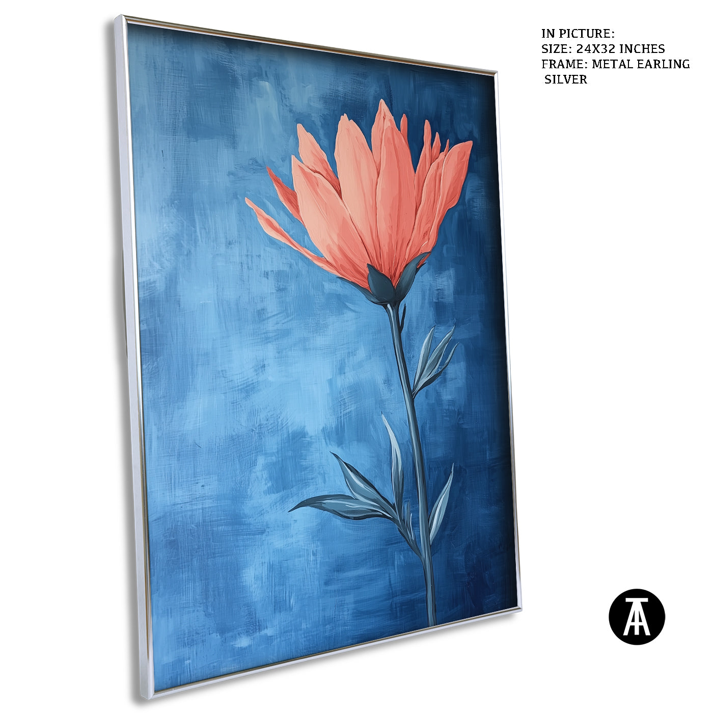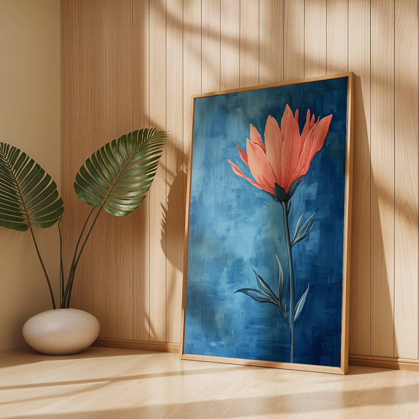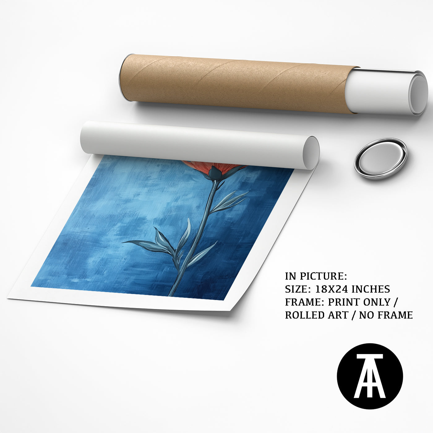 A striking ruby-red blossom stands out beautifully in this artwork. The bold color and elegant design create a captivating and eye-catching piece. Perfect for adding a touch of drama and elegance to your space. A lovely choice for those who love bold, floral art.