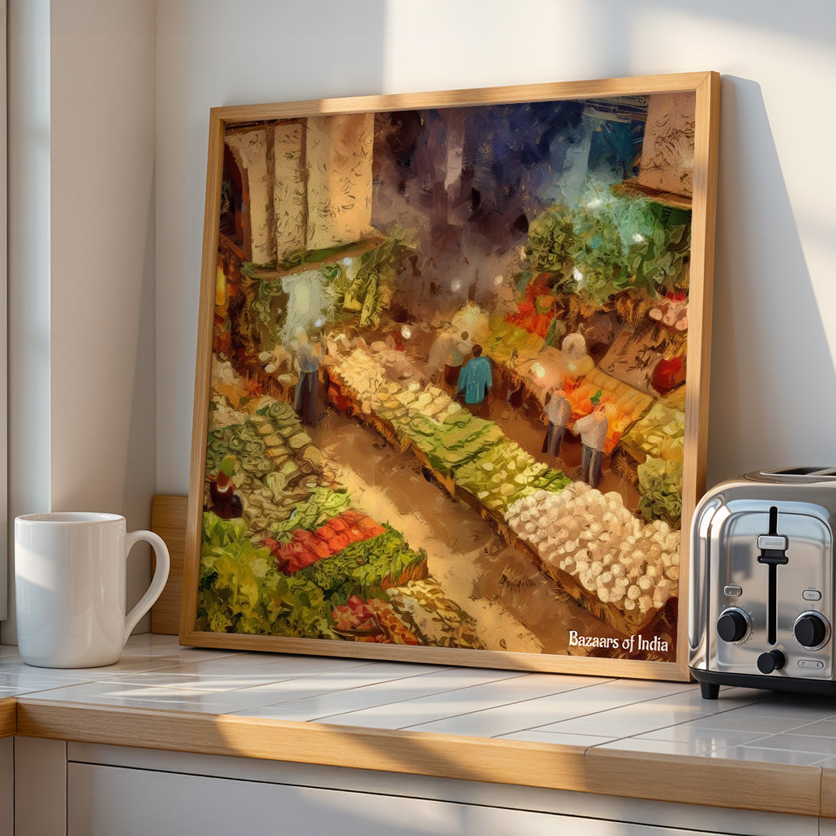 Step into the vibrant chaos of Old Delhi's 'Sabji Mandi' with our captivating art piece titled 'Sabji Mandi'. This artwork beautifully captures the bustling energy and kaleidoscope of colors found in the vegetable market. From the vibrant produce to the animated conversations, every detail brings the spirit of this lively marketplace to life. Immerse yourself in the essence of Old Delhi, adding a touch of cultural richness and urban charm to your space.