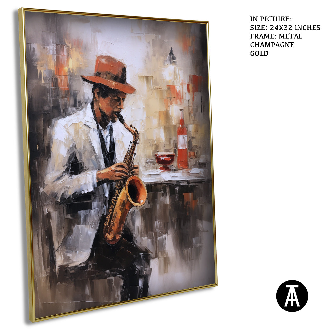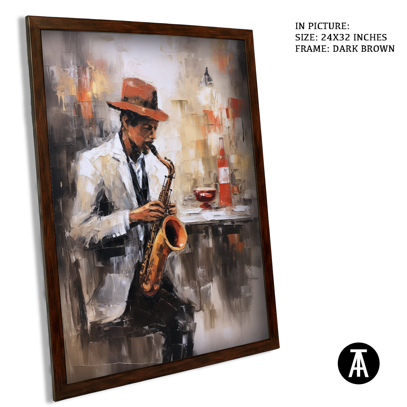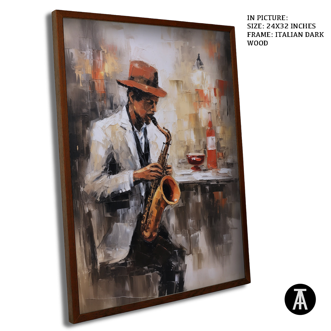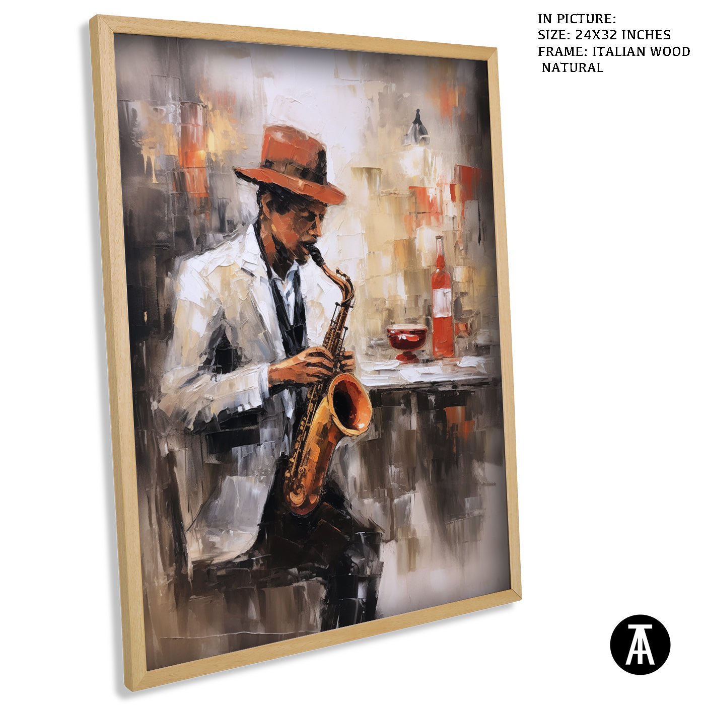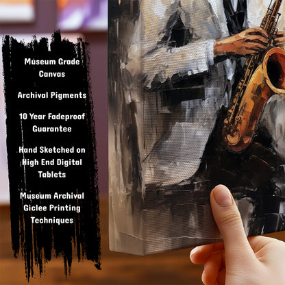 Live music and coffee! This evocative artwork features a saxophone player in a jazz club, capturing the energy and sophistication of live music cafes.