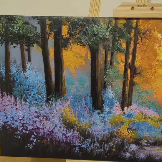A glowing woodland path framed by tall trees and wild blooms—dreamy, hopeful, and immersive. The golden light at the horizon adds depth and warmth, creating a morning walk calm for the mind. Perfect for living rooms, meditation corners, bedrooms, and nature-forward decor themes.