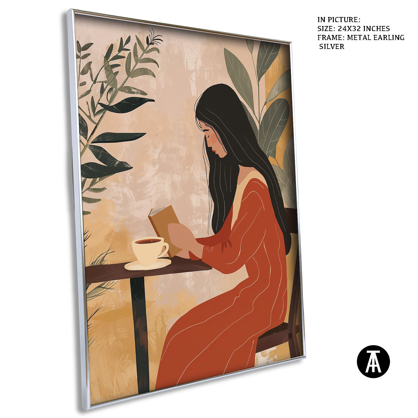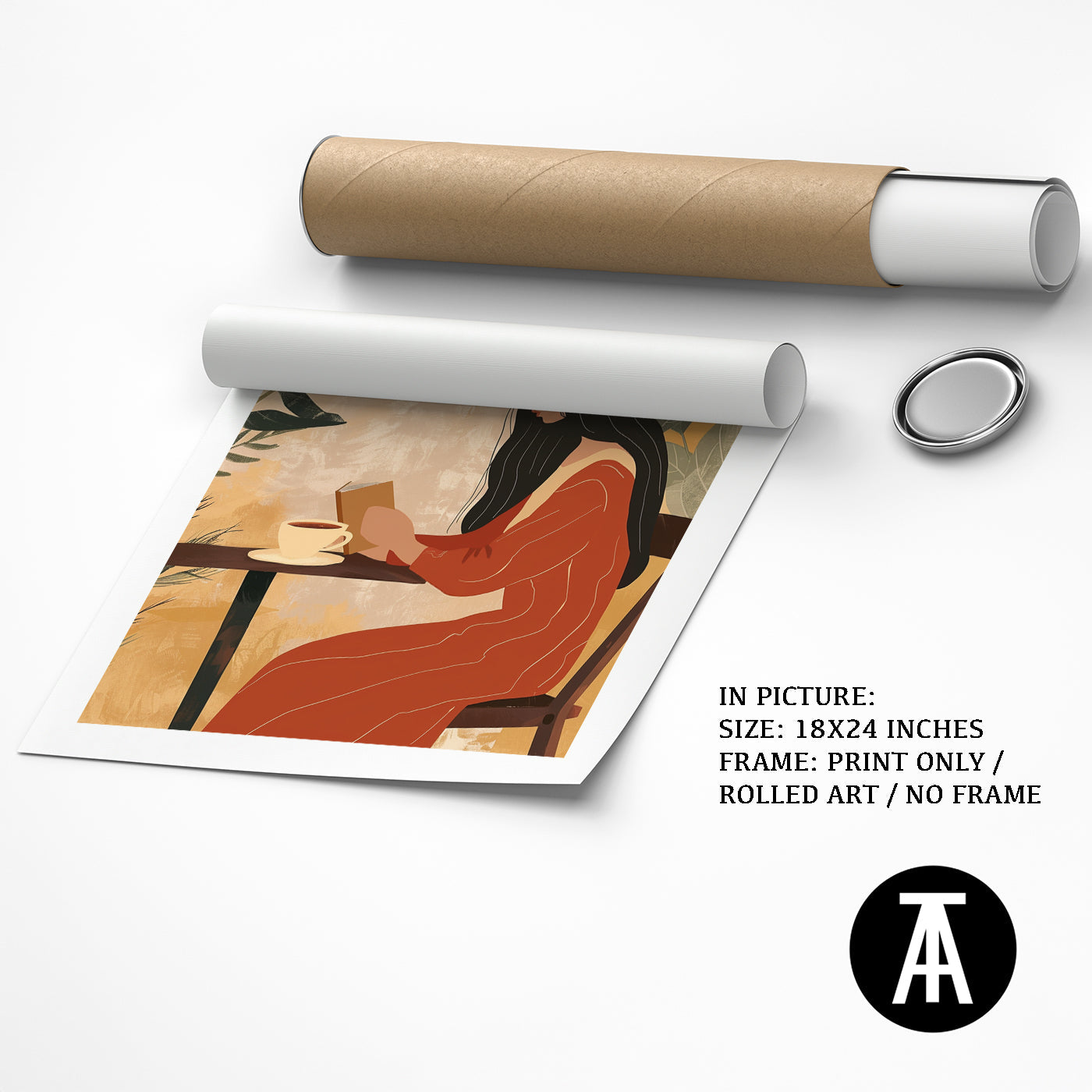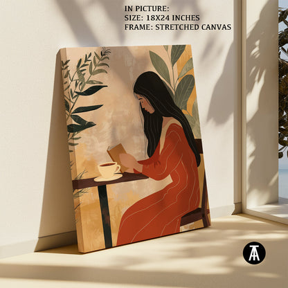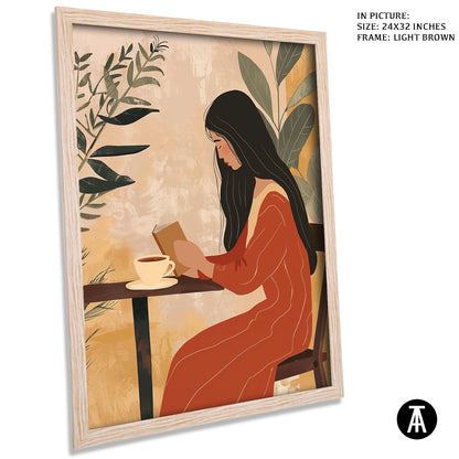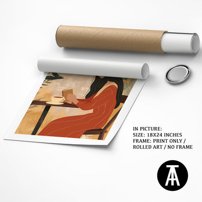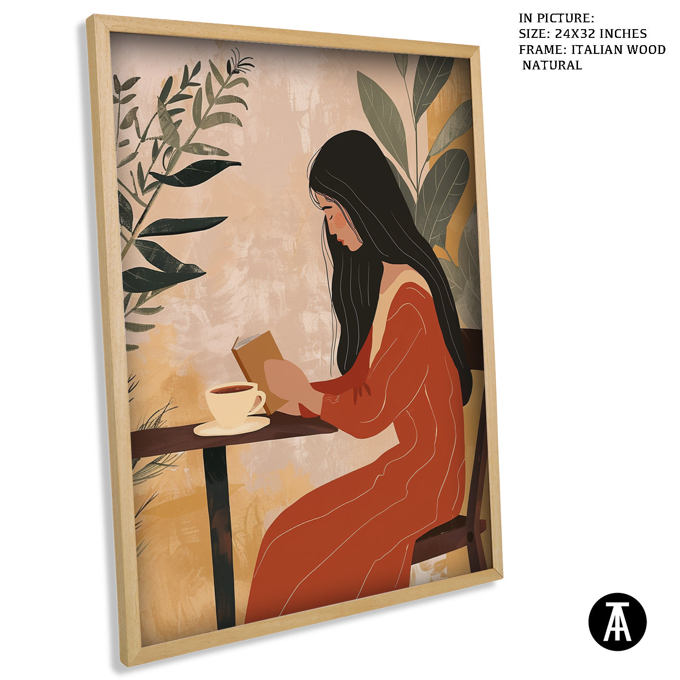 A cozy escape! This boho-style artwork depicts a reading nook with a cup of coffee, creating a warm and inviting atmosphere for bookworms and coffee lovers alike.