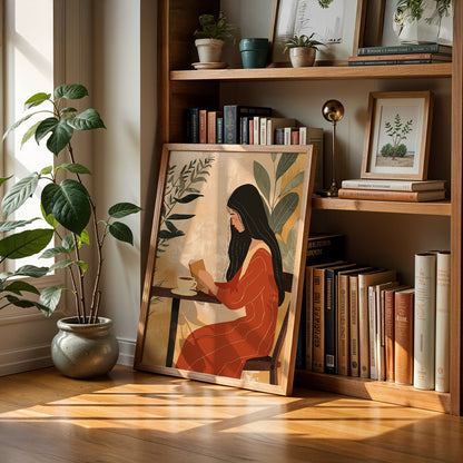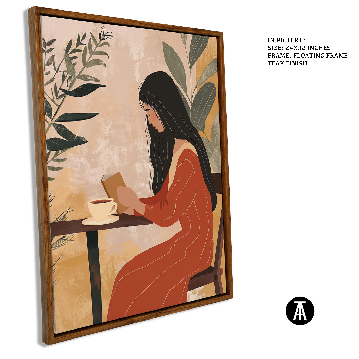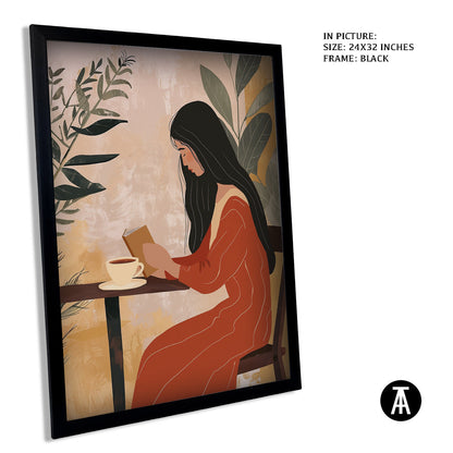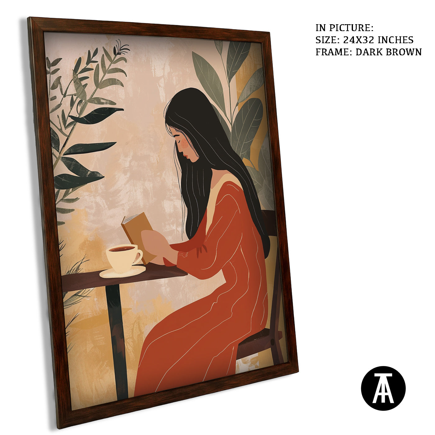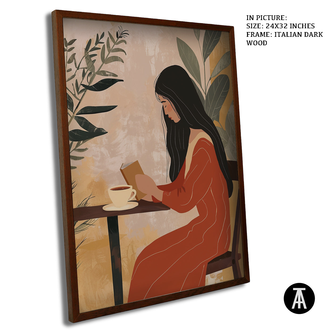 A cozy escape! This boho-style artwork depicts a reading nook with a cup of coffee, creating a warm and inviting atmosphere for bookworms and coffee lovers alike.