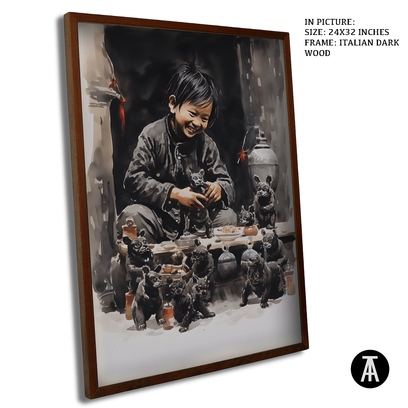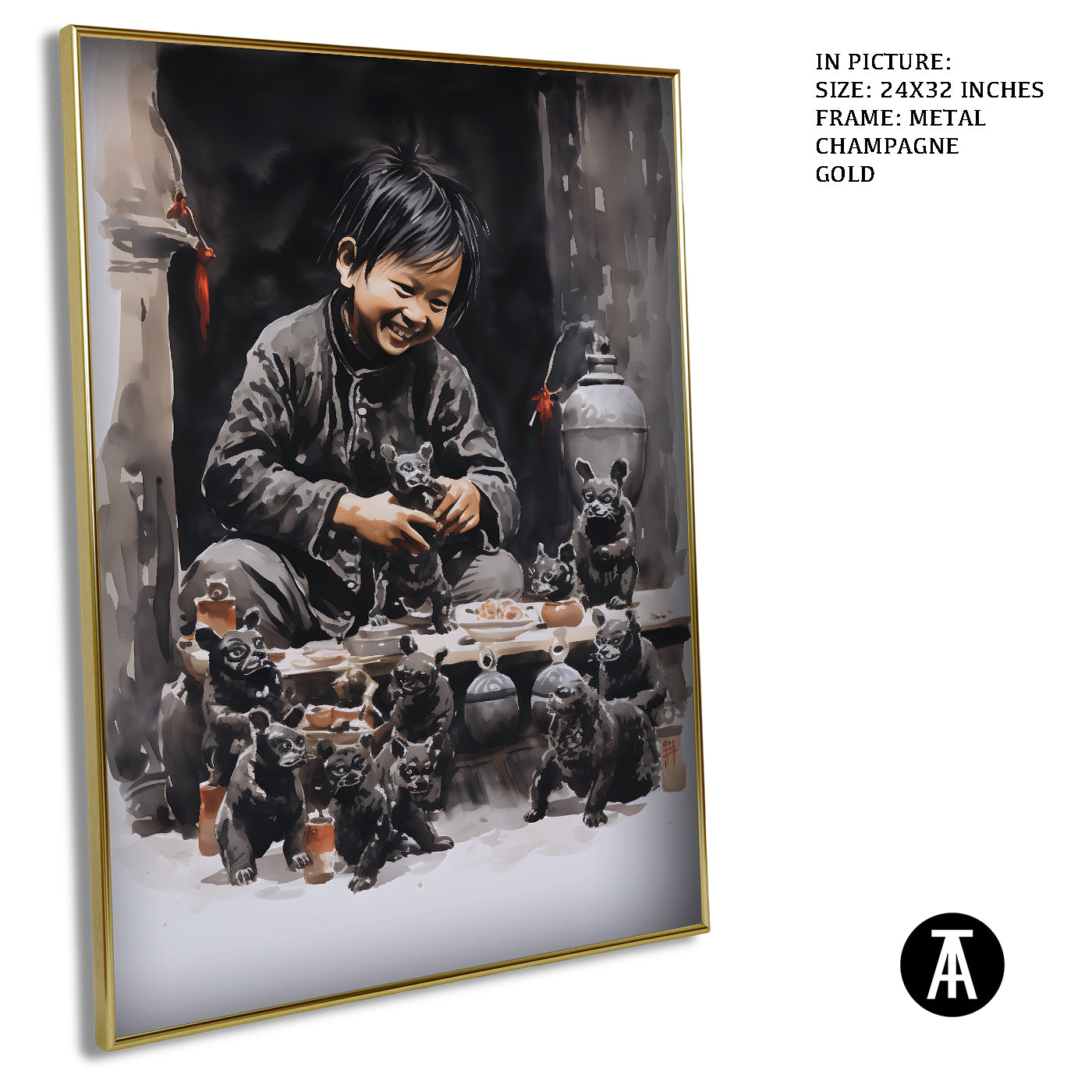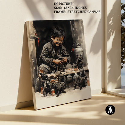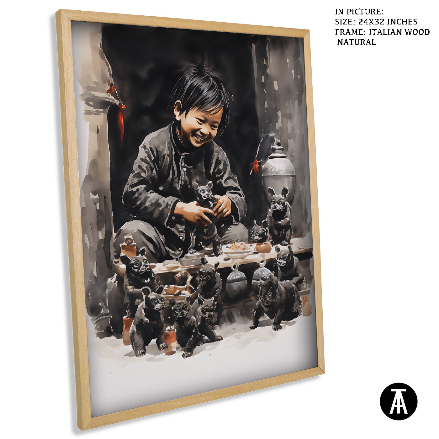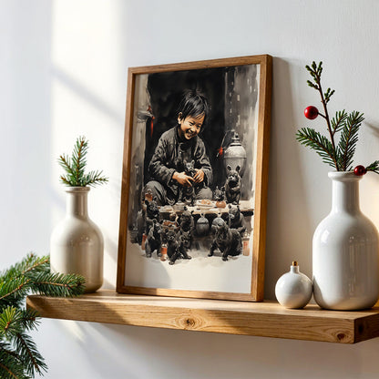 Immerse yourself in the wonder of Vietnamese craftsmanship with "The Toy Maker's Child," a delightful watercolor painting portraying a child joyfully playing with freshly made lacquer toys. This artwork captures the innocence and cultural significance of traditional Vietnamese toys, making it a cherished addition to any travel-inspired art collection. Celebrate the joys of childhood and Vietnamese heritage with this heartwarming piece.