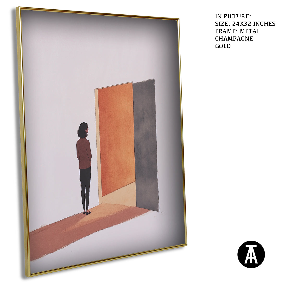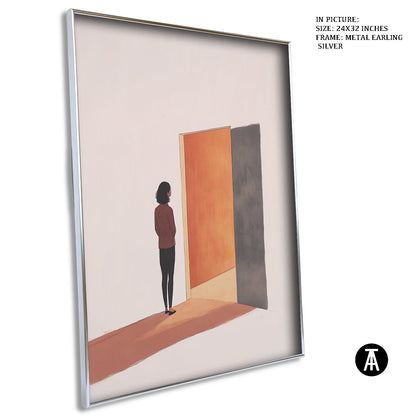 This minimalist piece captures a lady about to walk through a door with pure, flowing lines. Emphasizing the beauty of everyday life, it draws from Scandinavian simplicity. It evokes a sense of quiet joy, nostalgia, and mindfulness. Ideal for adding a calming and elegant touch to living rooms, studios, or cozy nooks.