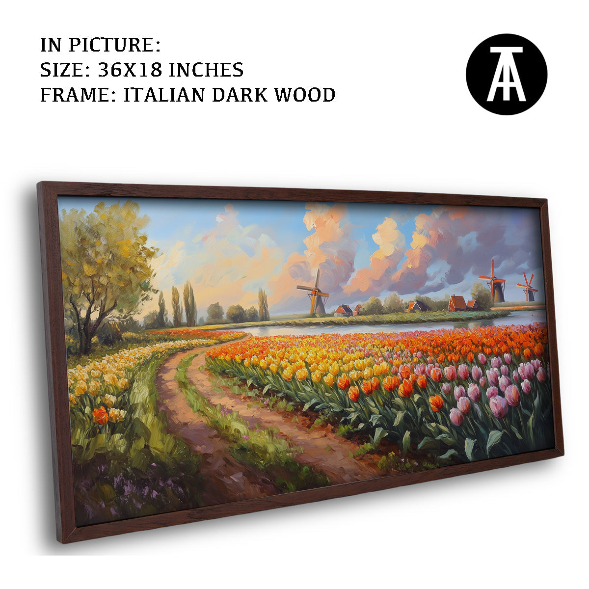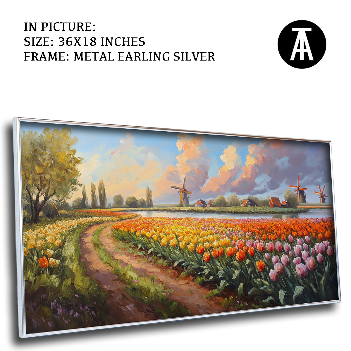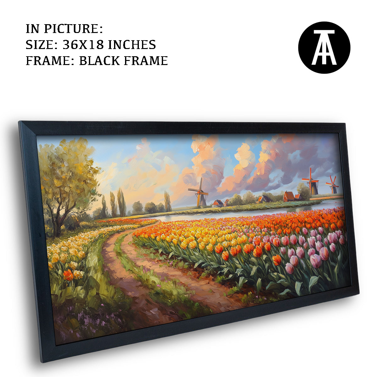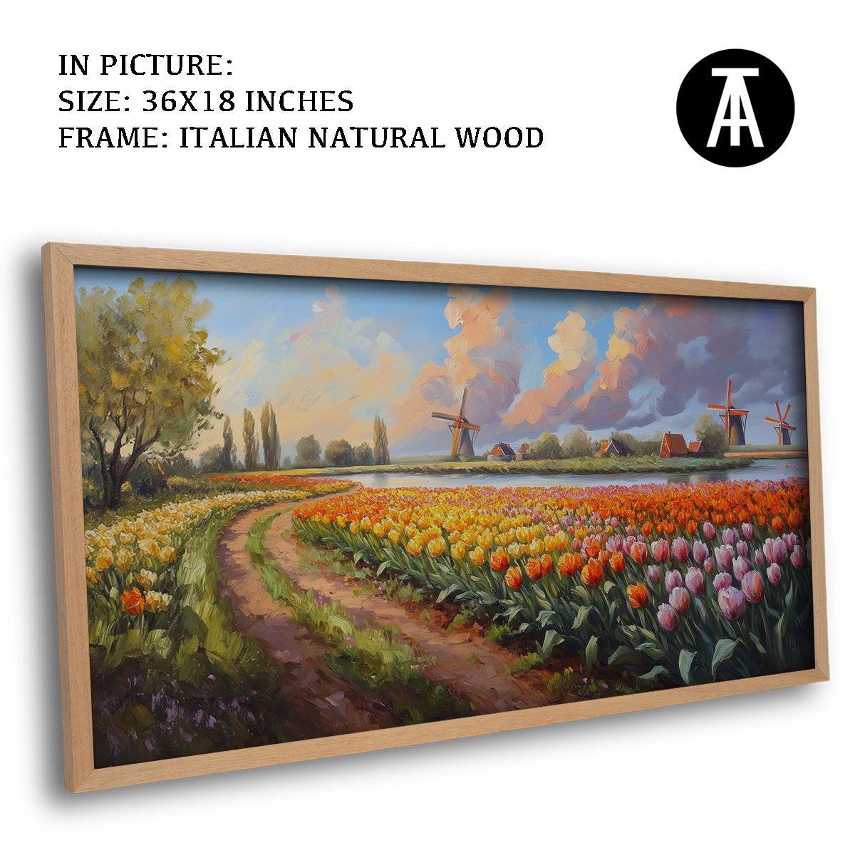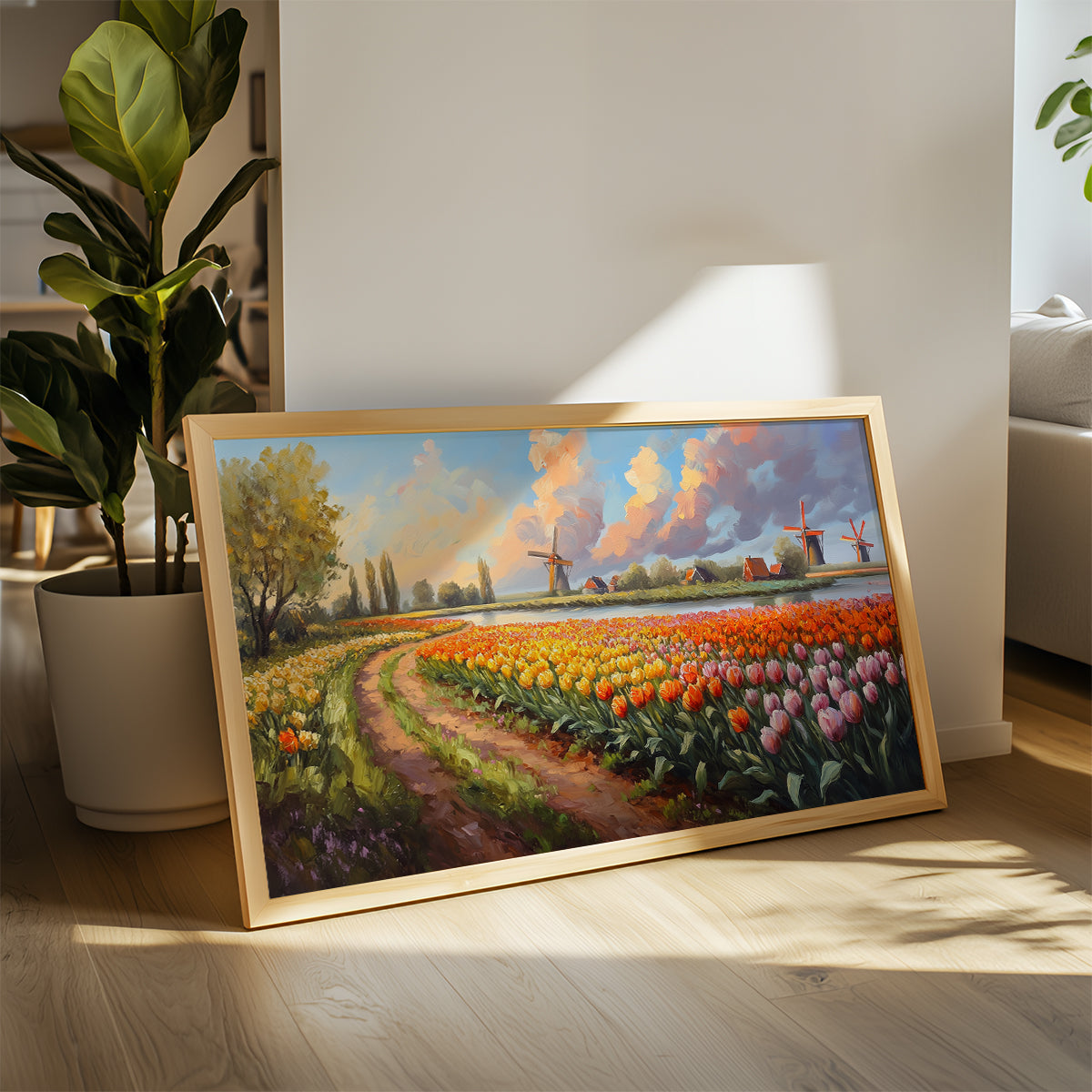 A beautiful bunch of tulips, inspired by the famous fields of Amsterdam, fills this artwork with color and life. The bright petals and lush green leaves create a cheerful, vibrant scene. Perfect for bringing a touch of spring and joy to your home. A delightful piece for tulip lovers.